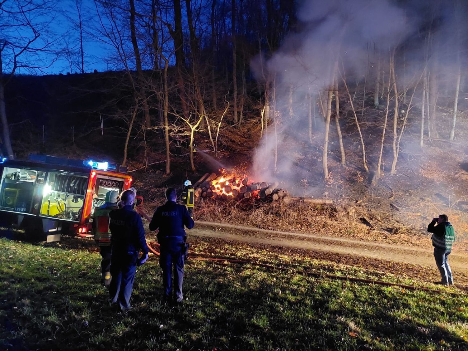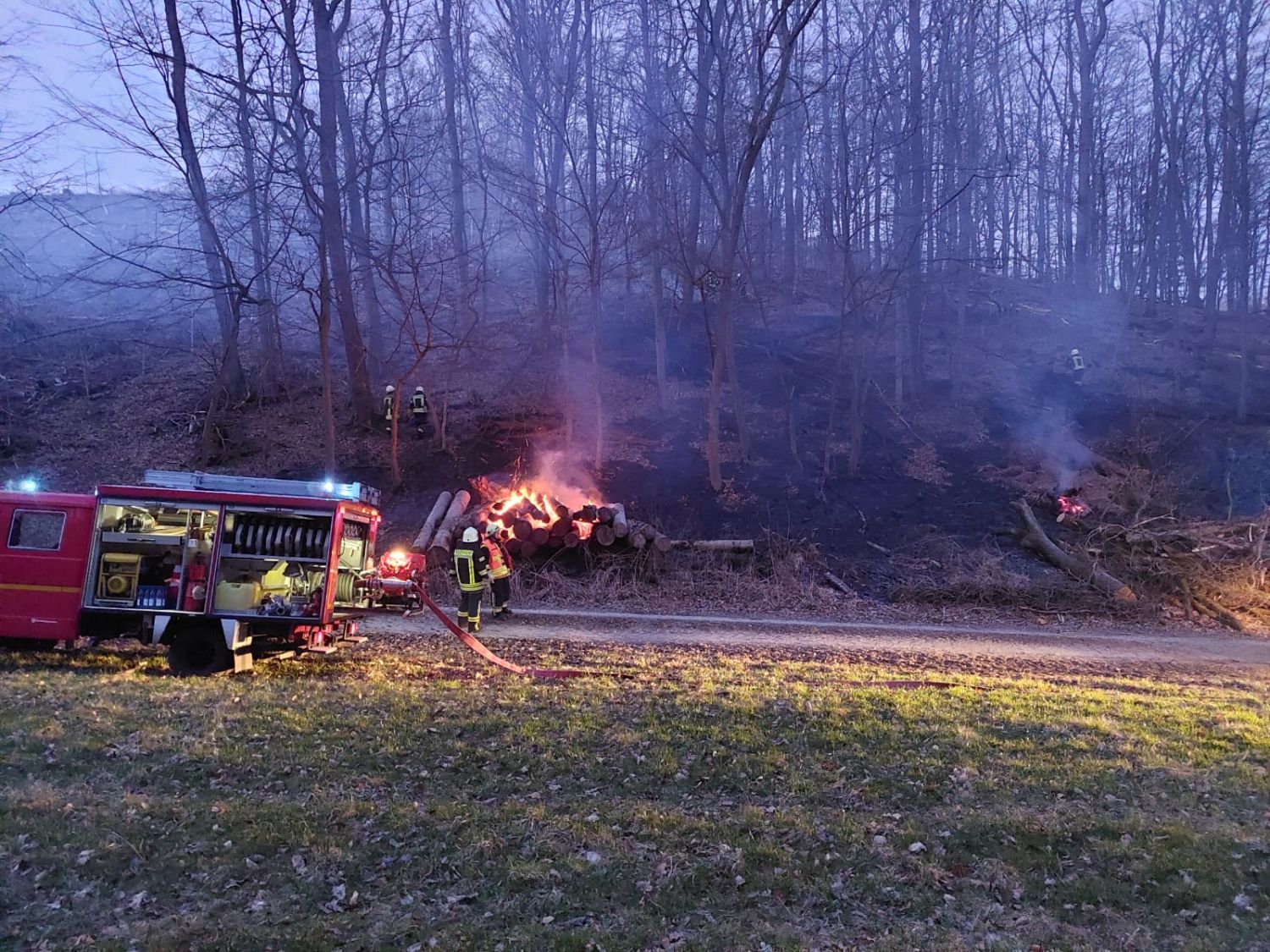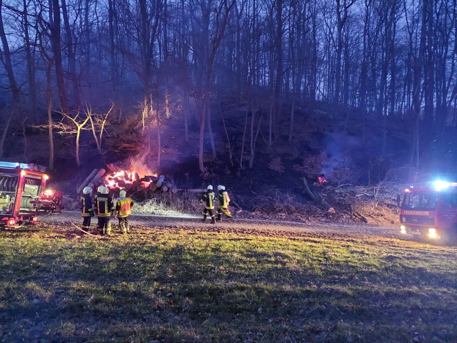 Hessisch Lichtenau – Am Sonntagabend sind mehrere Einsatzkräfte der Feuerwehren aus Hessisch Lichtenau und Umgebung zu einem Brand ausgerückt, der von Zeugen um kurz vor 20.00 Uhr in einem Waldstück entlang der Landesstraße L 3249 zwischen Küchen und Hausen gemeldet worden war. Vor Ort stellte sich heraus, dass sich ein dort befindlicher, ca. 4 Meter langer, Holzstapel mit rund 30 Baumstämmen entzündet hatte. Durch Funkenflug wurde auch eine größere Fläche Unterholz in Brand gesetzt. Die Feuerwehren aus Velmeden und der Kernstadt wurden mit wasserführenden Fahrzeugen nachalarmiert und richteten einen Pendelverkehr ein, um Wasser zur Brandstelle zu transportieren. Ein Küchener Landwirt kam den Feuerwehren zu Hilfe und zog die Baumstämme mit einem Schlepper auseinander. Letztlich war eine Gesamtfläche von ca. 40 m² von dem Brand betroffen, der um kurz vor 21.00 Uhr dann gänzlich abgelöscht werden konnte. Der entstandene Schaden wird auf 6000 Euro beziffert. Laut den Einsatzkräften der Feuerwehr könnte als Brandursache sowohl eine Selbstentzündung in Betracht kommen, als auch eine Brandlegung durch Unbekannte.