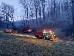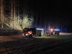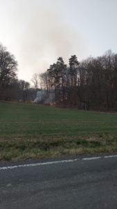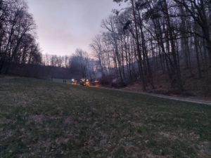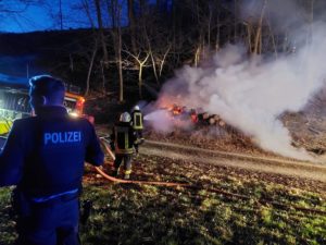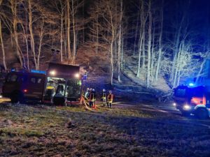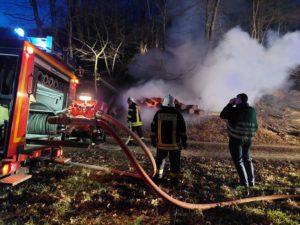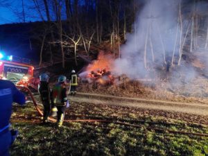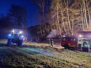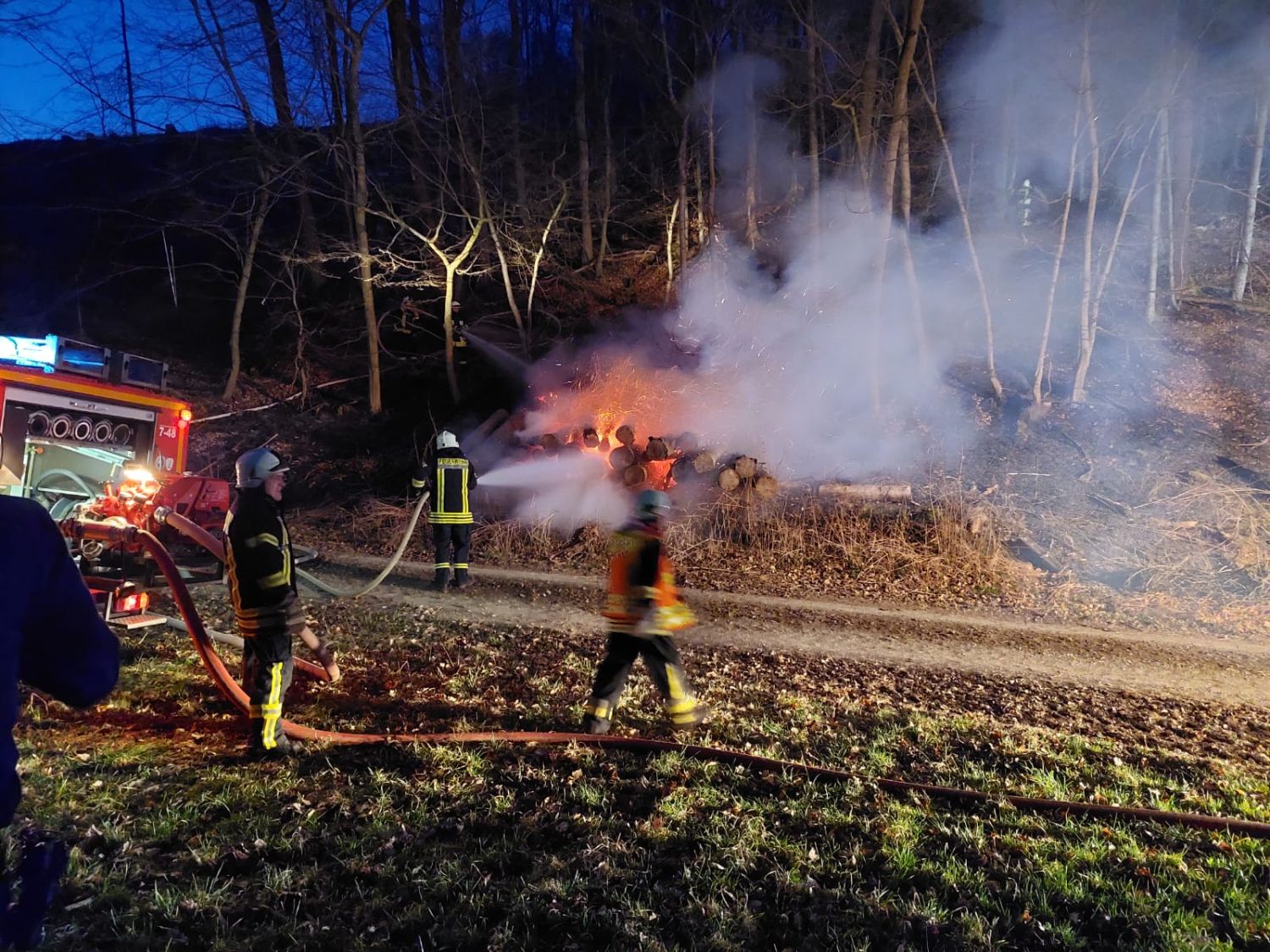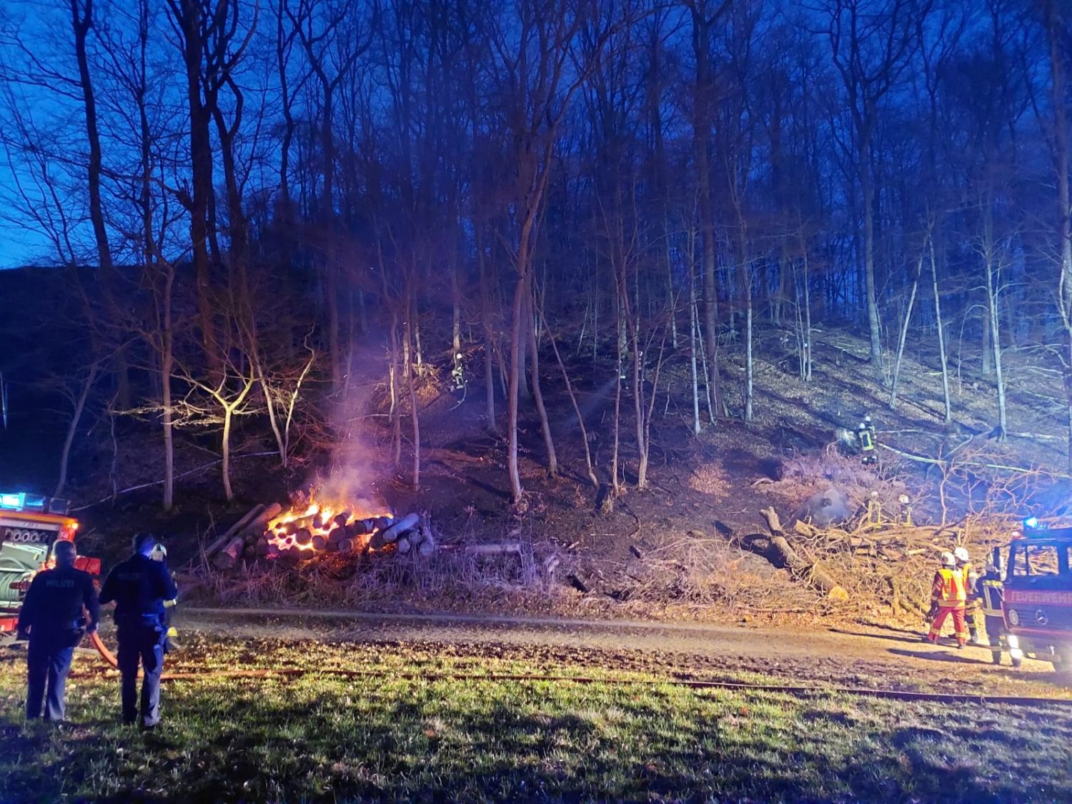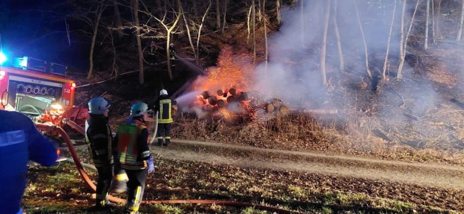 Hessisch Lichtenau – Am Sonntagabend sind mehrere Einsatzkräfte der Feuerwehren aus Hessisch Lichtenau und Umgebung zu einem Brand ausgerückt, der von Zeugen um kurz vor 20.00 Uhr in einem Waldstück entlang der Landesstraße L 3249 zwischen Küchen und Hausen gemeldet worden war. Vor Ort stellte sich heraus, dass sich ein dort befindlicher, ca. 4 Meter langer, Holzstapel mit rund 30 Baumstämmen entzündet hatte. Durch Funkenflug wurde auch eine größere Fläche Unterholz in Brand gesetzt. Die Feuerwehren aus Velmeden und der Kernstadt wurden mit wasserführenden Fahrzeugen nachalarmiert und richteten einen Pendelverkehr ein, um Wasser zur Brandstelle zu transportieren. Ein Küchener Landwirt kam den Feuerwehren zu Hilfe und zog die Baumstämme mit einem Schlepper auseinander. Letztlich war eine Gesamtfläche von ca. 40 m² von dem Brand betroffen, der um kurz vor 21.00 Uhr dann gänzlich abgelöscht werden konnte. Der entstandene Schaden wird auf 6000 Euro beziffert. Laut den Einsatzkräften der Feuerwehr könnte als Brandursache sowohl eine Selbstentzündung in Betracht kommen, als auch eine Brandlegung durch Unbekannte.