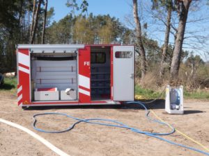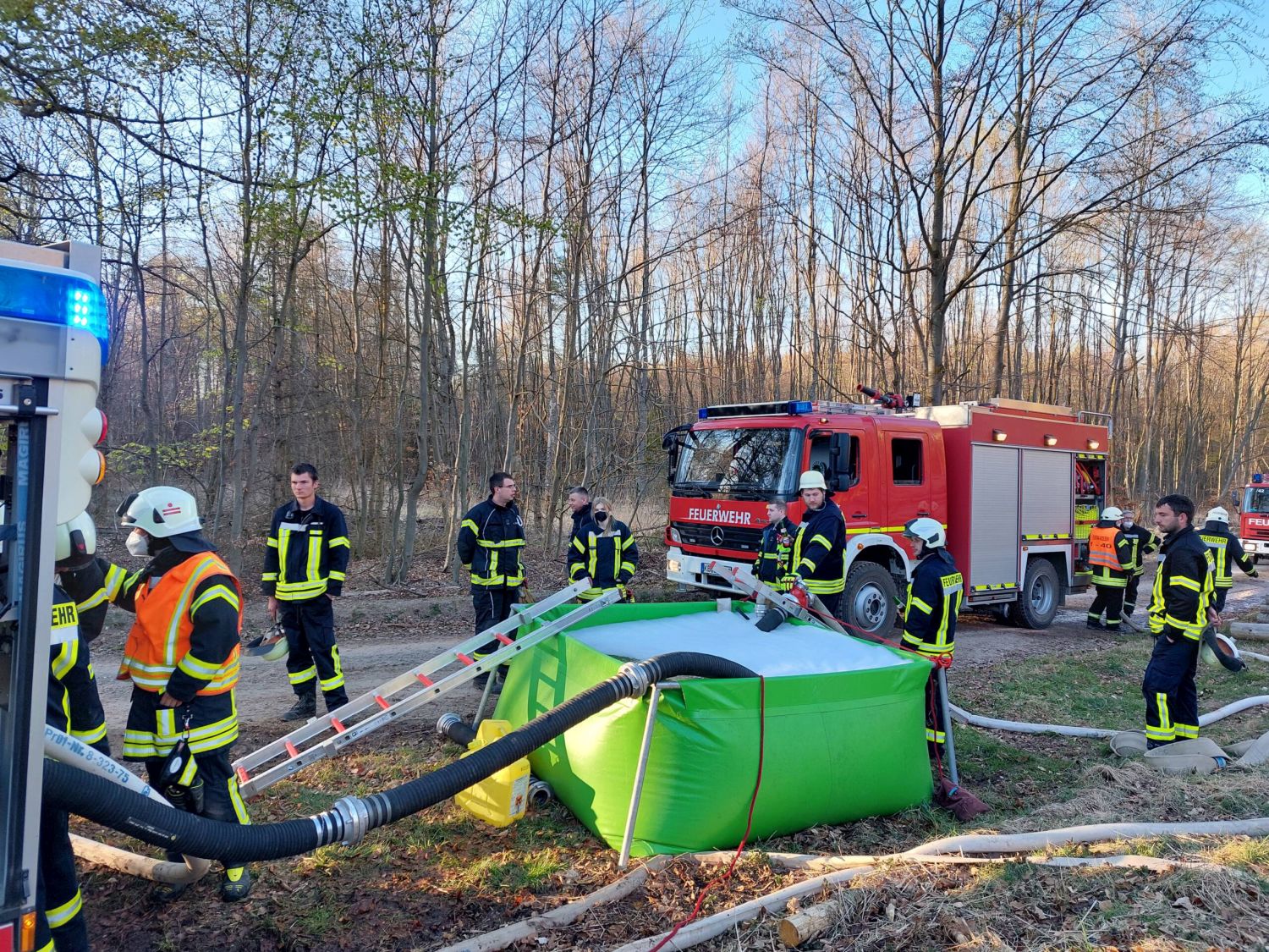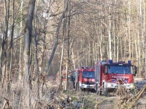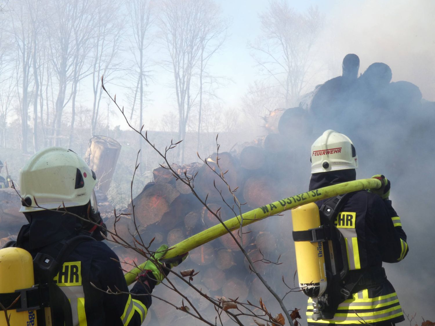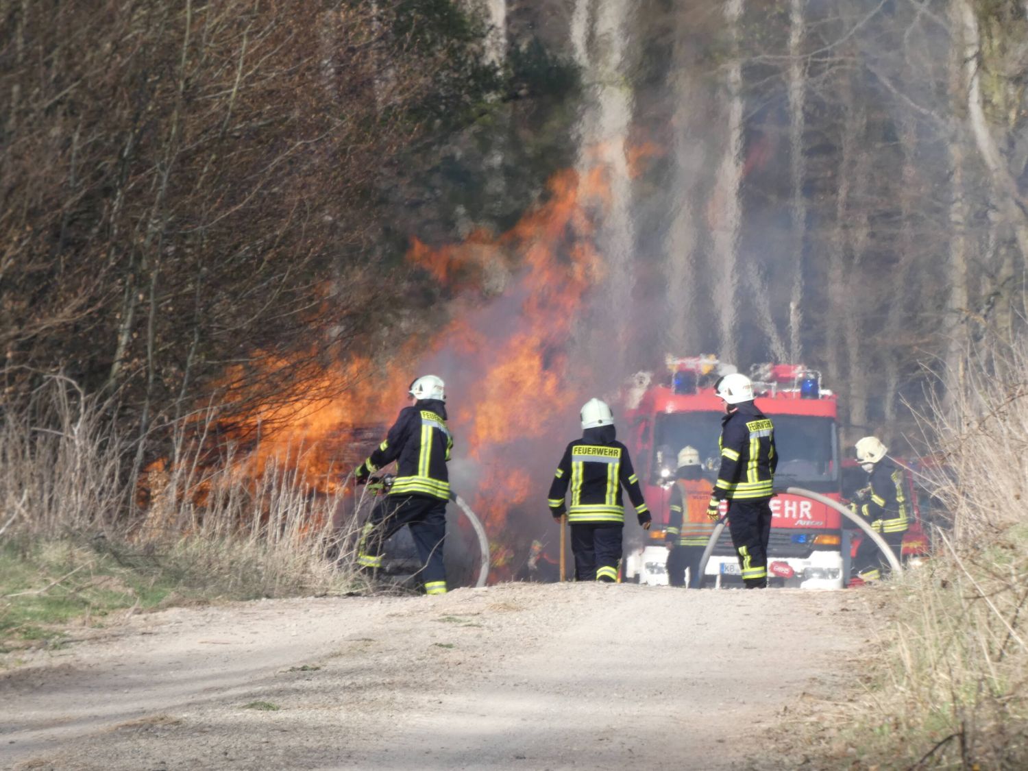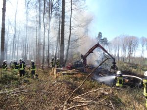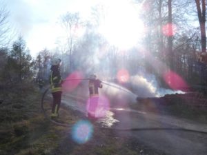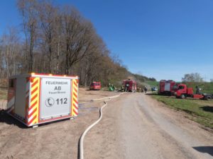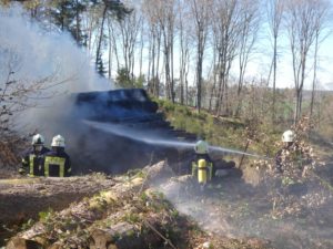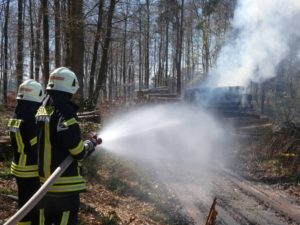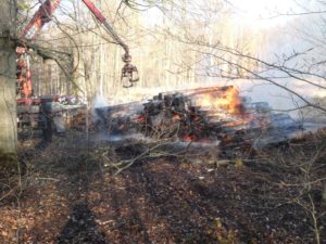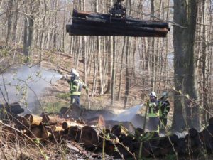 Waldeck – Am Ostermontag wurden die Feuerwehren Sachsenhausen und Höringhausen zu einem gemeldeten Waldbrand an den Schiebenscheid alarmiert. An einem Waldweg brannten bei unserer Ankunft etwa 10 Raummeter aufgestapelte Baumstämme, das Feuer breitete sich im weiteren Verlauf auf etwa 20 Raummeter betroffene Fläche aus. Die ersten Einsatzkräfte begannen sofort mit der Brandbekämpfung. Ein 3.000l-Faltbehälter wurde am Zufahrtsweg in Stellung gebracht für den Löschwasser-Pendelverkehr. Parallel dazu wurde eine Wasserversorgung über Lange Wegstrecke zum nächsten Überflurhydrant hergestellt. Mit stabiler Wasserversorgung konnte ein umfassender Löschangriff gestartet werden. Mit bis zu 3 C-Rohren wurden die Balken abgelöscht. Um das sorgfältige Ablöschen der Balken überhaupt ermöglichen zu können, musste ein Unimog mit Holzkran eingesetzt werden. Alle Baumstämme wurden nach für nach auseinandergenommen und abgelöscht. Im weiteren Verlauf wurden 2 Hochdrucklüfter eingesetzt, um den Rauch weg von der Einsatzstelle zu blasen. Abschließend wurde die Umgebung weitgehend bewässert. Der Einsatz war nach 2,5 Stunden beendet. Durch das schnelle Eingreifen der Feuerwehr, das zeitnahe Absetzen des Notrufs und die sehr präzise Ortsangabe konnte ein Waldbrand in größerer Ausdehnung verhindert werden.