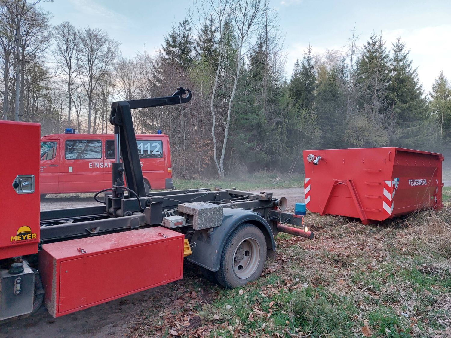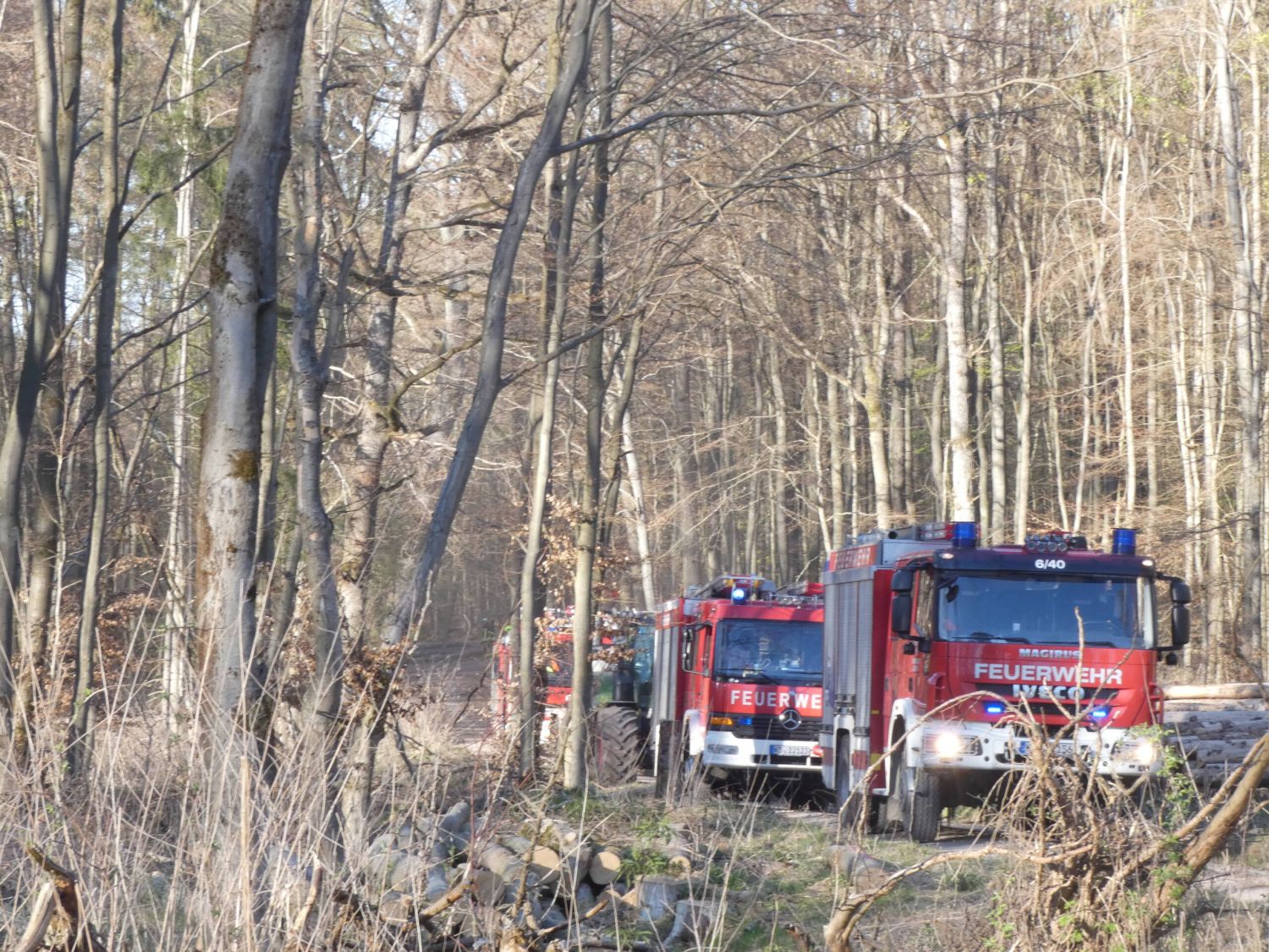 Direkt nach dem Einsatz wurden die Feuerwehren Höringhausen und Sachsenhausen erneut zu einem Waldbrand alarmiert. Zunächst lautete die Alarmierung, dass zwischen Höringhausen und Dehringhausen ein weiterer Holzstapel im Wald brennen sollte. Auf der Anfahrt wurden die Angaben präziser, dass der Brand zwischen Dehringhausen und Nieder-Waroldern sein sollte. Dadurch wurde die Feuerwehr Dehringhausen alarmiert. Konkret befand sich der Brand im Gemeindegebiet von Twistetal, weshalb mehrere Feuerwehren aus Twistetal dazu alarmiert wurden. Die Anfahrt gestaltete sich sehr schwierig, mittels Koordinaten durch die Notrufortung konnte der Einsatzort dann aber gefunden werden. Bei Ankunft stand ein großer Holzstapel (ca. 40 Raummeter) in Vollbrand, Teile des Waldbodens brannten ebenfalls. Das Einsatzstichwort auf F WALD 2 erhöht, sodass Tanklöschfahrzeuge aus Korbach und Bad Arolsen dazu alarmiert wurden. Im Wald gab es keine Wasserversorgung, weshalb ein Pendelverkehr errichtet werden musste. Ein umfassender Löschangriff mit mehreren C-Rohren wurde gestartet. Feuerpatschen kamen zum Ersticken der kleineren Glutnester im Waldboden zum Einsatz. Erneut musste ein Holzkran angefordert werden. Damit gelang es den Holzstapel auseinander zu bringen und gezielt die Stämme abzulöschen. Im weiteren Einsatzverlauf war auch in anderen Teilen des Waldes eine Rauchentwicklung sichtbar. Da nicht ausgeschlossen werden konnte, dass es an einer weiteren Stelle brannte, wurde der Einsatzleitwagen 2 (ELW2) des Landkreises mit der Feuerwehr-Drohne angefordert. Die Drohne überflog den Wald mit ihrer Wärmebildkamera, konnte aber keinen weiteren Brand feststellen, sodass sich der Einsatz auf die eine Einsatzstelle beschränkte. Um das Feuer letzendlich vollständig ablöschen zu können, wurde im weiteren Verlauf Schaummittel als Netzmittel in den Faltbehälter gemischt. Die Tanklöschfahrzeuge aus Sachsenhausen, Twistetal, Korbach und Bad Arolsen leerten ihre Tanks mehrfach und tankten in Elleringhausen auf. Der kräftezehrende Einsatz war nach 3,5 Stunden abgearbeitet, zu diesem Zeitpunkt war die Feuerwehr der Stadt Waldeck bereits seit 6 Stunden im Einsatz.