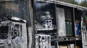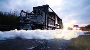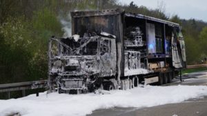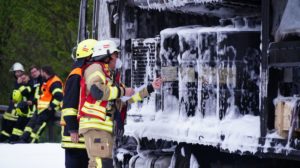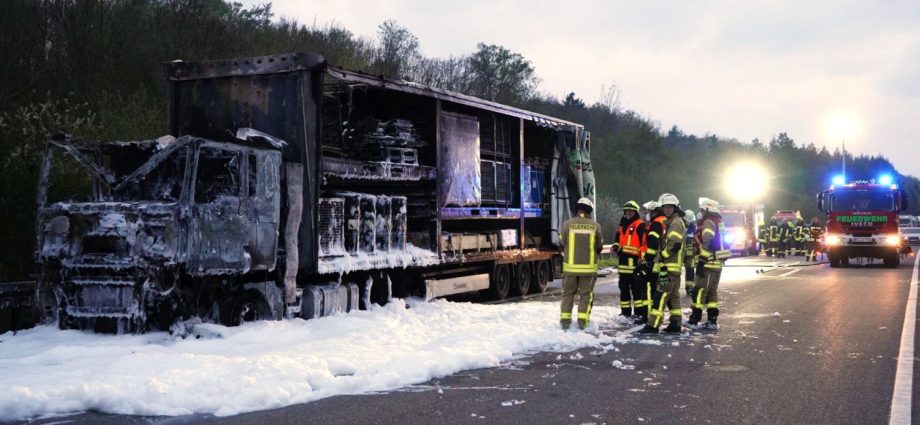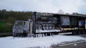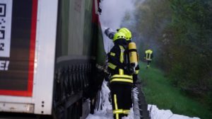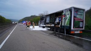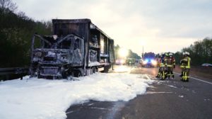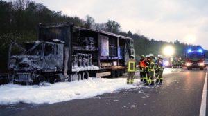 Diemelstadt – Am Montagabend gegen 19 Uhr wurden die Feuerwehr aus Diemelstadt und Warburg-Wethen zu einem LKW-Brand auf die A44 zwischen Diemelstadt und Warburg alarmiert. Als die ersten Einsatzkräfte eintrafen, stand bereits die Zugmaschine und der vordere Teil des Auflieger bereits im Vollbrand. Das Feuer war schnell unter Kontrolle. Die Feuerwehr konnte den hinteren Teil des LKW vor den Flammen schützen. Unter dem mit Stückgut beladener Anhänger war auch Gefahrgut. Vorsichtshalber wurde daraufhin der Gefahrstoffzug der Feuerwehr Höxter dazu alarmiert. Nach einer kurzen Erkundung der Ladung konnte Entwarnung gegeben werden. Es handelte sich um geringe Mengen von Lösungsmittel. Der LKW-Fahrer wurde bei den ersten Löschversuchen durch Rauchgase verletzt. Er kam in ein Krankenhaus nach Warburg. Die Autobahn war in Fahrtrichtung Kassel für mehrere Stunden voll gesperrt.
