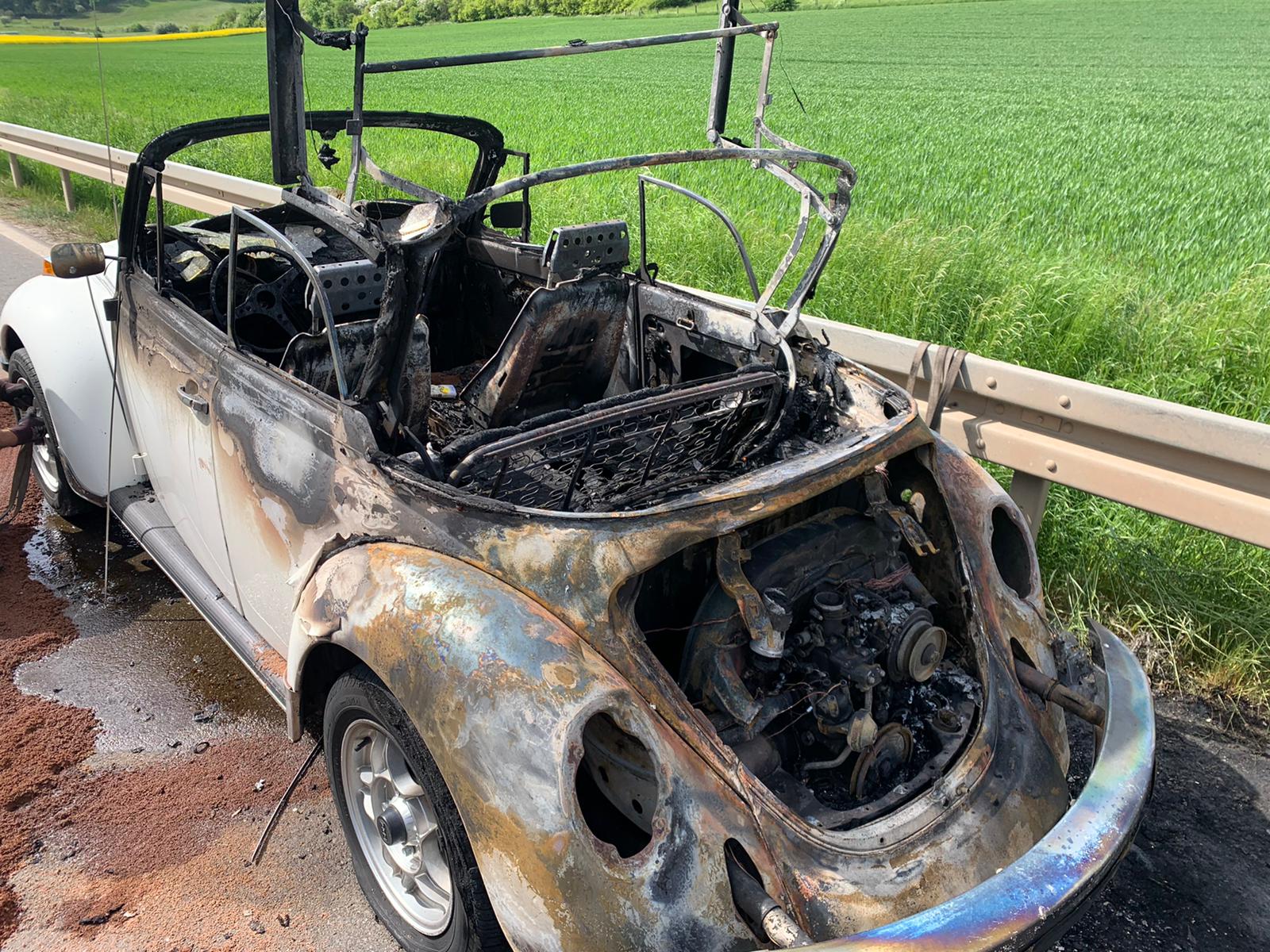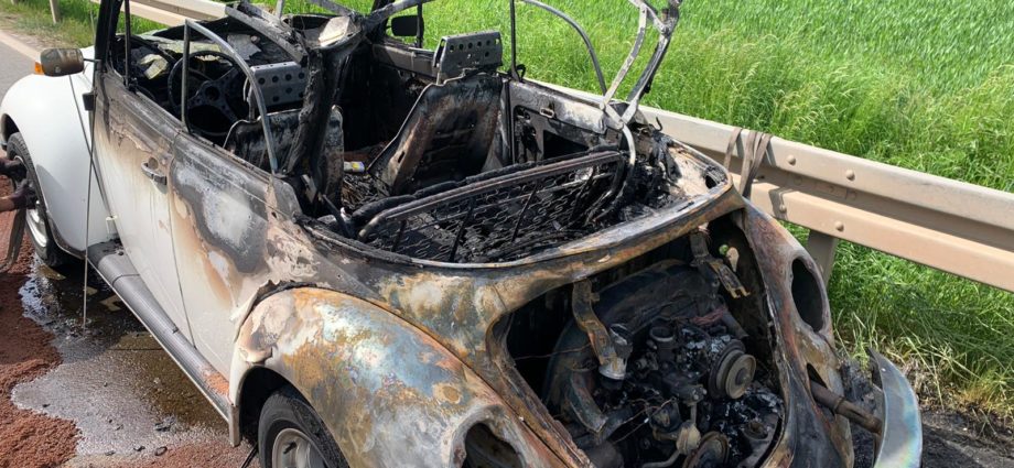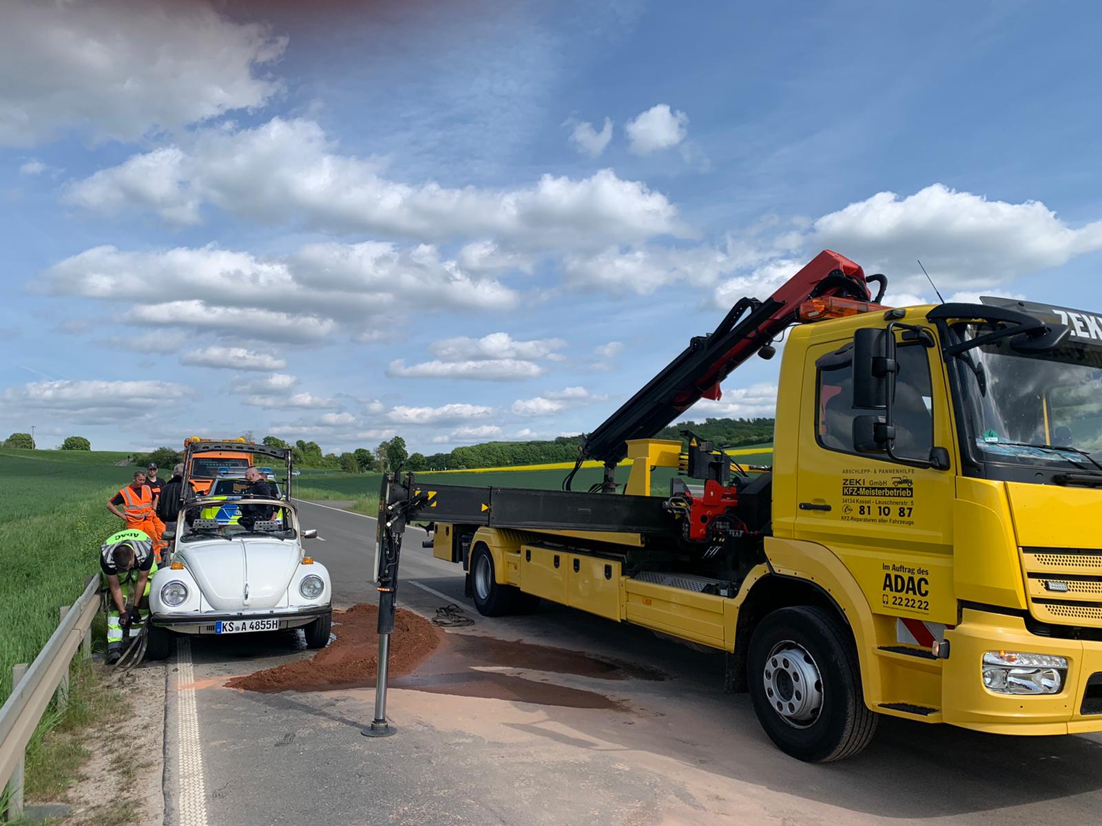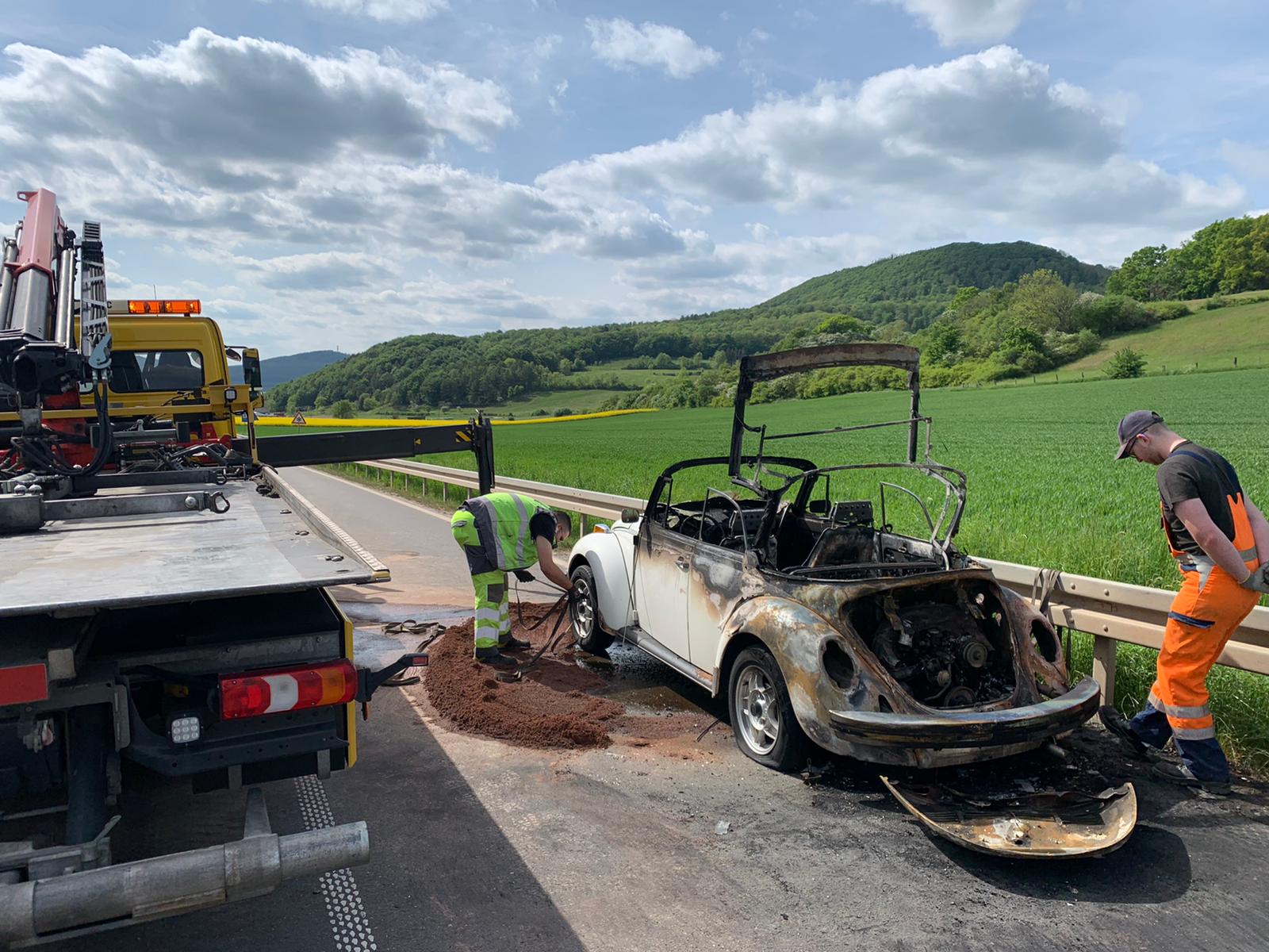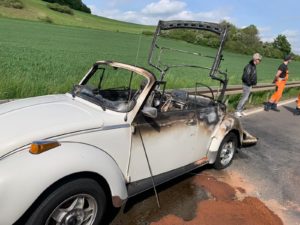 Dörnberg – Zu einem PKW Brand kam es heute mittag gegen 14:00 Uhr auf der B251 von Kassel richtung Habichtswald – Dörnberg. Beim eintreffen der Einsatzkräfte, stand der VW Käfer fast komplett in Vollbrand. Die Feurwehr löschte das Fahrzeug unter Atemschutz und nahm auslaufende Betriebsstoffe auf. Die Fahrbahn musste während des Löscheinsatzes und der Bergung des Fahrzeuges Vollgesperrt werden, gegen 16:30 Uhr war der Einsatz für alle beendet. Wie es zu dem Brand kam, ist aktuell noch unklar. Im Einsatz war die Feuerwehr Habichtswald, die Polizei Wolfhagen, die Straßenmeisterrei Wolfhagen und der Abschleppdienst der Firma Zeki aus Kassel.