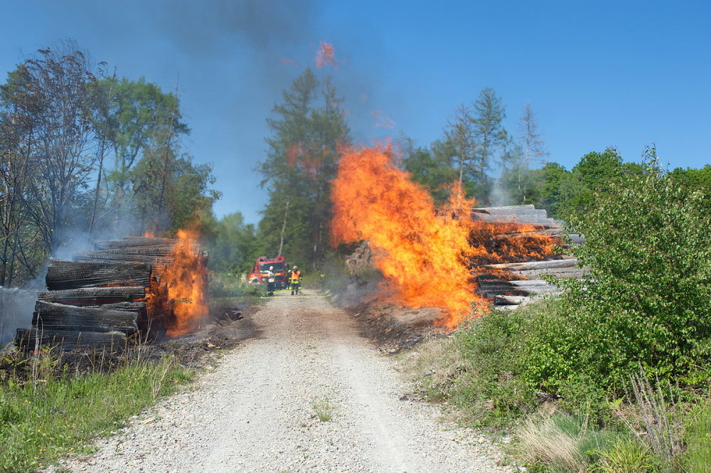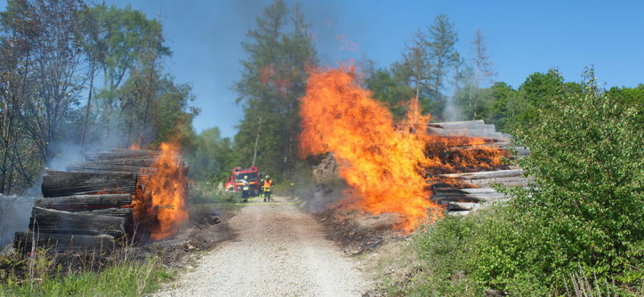 Hessisch Lichtenau – Ein großer Holzpolter am Wegesrand zwischen Walburg und Küchen brannte am Sonntag gegen 15.45 Uhr in voller Ausdehnung, das Feuer griff nach kurzer Zeit auf einen gegenüberliegenden Holzpolter über. Durch die Trockenheit im Wald drohte sich der Brand großflächig auszudehnen. Die Feuerwehren positionierten sich von allen Seiten des Brandes und konnten die Ausbreitung des Feuers verhindern, da im ersten Angriff nicht genug Wasser zur Verfügung stand, musste der Bereich um die brennenden Polter gehalten werden. Im weiteren Verlauf des Einsatzes wurden die Feuerwehren Küchen, Hopfelde und Hollstein alarmiert.