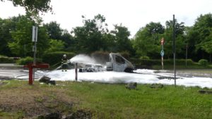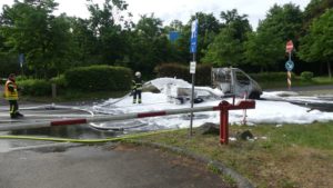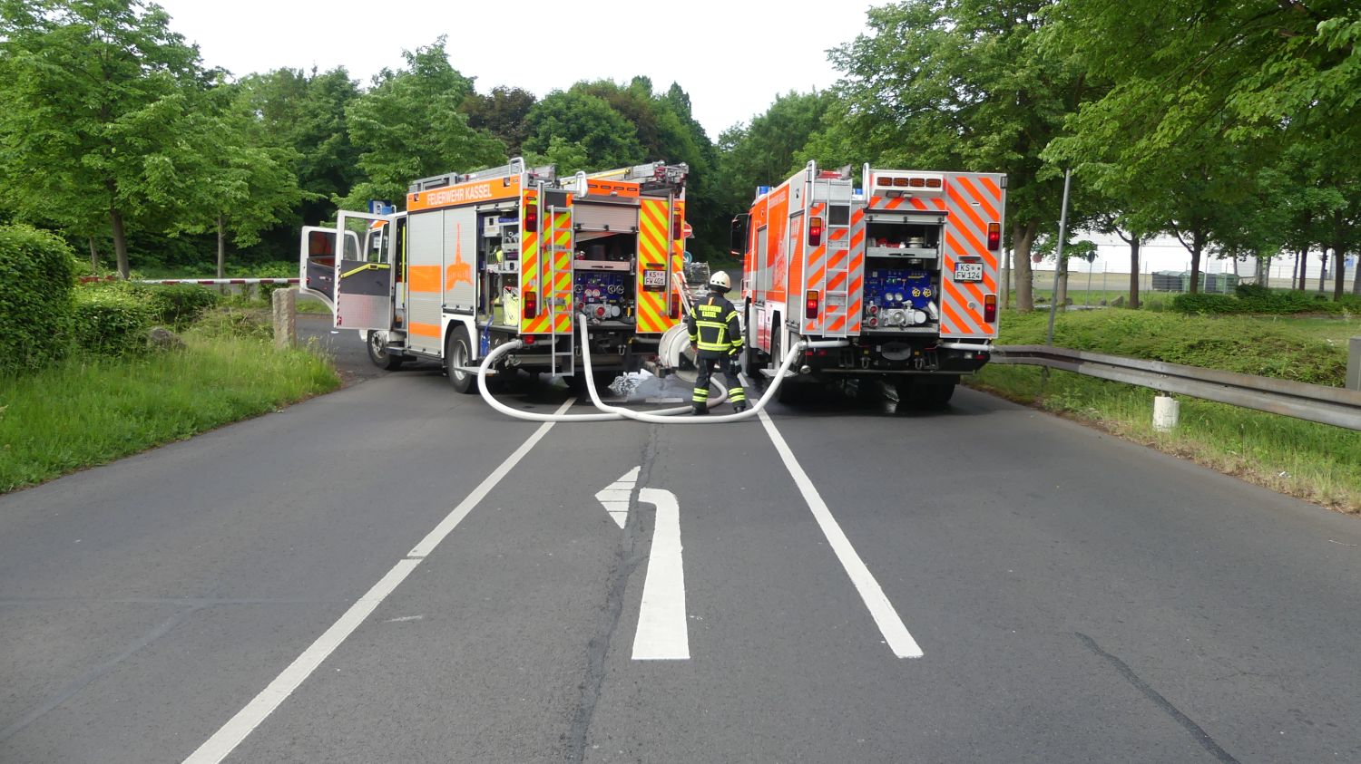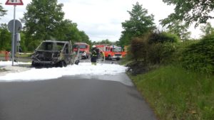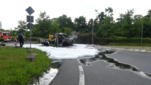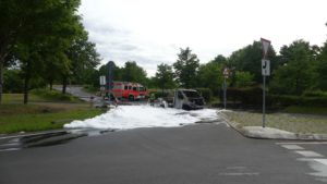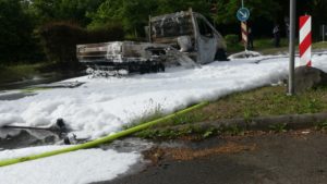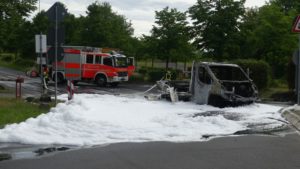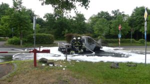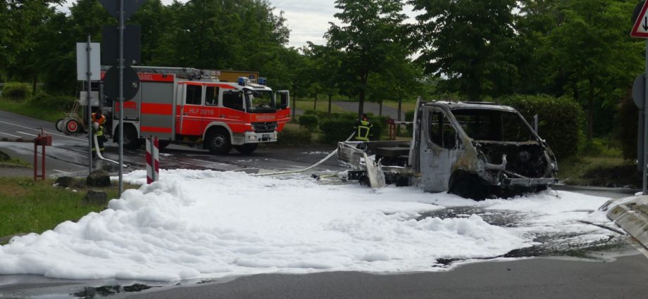 Kassel – Am heutigen Montagmorgen kam es gegen 7:50 Uhr zu einem Fahrzeugbrand. Das Fahrzeug befuhr die Zufahrt zu den Messehallen, von der B83 kommend. Als die 2 Mitarbeiter eines Kasslers Gartenbetrieb Feuer unter dem Fahrzeug merkten, hielten sie an. Es dauerte nicht lange, da stand das Fahrzeug in Vollbrand, an diesem entstand ein Totalschaden. Die Zufahrt war während des Einsatzes für 1,5 Stunden Vollgesperrt. Ob Schäden an der Fahrbahn entstanden sind, ist noch nicht klar. Die Ursache ist womöglich auf einen technischen Defekt zurückzuführen.