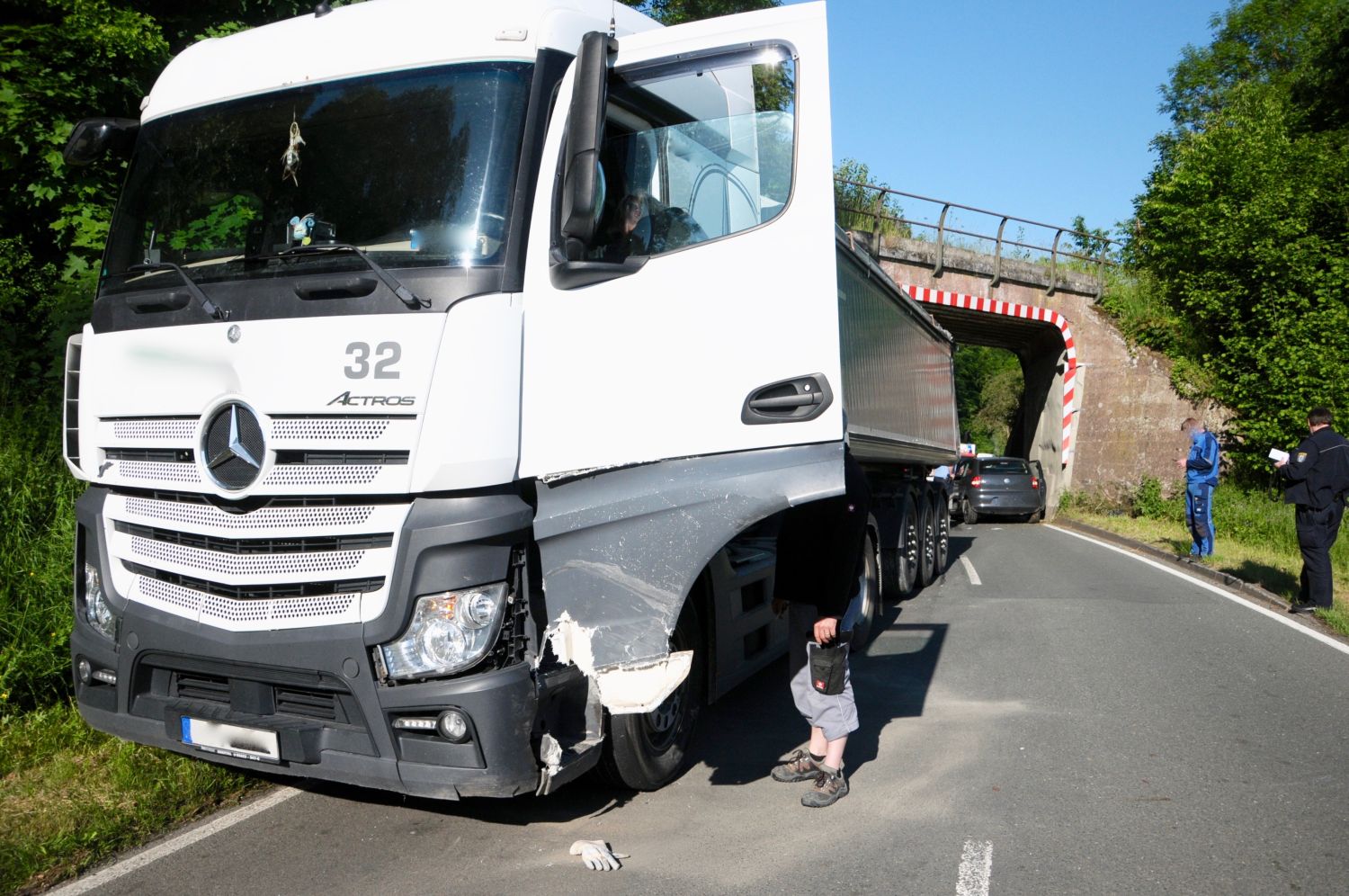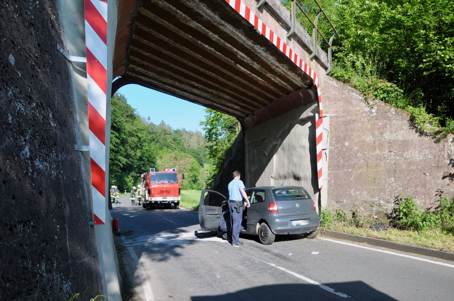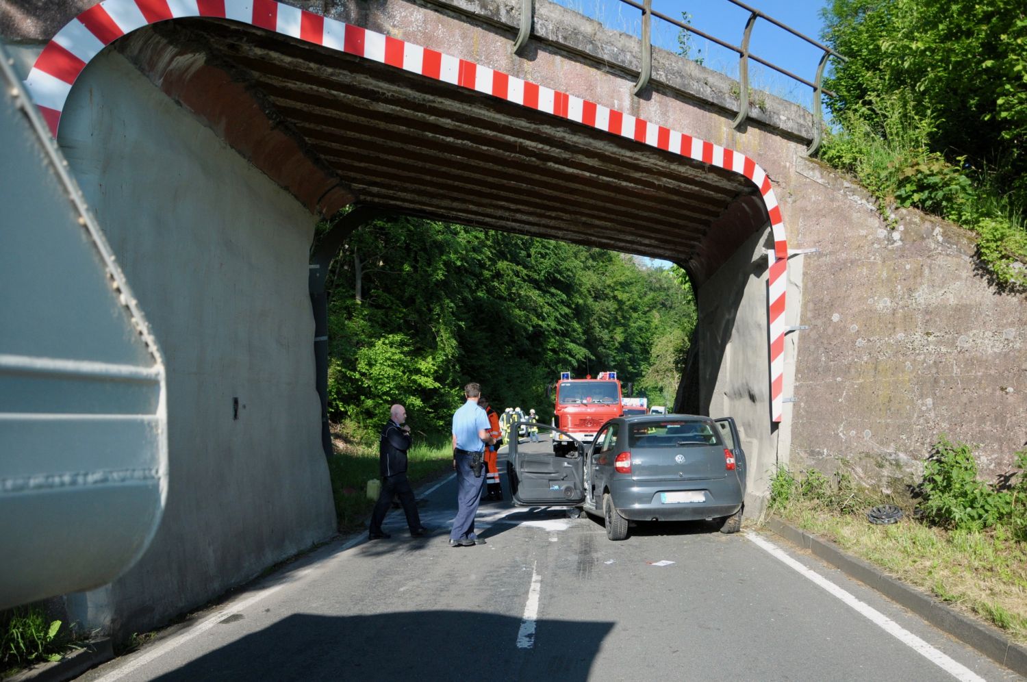 Edertal – Zu einem Verkehrsunfall zwischen einem PKW und einem LKW kam es am frühen Mittwochmorgen auf der L 3086 zwischen Wega und Anraff. Dabei zog sich eine Person schwere, glücklicherweise aber keine lebensbedrohlichen Verletzungen zu. Nach ersten Erkenntnissen von der Unfallstelle befuhr zunächst eine 19-jährige Verkehrsteilnehmerin die Landstraße von Wega in Richtung Anraff. In einer Linkskurve, kurz vor einem Viadukt, kam ihr ein aus Richtung Anraff fahrender Sattelzug entgegen. Aus bislang ungeklärten Umständen kollidierte die junge Frau zunächst leicht mit dem LKW und krachte im weiteren Verlauf frontal gegen das Viadukt.