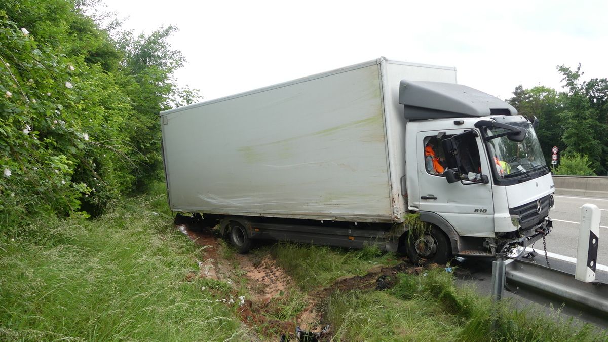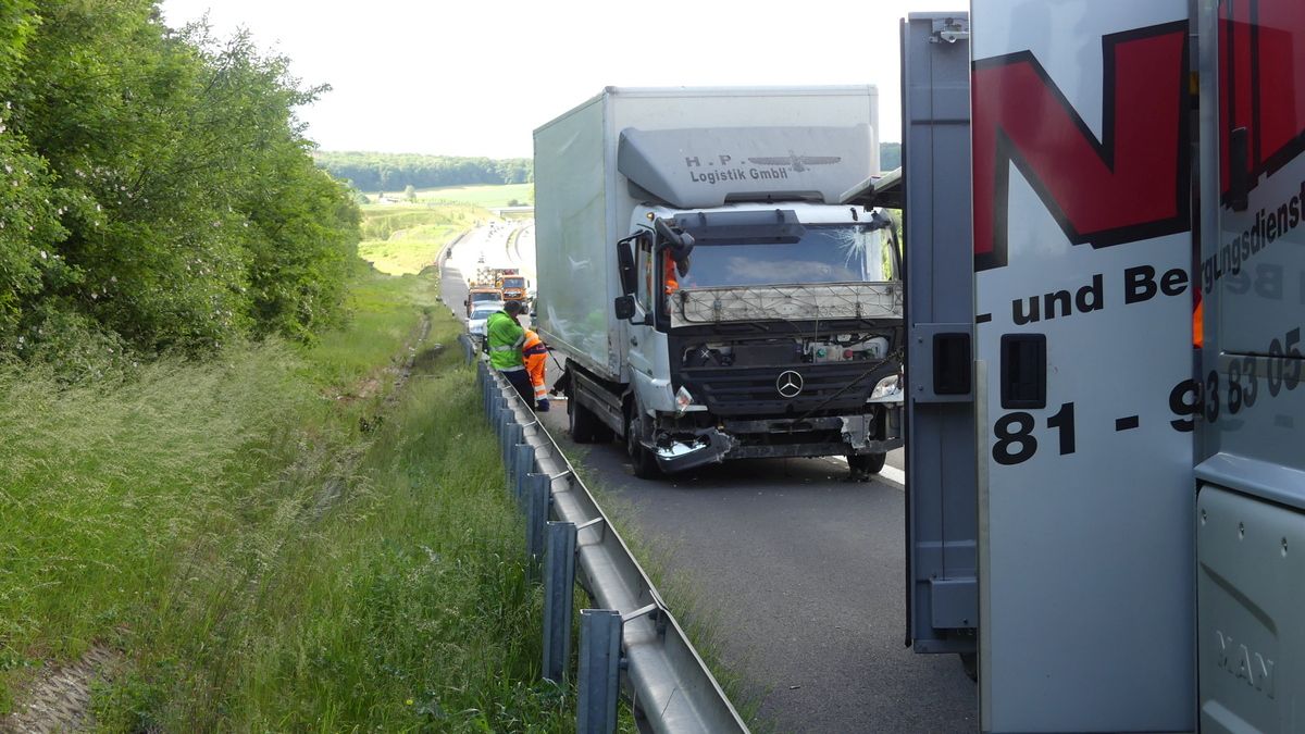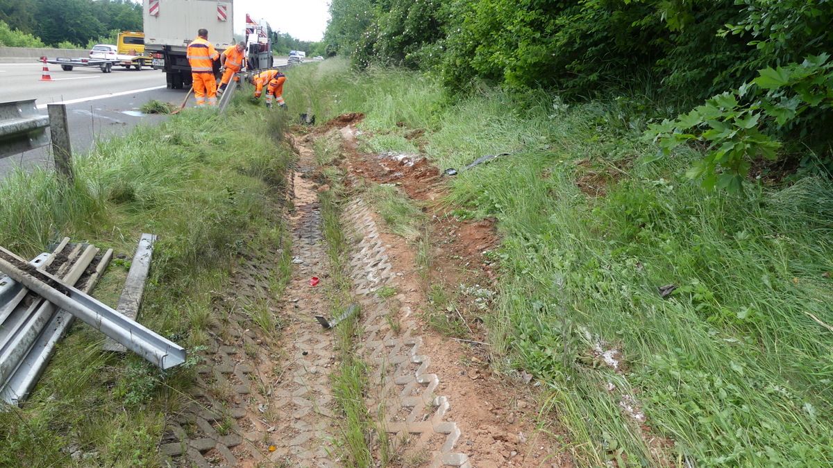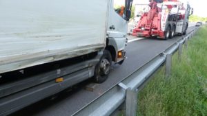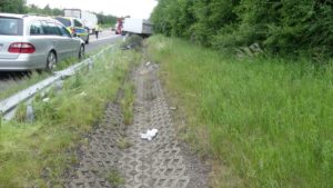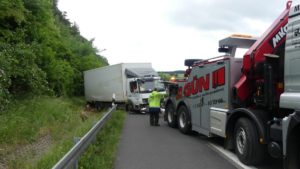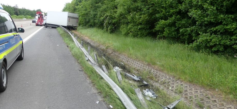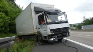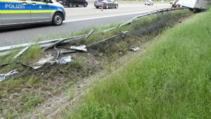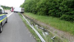 Melsungen – Am Vatertags morgen kam es gegen 6:30 Uhr auf der A7 Richtung Kassel, kurz hinter der Anschlussstelle Melsungen zu einem schweren LKW Unfall. Der Fahrer einer Spedition aus der Nähe von Hamburg befuhr mit seinem 7,5 Tonner die Autobahn. Kurz hinter der Anschlussstelle Melsungen, kam er mit seinem mit Stückgut beladen LKW, von der Fahrbahn ab. Er fuhr einige Meter auf der Leitplanke, bevor er im Graben zum Liegen kam. Dabei riss er sich die Ölwanne auf und beschädigte rund 150 Meter Leitplanke.