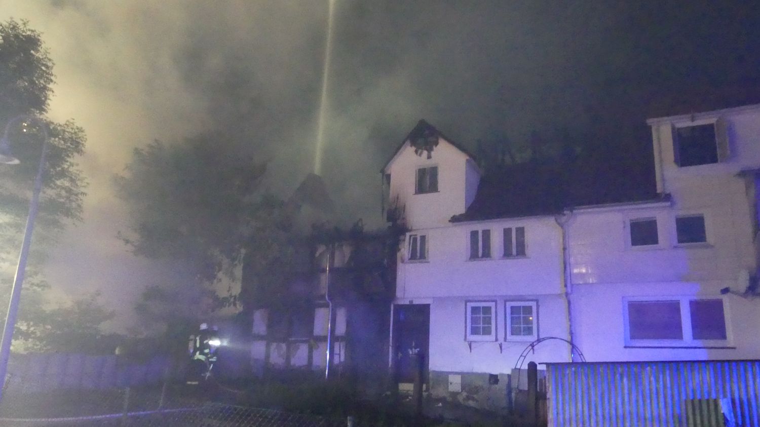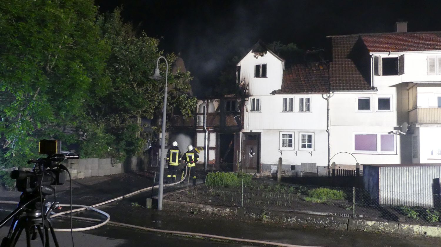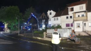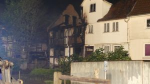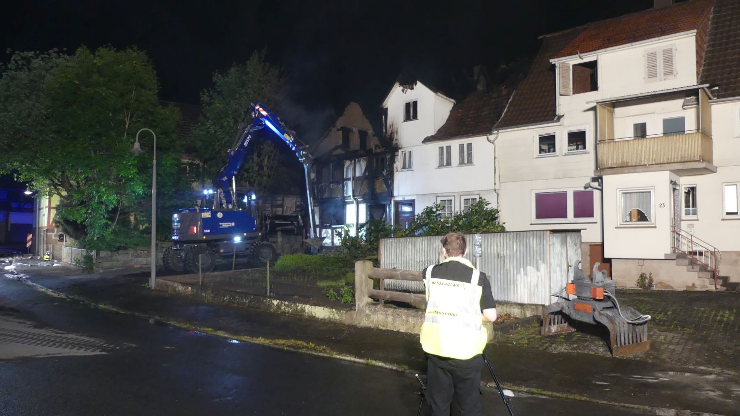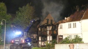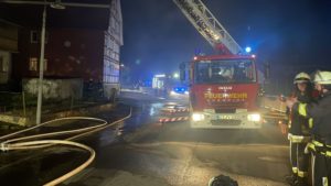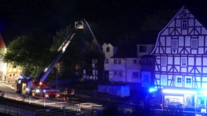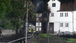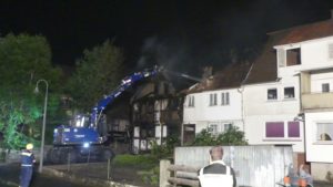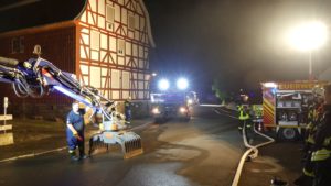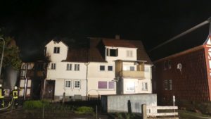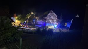 Großalmerode – Am Donnerstag gegen 21:30 Uhr, gerieten aus bislang noch unbekannter Ursache zwei Einfamilienhäuser in der Hauptstraße in Großalmerode-Trubenhausen in Brand. Die beiden Einfamilienhäuser sind direkt aneinander gebaut. Vermutlich entstand der Brand zunächst im Bereich einer Garage eines anderen Wohnhauses, welches sich direkt neben den beiden Einfamilienhäusern befindet. Durch das Feuer wurden zunächst die Garage und zwei dort geparkte PKW komplett zerstört. Anschließend griff das Feuer auf die beiden Einfamilienhäuser über. Auch diese wurden durch das Feuer komplett zerstört und sind nicht mehr bewohnbar. Ein weiteres Einfamilienhaus, welches sich unmittelbar neben den beiden anderen Einfamilienhäusern befindet, wurde ebenfalls durch Löschwasser im Mitleidenschaft gezogen. Ein Großaufgebot der Feuerwehren Großalmerode und Trubenhausen war mit Löscharbeiten vor Ort eingebunden. Das Feuer ist mittlerweile gelöscht. Personen wurden nicht verletzt, da sie sich rechtzeitig selbständig in Sicherheit bringen konnten. Das THW wurde nachträglich zum Abriss der Häuser alarmiert, damit die Feuerwehr alle Glutnester ablöschen kann. Im Einsatz waren rund 100 Einsatzkräfte. Nach ersten vorsichtigen Schätzungen entstand durch den Brand ein Gesamtsachschaden im mittleren 6-stelligen Bereich. Die Kriminalpolizei in Eschwege hat die Ermittlungen zur Brandursache aufgenommen.