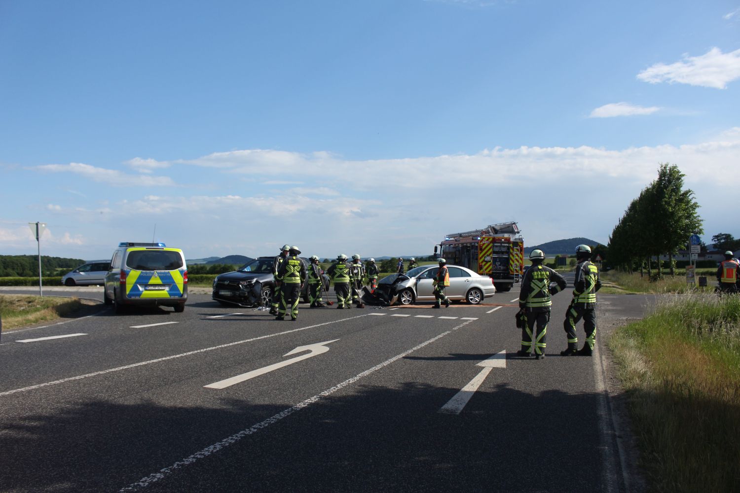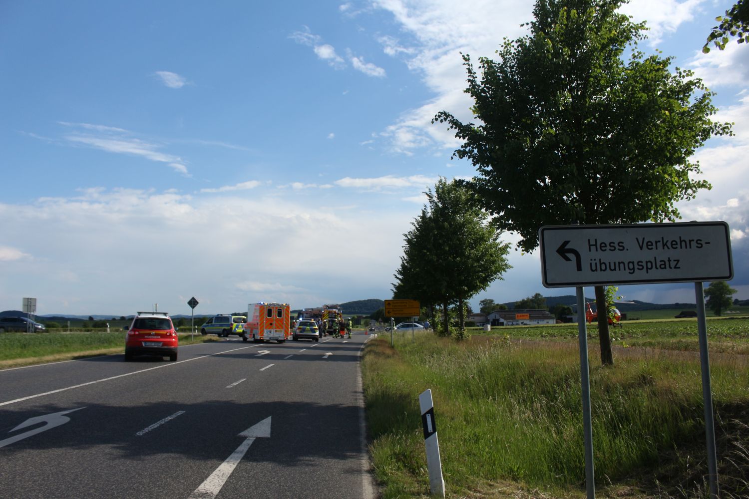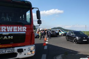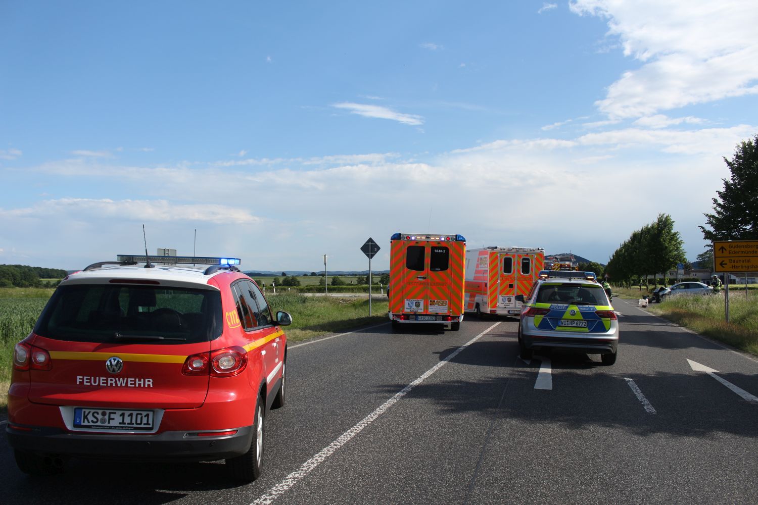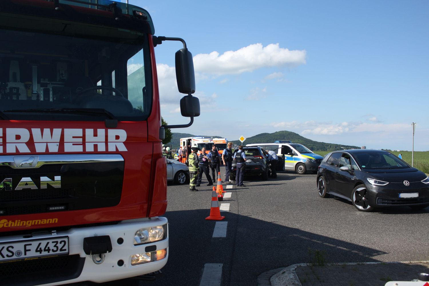 Baunatal – Am Dienstag gegen 16:45 Uhr kam es auf der L3218 zwischen Baunatal – Großenritte und Edermünde – Besse beim Abzweig Richtung Baunatal – Hertingshausen (K22) zu einem Verkehrsunfall bei dem zwei Personen leicht verletzt wurden. Nach ersten Erkenntnissen befuhr der Fahrer des silbernen Fahrzeugs die L3218 kommend von Baunatal – Großenritte wollt nach rechts auf die K22 Richtung Baunatal – Hertingshausen, dabei übersah er den schwarzen SUV, der auf der L3218 kommend von Edermünde – Besse Richtung Baunatal – Großenritte unterwegs war, zu spät und kollidierte mit diesem im Kreuzungsbereich. Beide Fahrzeuge wurden stark beschädigt und mussten abschleppt werden. Die L3218 war während der Rettungs- und Bergungsarbeiten vollgesperrt. Im Einsatz war der Rettungshubschrauber Christoph 7 die Polizei Baunatal mit 2 Streifenwagen, die Feuerwehr Baunatal mit 3 Fahrzeugen mit rund 25 Einsatzkräften.