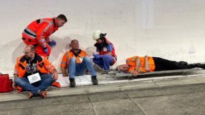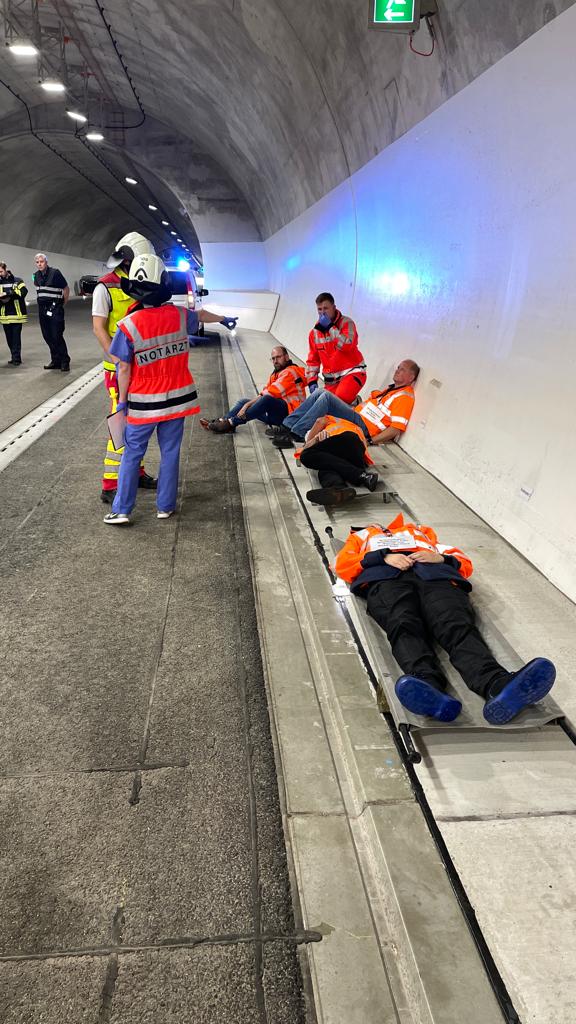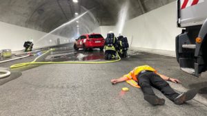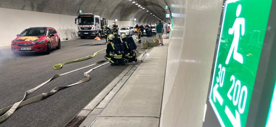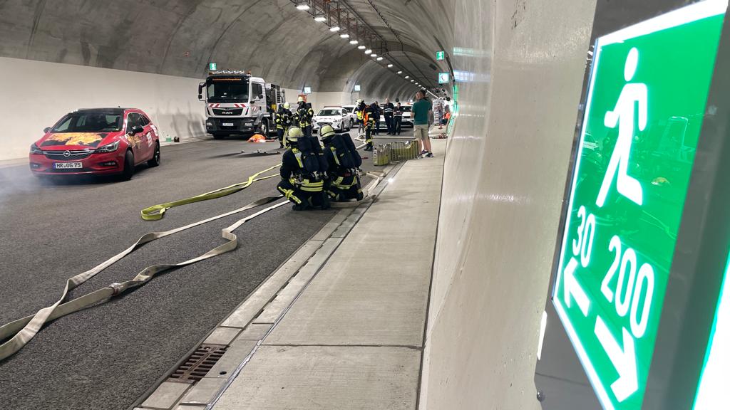 Schwalmstadt – Rund 150 Einsatzkräfte übten am Freitagnachmittag den Erstfall im Frankenhainer Tunnel nahe Schwalmstadt. Dabei handelte es sich nach Information von Bernhard Klöppel (Leiter „Die Autobahn“ Nordhessen) um eine finale Übung auf die Funktionsfähigkeit der Tunneltechnik. Simuliert wurde in der Tunnelmitte ein Fahrzeugbrand nach Verkehrsunfall mit mehreren Verletzten. Pyrotechnik, Rauch und Statisten sorgten für einen realitätsnahen Übungseffekt. (mpu)