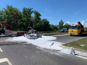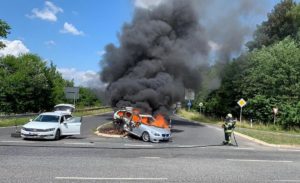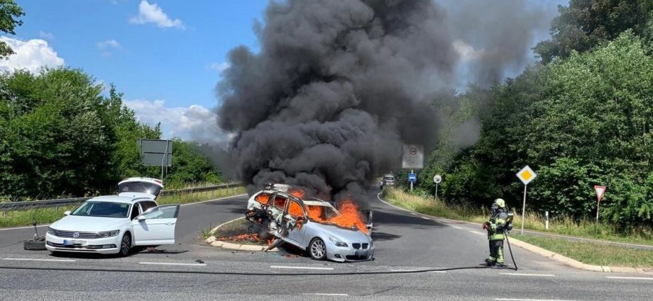 Kaufungen – Zu einem schweren Verkehrsunfall mit Brandfolge kam es am Samstag im Kreuzungsbereich B7/ L3203 Lohfelden . Aus bislang noch unbekannten Gründen kollidierten zwei PKW gegen 13.30 Uhr im Kreuzungsbereich. Ein PKW geriet sofort in Vollbrand. Der Fahrer konnte sich noch rechtzeitig in Sicherheit bringen. Er wurde schwer verletzt in ein Krankenhaus eingeliefert. Die Fahrerin vom anderen Fahrzeug wurde leicht verletzt. Neben der Feuerwehr Kaufungen, Polizei und dem Rettungsdienst war auch der Rettungshubschrauber Christoph 7 im Einsatz. Die Unfallstelle war für die Rettungs- und Bergungsarbeiten für mehrere Stunden voll gesperrt.