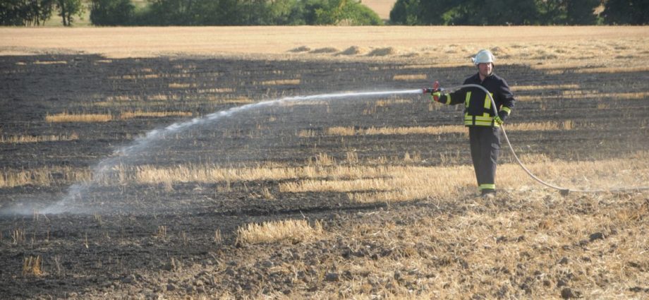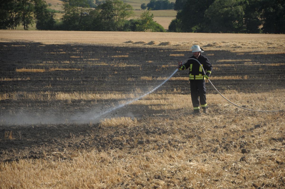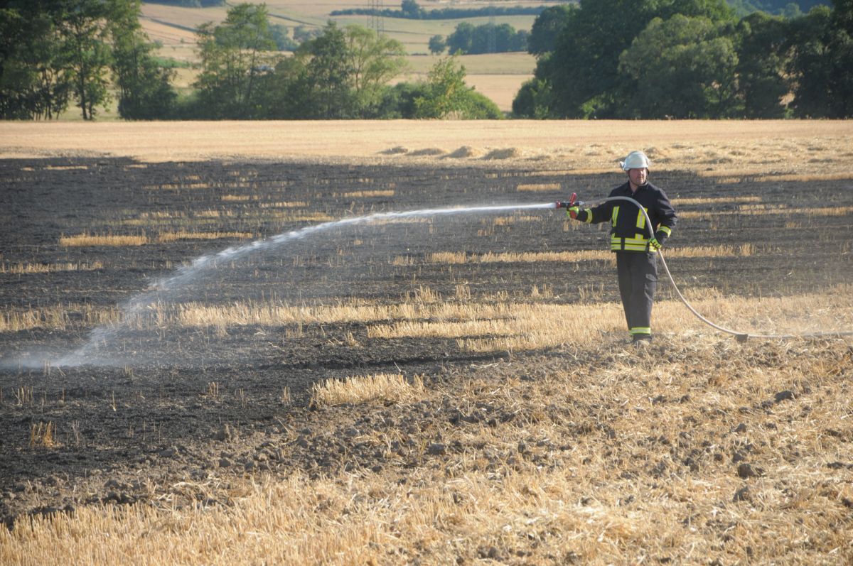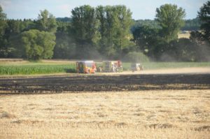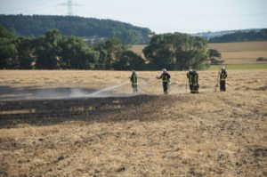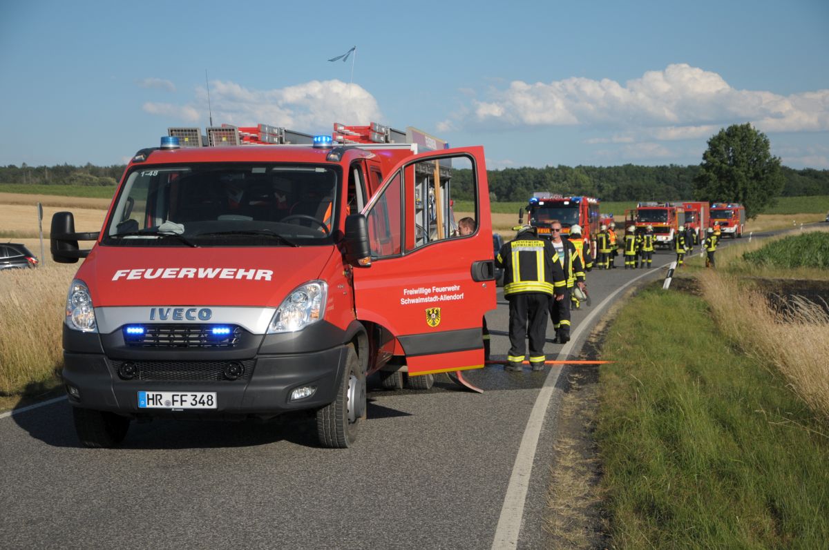 Schwalmstadt – Zwischen Michelsberg und der Wolfshainsiedlung geriet am frühen Sonntagabend ein Stoppelfeld in Brand. Bei Ankunft der Brandschützer brannte bereits eine Fläche von knapp einem Hektar Feld. Die rund 40 Feuerwehreinsatzkräfte hatten das Feuer schnell unter Kontrolle. Von insgesamt drei Seiten löschten die Brandschützer die lodernden Flammen. Einige Landwirte halfen mit Eggen bei der Brandbekämpfung, damit sich das Feuer nicht weiter ausbreiten konnte. Nach einer knappen Stunde konnten die Feuerwehren wieder abrücken. Zur Brandursache konnte vor Ort keine Auskunft gegeben werden. Im Einsatz waren insgesamt 40 Einsatzkräfte der Feuerwehren Allendorf, Michelsberg, Röhrshain, Treysa, Zimmersrode und Ziegenhain sowie die Polizei Schwalmstadt. Während des Einsatzes war die L 3074 zwischen Michelsberg und Röhrshain für den Verkehr gesperrt. Sachschaden entstand keiner. (mpu)