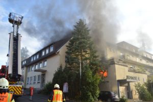 Nach einer kurzen Grillpause ging es gegen 19.45 Uhr zu einem weiteren Brand in der Desseler Straße. Dort kam es in einem ehemaligen und seit Jahren leerstehenden Hotel / Gaststätte zu einem Brandausbruch im Bereich des Gast- und Schankraumes. Beim Eintreffen der Feuerwehr schlugen die Flammen meterhoch aus den Fenstern im Eingangsbereich. Der Zugang war der Feuerwehr zunächst nicht möglich, da alle Eingänge mit Holzplatten zugeschraubt waren. Der erste Angriff erfolgte daher mit mehreren Rohren im Außenangriff. Im Einsatz war die Feuerwehr aus Hessisch Lichtenau, die den Brand schnell unter Kontrolle hatte. Die Höhe des Sachschadens ist derzeit noch nicht bekannt, ebenso die Brandursache. Anwohner versorgten die Einsatzkräften bei beiden Einsatzstellen mit Getränken.