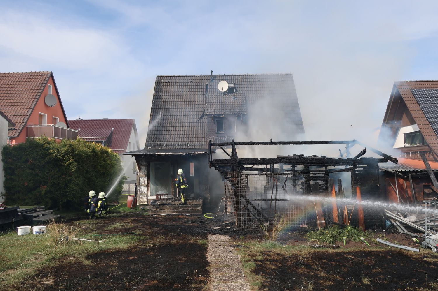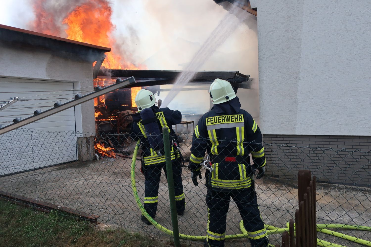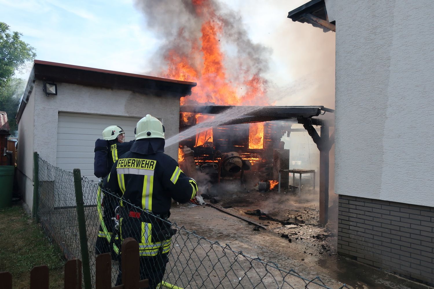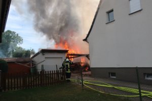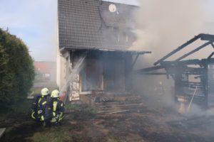Hessisch Lichtenau – Gegen 16.10 Uhr wurde am Montagnachmittag ein Brand in der Straße „Leimenkaute“ in Hessisch Lichtenau gemeldet. Vor Ort stellte sich heraus, dass ein Geräteschuppen auf der Rückseite des Grundstückes brannte. Da der Geräteschuppen an einen Carport angrenzt, der wiederum an die hintere Fassade des Wohnhauses angrenzt, griff das Feuer zunächst auf den Carport und im Anschluss auch auf das Wohnhaus über. Durch die alarmierte Feuerwehr wurde die Haustür aufgebrochen, um festzustellen, ob sich noch Personen im Haus befinden, was jedoch nicht der Fall war. Außerhalb des Hauses konnte ein 36-Jähriger (Bekannter) angetroffen werden, der zur Brandzeit im Haus geschlafen hatte, dann durch die Geräusche des Feuers wach wurde und das Haus somit rechtzeitig verlassen konnte. Die 58-Jährige Hauseigentümerin traf dann während des Brandes ebenfalls ein und bestätigte, dass sich niemand mehr im Haus aufhält. Die Feuerwehren aus Hessisch Lichtenau, Walburg, Retterode und Hopfelde hatten den Brand gegen 17:45 Uhr gelöscht. Durch das Feuer brannte der Geräteschuppen komplett nieder, ebenfalls wurde der angrenzende Carport durch die Flammen zerstört. An der rückseitigen Hausfassade wurde ein angrenzender Anbau (Wintergarten), der Dachkasten und Dachrinnen beschädigt. Der Gesamtschaden wird nach ersten Schätzungen mit rund 100.000 Euro geschätzt. Durch die Hitzeentwicklung kam es zu Beschädigungen in der Nachbarschaft in der Gustav-Siegel-Straße, wo zum einen eine Rasenfläche auf 5 x 6 Meter verbrannte und zum anderen eine Fensterscheibe und ein Rollo beschädigt wurden.