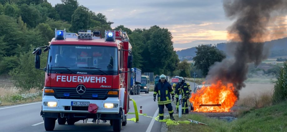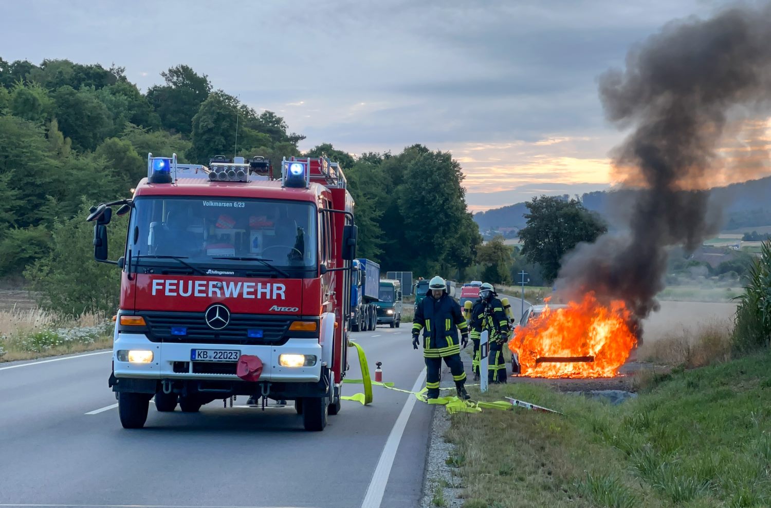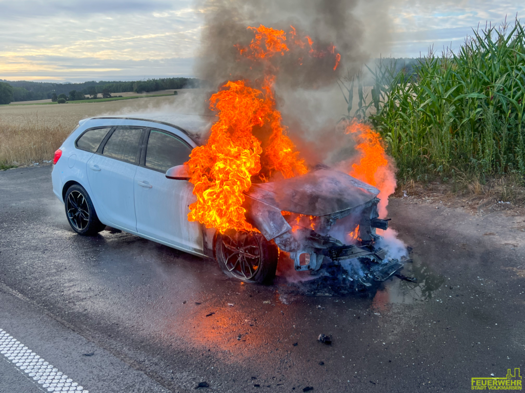 Volkmarsen – Am Mittwochmorgen gegen 06.30 Uhr wurde die Feuerwehr Volkmarsen auf die Landstraße 3080 zwischen Volkmarsen und Wetterburg zu einem PKW-Brand alarmiert. Bei Eintreffen der ersten Einsatzkräfte stand der PKW bereits in Vollbrand. Das Feuer wurde von einem Trupp unter Atemschutz gelöscht und der Fahrer des PKW’s bis zum Eintreffen des Rettungsdienstes betreut. Im weiteren Einsatzverlauf wurde die Motorhaube geöffnet und die Karosserieteile im Bereich des Motorraumes mit Hilfe des hydraulischen Spreizers entfernt, um alle Glutnester ablöschen zu können.