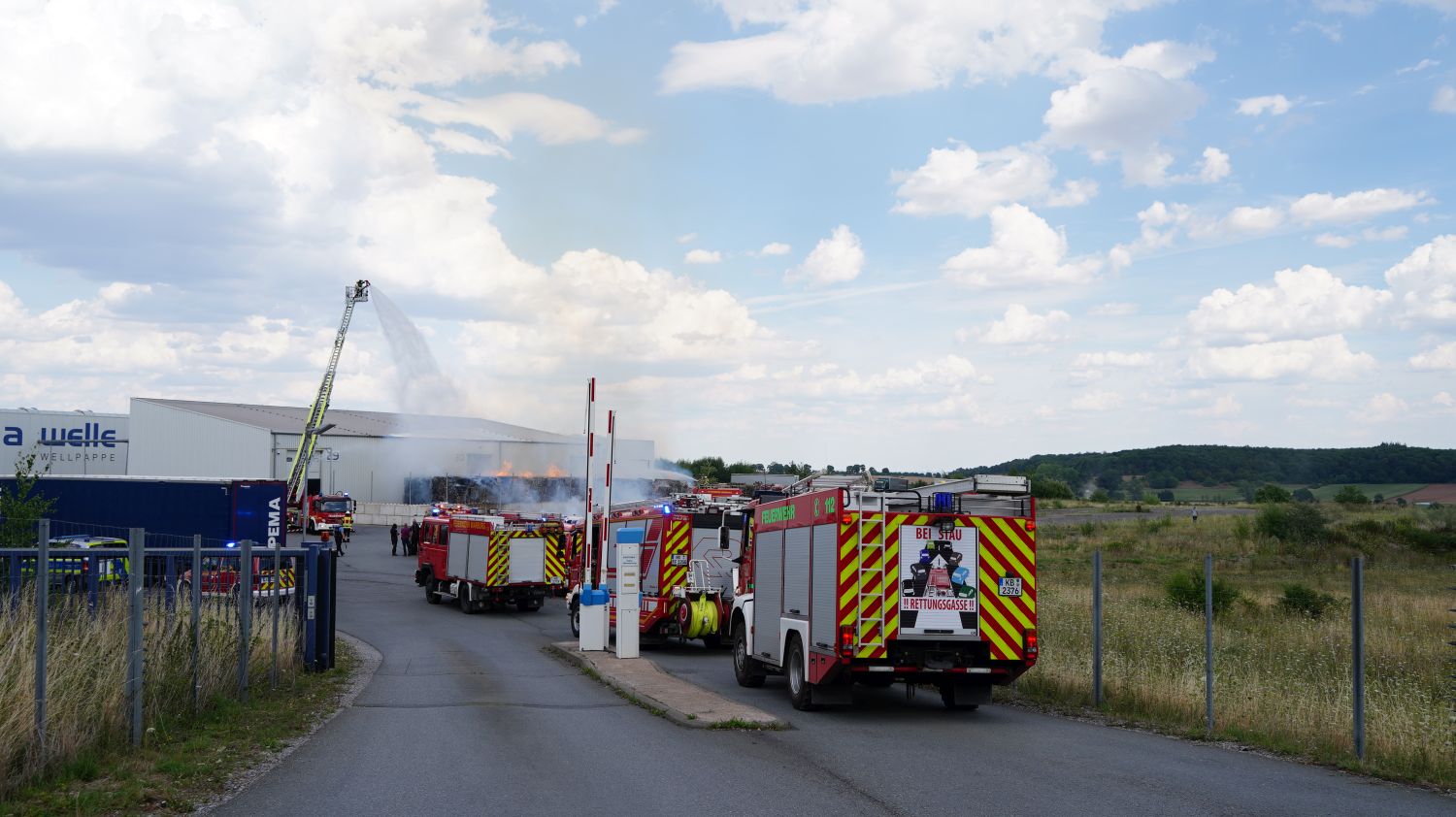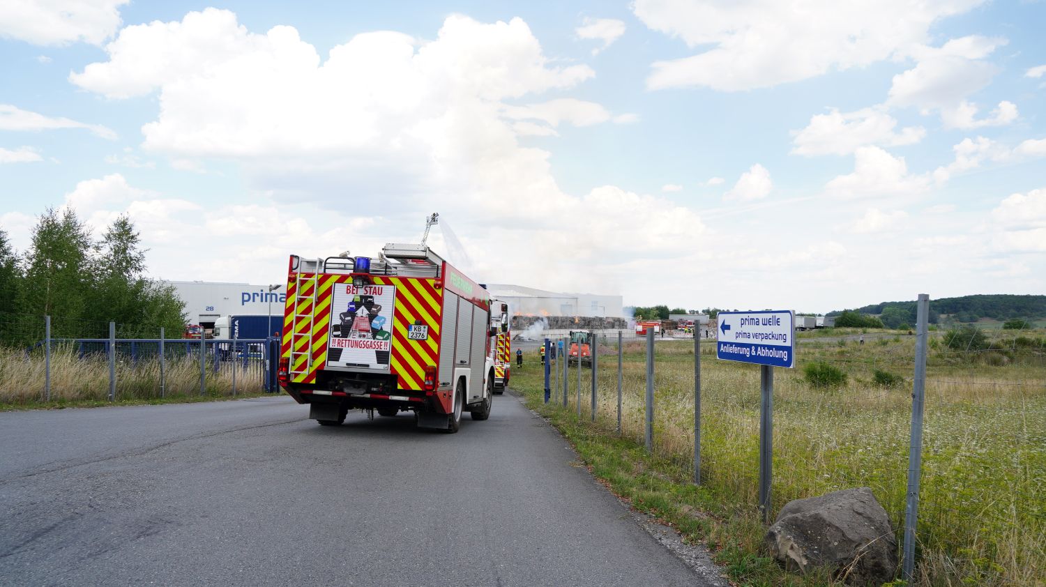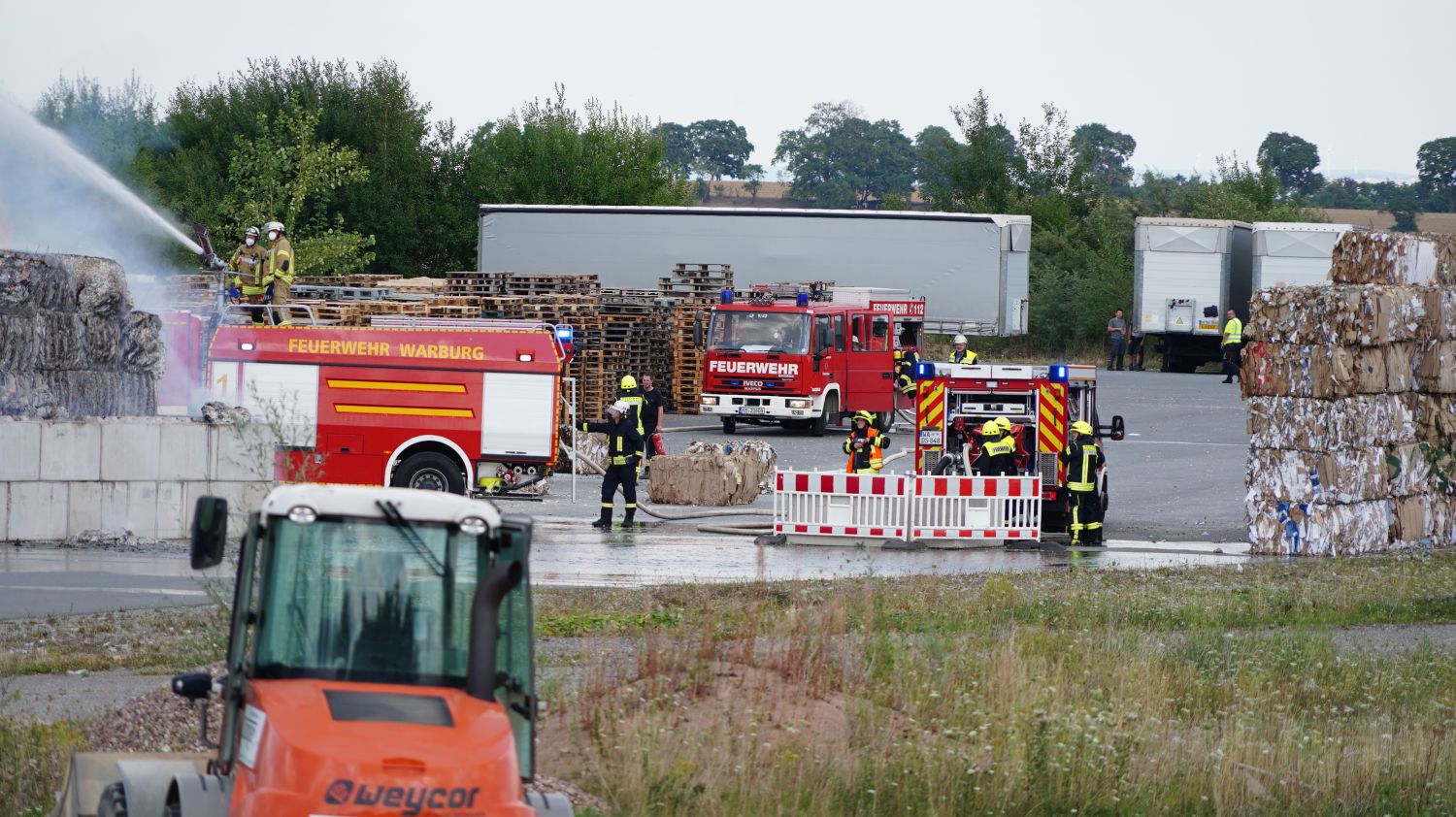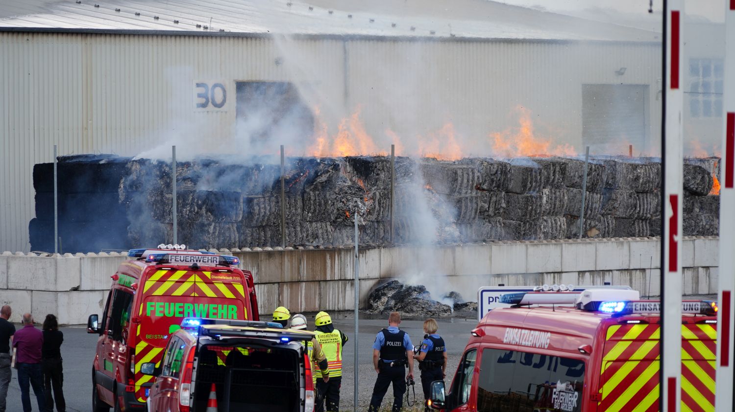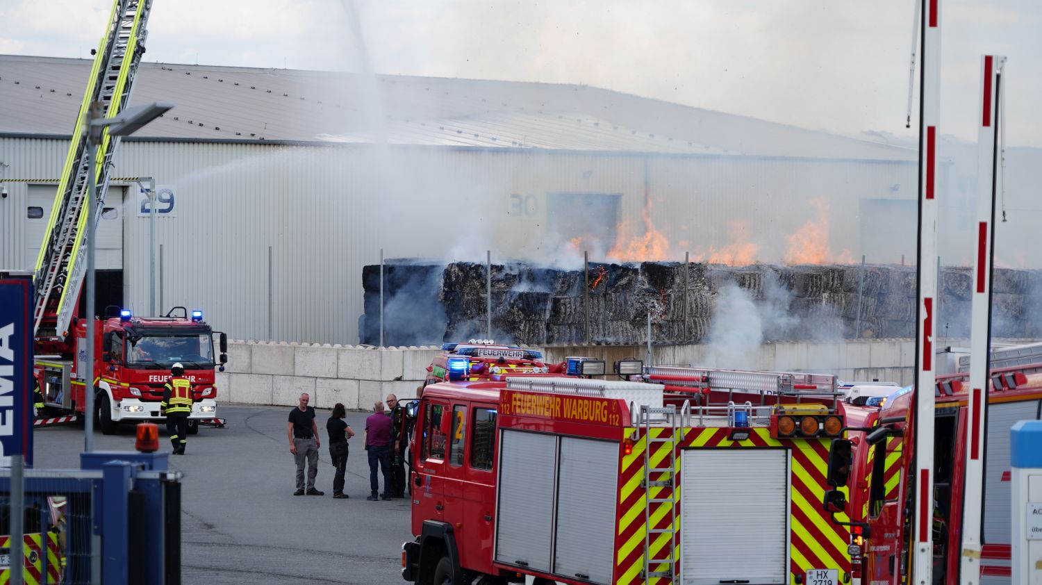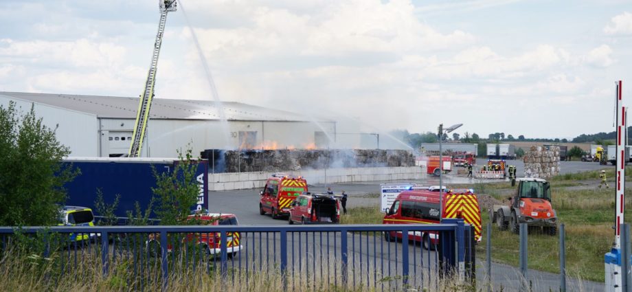 Diemelstadt – Zu einem Großbrand kam es am Donnerstagnachmittag gegen 14.15 Uhr in Diemelstadt-Rhoden. Bei einer Verpackungsfirma gerieten aus bislang noch unbekannten Gründen mehrere Papierballen in Brand. Die Flammen drohten auf einer nah liegenden Halle überzugreifen. Rund 100 Einsatzkräfte unter anderem auch aus dem angrenzendem Bundesland NRW konnten ein übergreifen der Flammen auf die Halle verhindern. Bei gut 38 Grad Celsius im Schatten eine schweißtreibende Arbeit, die noch mehrere Stunden andauern wird.