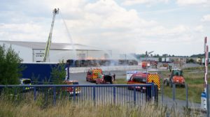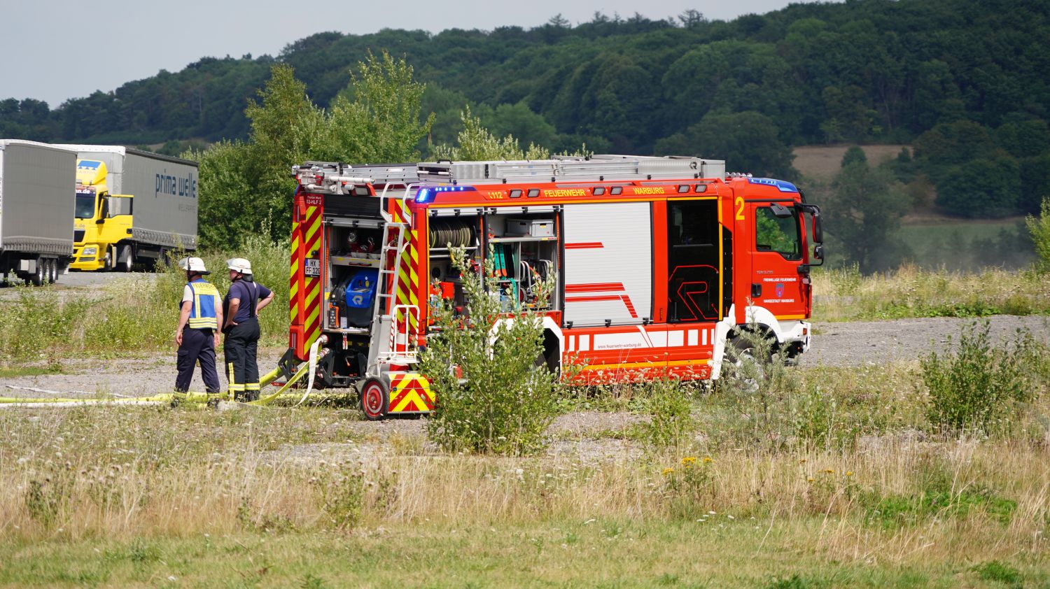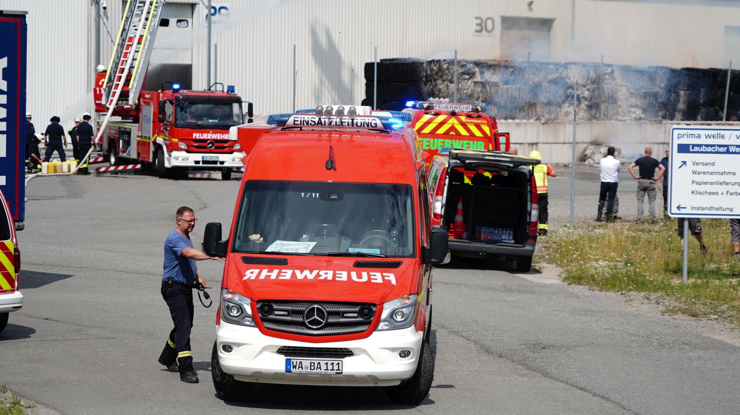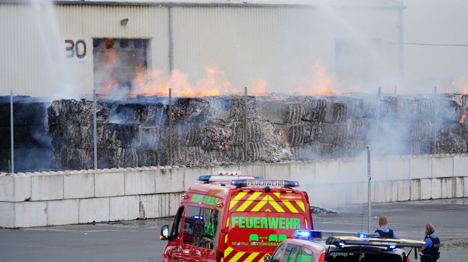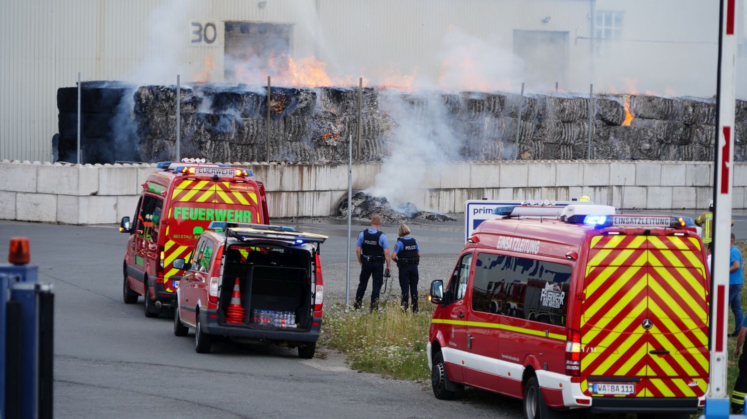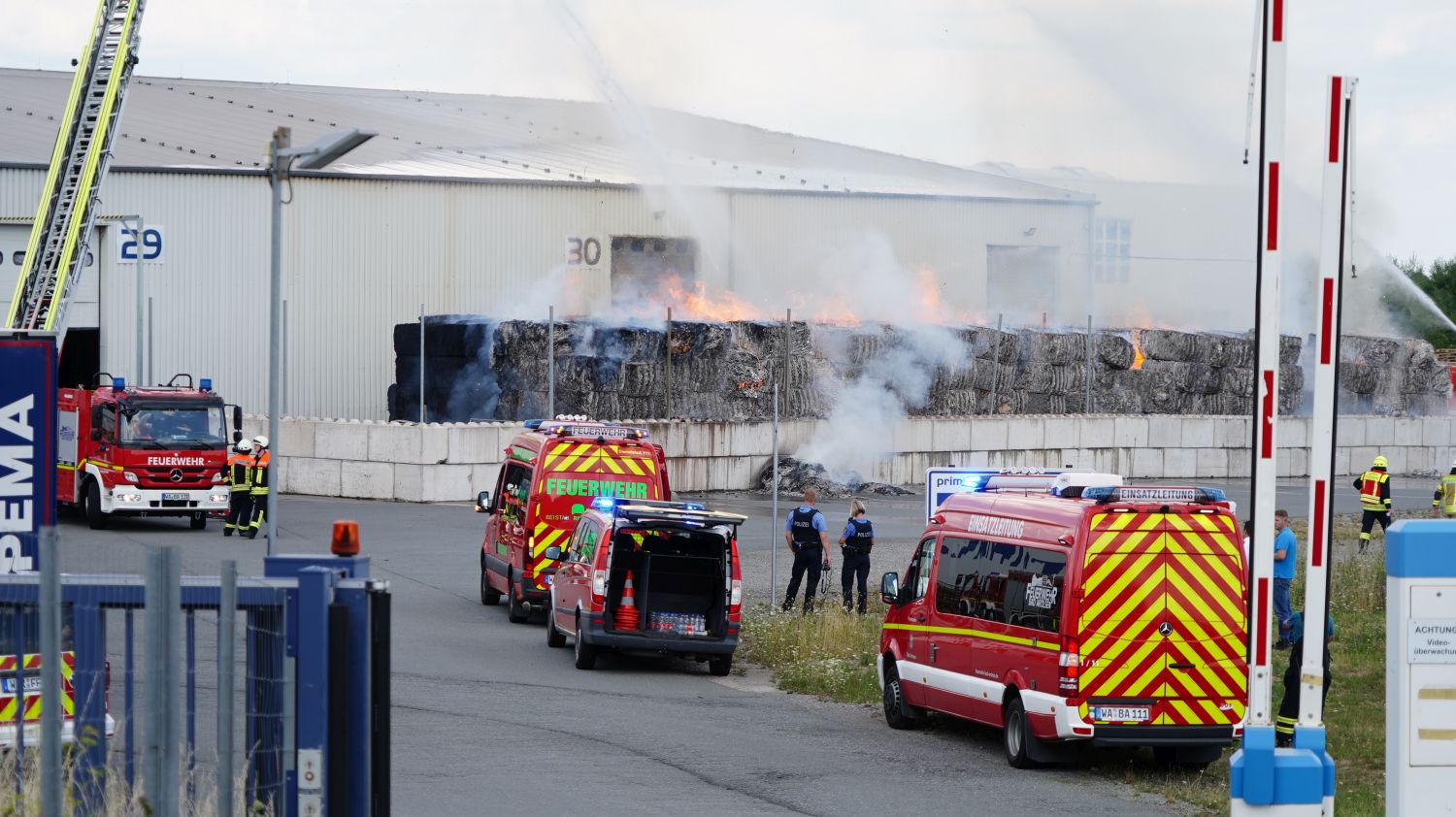 Diemelstadt – Zu einem Großbrand kam es am Donnerstagnachmittag gegen 14.15 Uhr in Diemelstadt-Rhoden. Bei einer Verpackungsfirma gerieten aus bislang noch unbekannten Gründen mehrere Papierballen in Brand. Die Flammen drohten auf einer nah liegenden Halle überzugreifen. Rund 100 Einsatzkräfte unter anderem auch aus dem angrenzendem Bundesland NRW konnten ein übergreifen der Flammen auf die Halle verhindern. Bei gut 38 Grad Celsius im Schatten eine schweißtreibende Arbeit, die noch mehrere Stunden andauern wird.