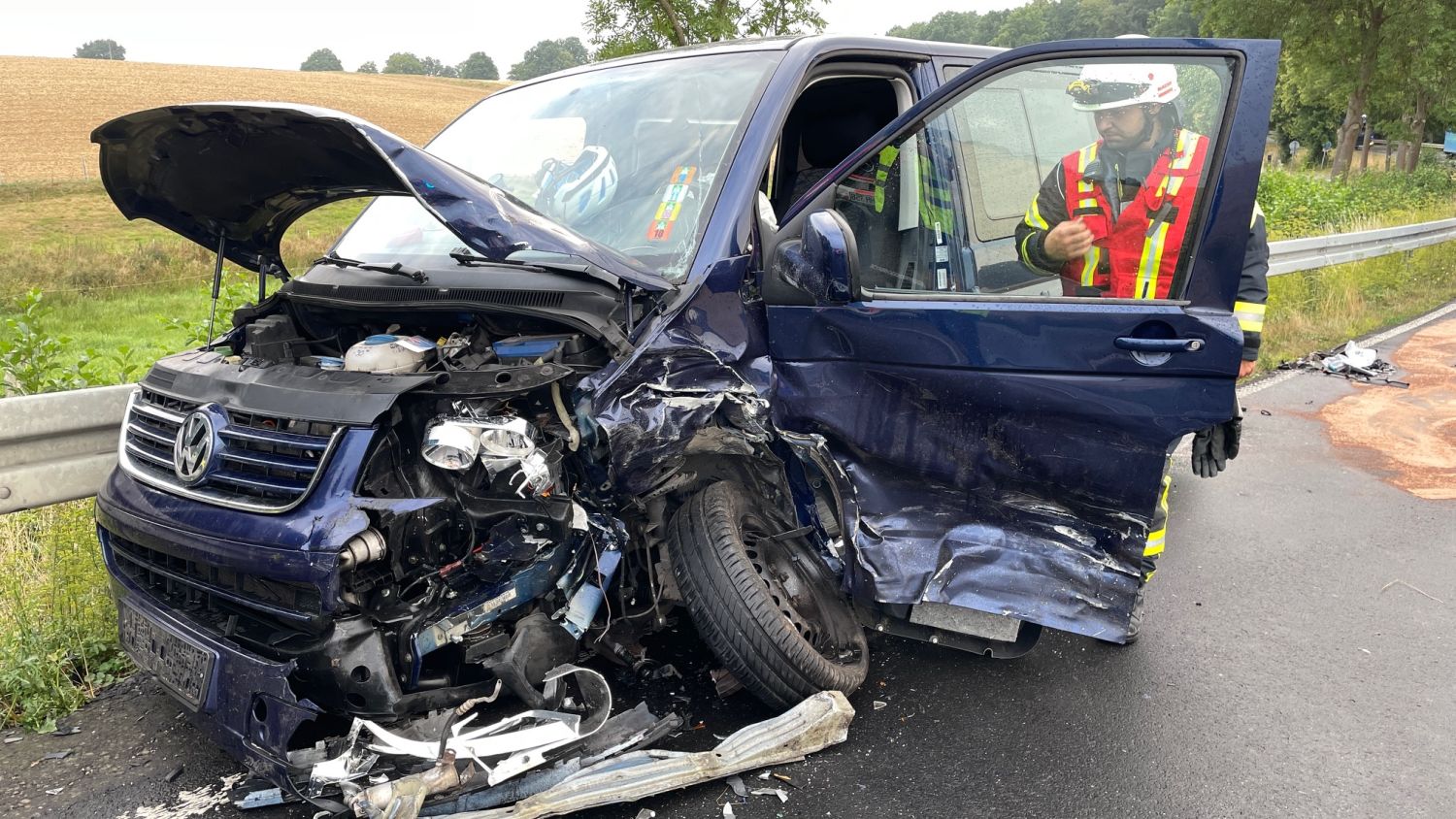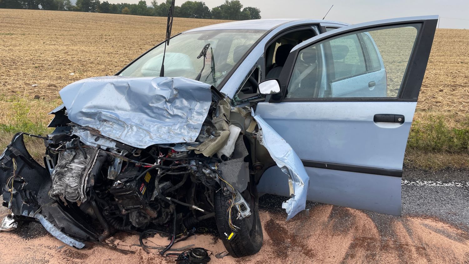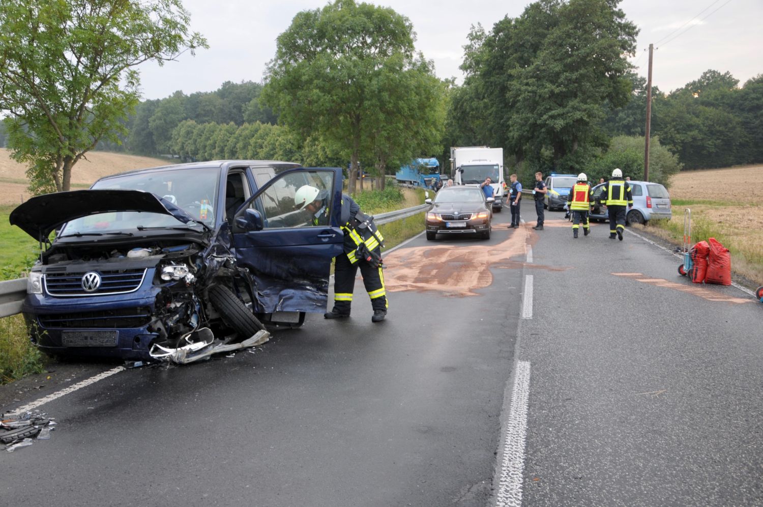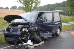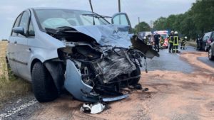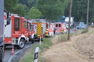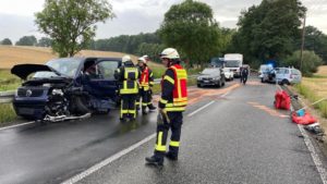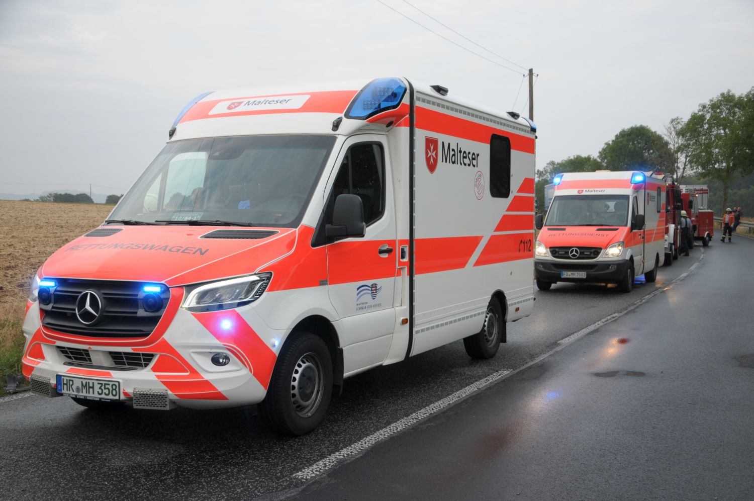 Jesberg – Zwei schwerverletzte Personen und ein Gesamtschaden in Höhe von 25.000 Euro ist die Bilanz eines Verkehrsunfalls am frühen Donnerstagabend auf der B 3 nahe Jesberg (Schwalm-Eder-Kreis). Zwei Fahrzeuge kollidierten frontal miteinander. Vermutlich war es ein Fahrfehler welcher am frühen Donnerstagabend zu einen Verkehrsunfall auf der Bundesstraße 3 zwischen Jesberg und dem Hofgut Richerode führte. Nach Informationen der Polizei Schwalmstadt befuhr eine 31-jährige Frau aus Neustadt mit ihrem Fahrzeug die Bundesstraße von Jesberg in Richtung Marburg. Nur wenige hundert Meter hinter Jesberg, geriet die Neustädterin vermutlich mit ihrem Fahrzeug nach rechts auf die Bankette, steuerte zunächst gegen und geriet schließlich in den Gegenverkehr. Dort kollidierte die 31 Jährige frontal mit dem Fahrzeug einer 71-jährigen Frau aus Hüttenberg. Beide Insassen wurden durch den Zusammenprall zwar schwer, keinesfalls aber lebensbedrohlich Verletzt. Zwei Rettungsteams der Malteser sowie ein Notarzt aus Stadtallendorf versorgten die Beiden und brachten sie in die Krankenhäuser nach Bad Wildungen und Schwalmstadt. Im Einsatz waren die Feuerwehr Jesberg, zwei Rettungsteams der Malteser aus Jesberg, ein Notarzt aus Stadtallendorf sowie die Polizei Schwalmstadt. An beiden Fahrzeugen entsandt Totalschaden. Die Polizei beziffert den Gesamtschaden auf rund 25.000 Euro. Die B 3 war für eineinhalb Stunden in beide Richtungen voll gesperrt. (mpu)