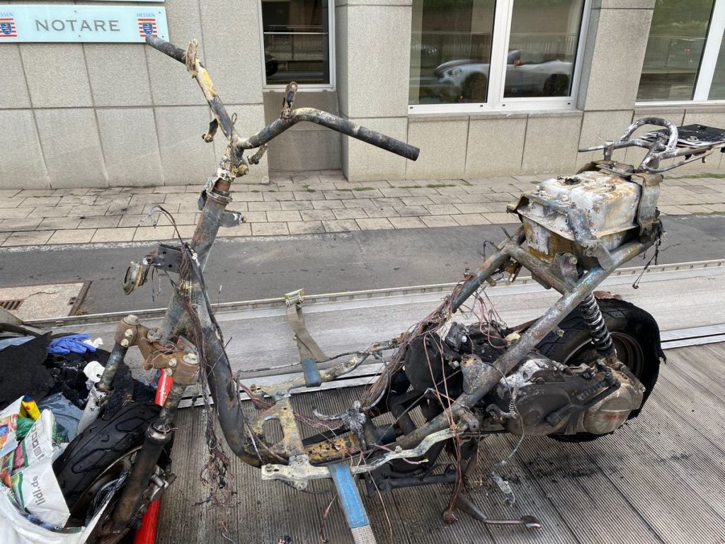 Kassel – Am Donnerstag gegen 16.30 Uhr geriet während der Fahrt ein Motorroller auf der Frankfurter Straße in Brand. Die Fahrerin konnte den Roller noch rechtzeitig in Höhe Friedrichspltz/Tiefgarage abstellen, bevor er komplett in Vollbrand stand. Sie blieb unverletzt. Die Feuerwehr Kassel konnte das Feuer schnell löschen.