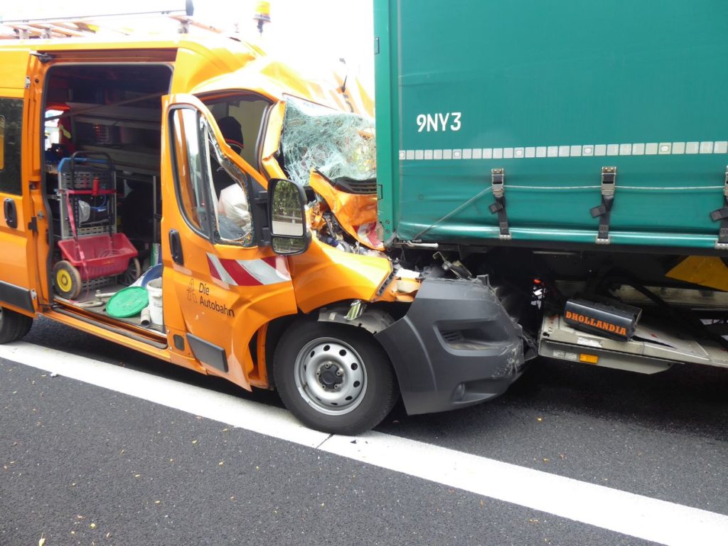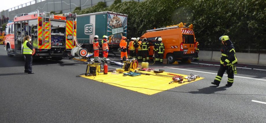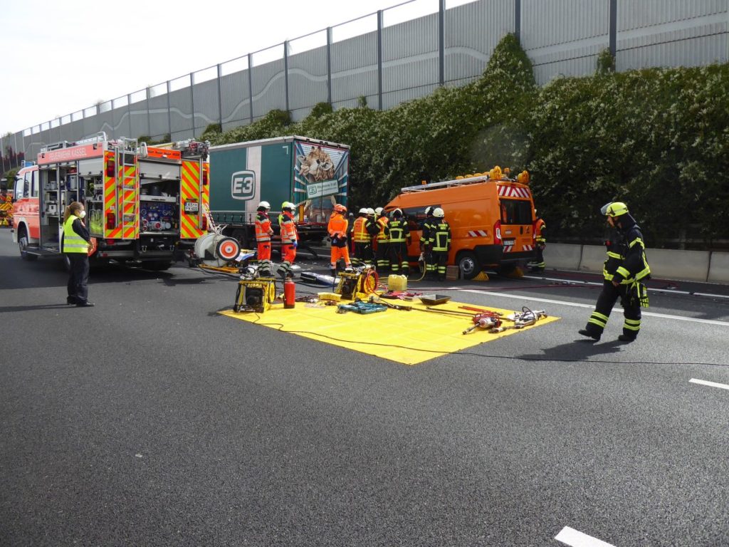 Kassel – Am Montagmorgen kam es auf der A 7 zwischen dem Autobahnkreuz Kassel-Mitte und der Anschlussstelle Kassel-Ost gegen 11:30 Uhr zu einem Auffahrunfall, bei dem ein Fahrer eines Fiat-Kleintransporters schwere, aber nicht lebensbedrohliche Verletzungen erlitt. Nach ersten Ermittlungen zu folge, war der 62-jährige Fahrer des Kleintransporters auf der A 7 in Richtung Nord unterwegs, als er auf den vorausfahrenden Sattelzug auffuhr. Hierbei wurde der Fahrer schwer verletzt und im Fahrzeug eingeklemmt. Mittels hydraulischen Rettungsgeräten und der Winde vom Rüstwagen konnte die Feuerwehr die verletzte Person dann aus dem Fahrzeug befreien. Die genauen Gründe für das Auffahren auf den Sattelzug, der nach derzeitigem Kenntnisstand mit geringer Geschwindigkeit auf der rechten Spur unterwegs war und möglicherweise eine Panne hatte, sind bislang nicht bekannt und nun Gegenstand der weiteren Ermittlungen. Der Sattelzug und der Kleintransporter wurden zur Erstellung eines technischen Gutachtens sichergestellt. Der 37-jährige Fahrer des Sattelzugs aus Kirgistan blieb unverletzt. Die Ermittlungen zum Unfallhergang dauern an. Die Autobahn musste zeitweise voll gesperrt werden, die Bergungsarbeiten zogen sich bis 15.30 Uhr.