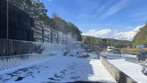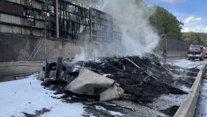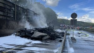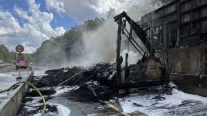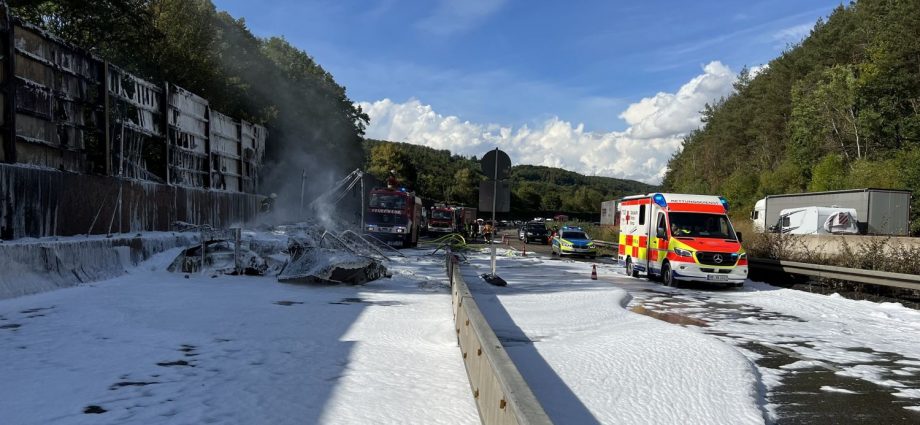 Homberg (Efze) – Am Mittwochmittag machten Autofahrer auf der A7 in Fahrtrichtung Süden gegen 13 Uhr den Fahrer eines mit Reifen beladenen Sattelzuges darauf aufmerksam, dass mit seinem Fahrzeug etwas nicht stimmen würde. Obwohl sich der Sattelzug gerade im Baustellenbereich zwischen Homberg-Efze und Bad Hersfeld-West befand entschloss sich der Fahrer zum Glück, sofort anzuhalten. Der rumänische Fahrer stieg aus und erkannte Rauch, der von seinem Auflieger aufstieg. Er sattelte seinen Auflieger ab und brachte seine Zugmaschine in Sicherheit, als auch schon Flammen aus dem Auflieger schlugen. Von mehreren Anrufern wurden bei der Rettungsleitstelle der brennende Sattelzug gemeldet. Beim Eintreffen der alarmierten Feuerwehr aus Homberg-Efze an der Einsatzstelle stand der Sattelauflieger bereits im Vollbrand. Der Einsatzleiter entschied sich sofort, für die Brandbekämpfung auch die Wehren aus Bad Hersfeld und Melsungen nachzualarmieren.