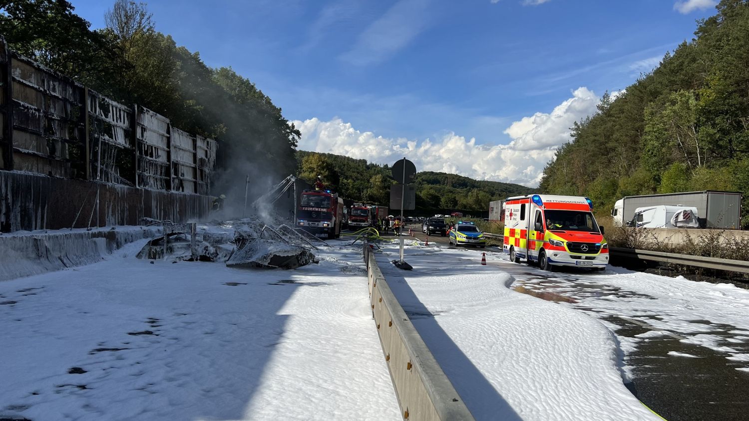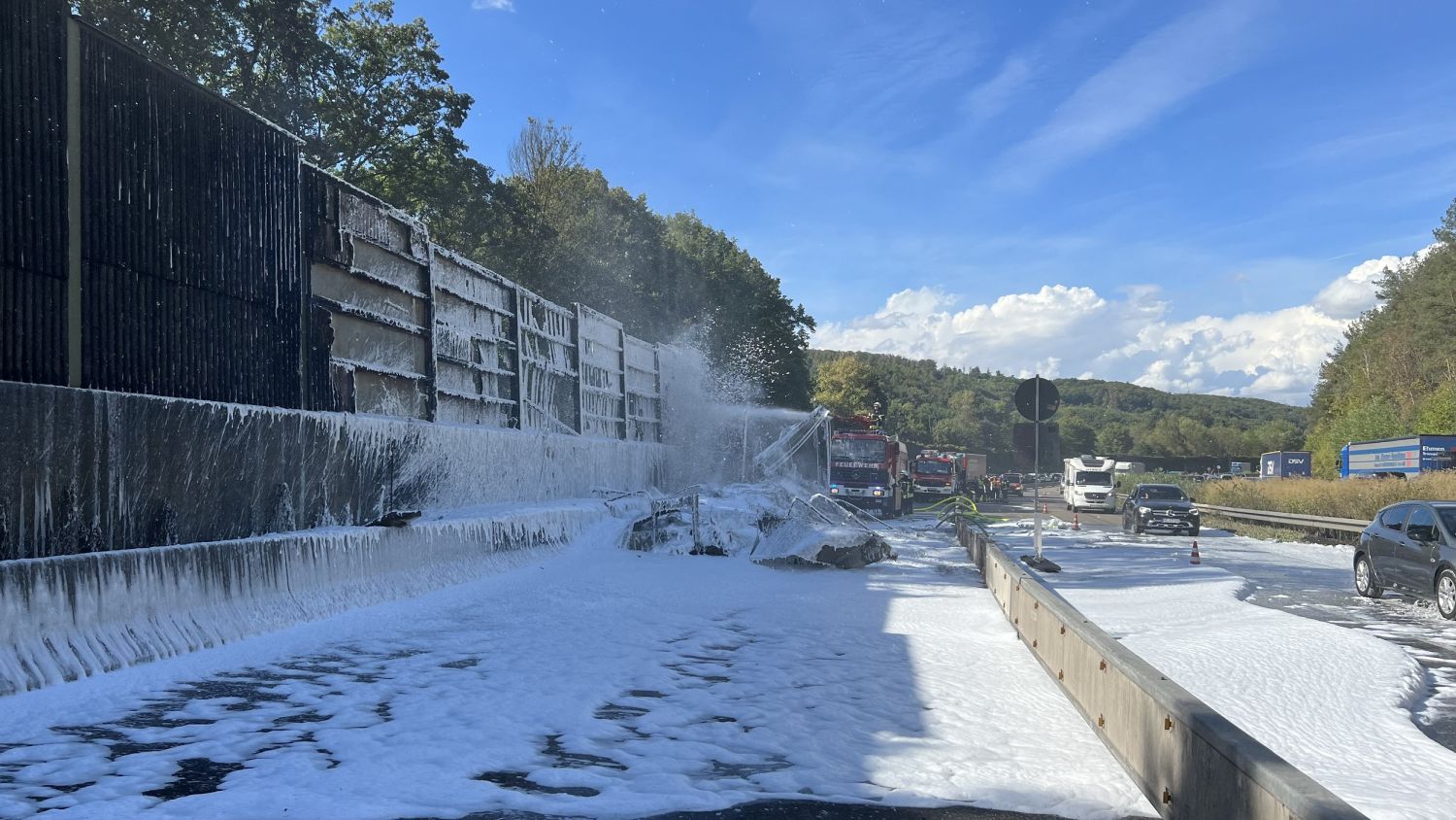 Mit massivem Löscheinsatz gingen die Einsatzkräfte erst mit Wasser und in der Folge mit Löschschaum gegen die Flammen vor. Aufgrund der starken Hitze und den lodernden Flammen entzündete sich auch die hölzerne Lärmschutzwand neben der Autobahn und die dahinterliegende Böschung. Hier mussten zur Brandbekämpfung zusätzlich die Feuerwehren aus Knüllwald und Schwarzenborn alarmiert werden. Während des gesamten Einsatzes musste die Richtungsfahrbahn Süd voll gesperrt werden. Aufgrund der starken Rauchentwicklung wurde auch die Fahrtrichtung Norden für ca. eine Stunde für den Fahrzeugverkehr gesperrt. Nach ca. 2 Stunden wurden alle Fahrzeuge, die zwischen Homberg-Efze und Bad Hersfeld-West im Stau standen, an der Einsatzstelle vorbeigeführt, um medizinischen Vorfällen aufgrund der hohen Temperaturen vorzugreifen. Für die Bergung des Aufliegers und der verbrannten Reifen wurde ein Bergeunternehmen beauftragt. Nach Aussage des Feuerwehr Einsatzleiters wird die A7 an der Einsatzstelle in Fahrtrichtung Süden noch bis in die Abendstunden voll gesperrt werden. Ein technischer Defekt am Auflieger ist vermutlich die Ursache für den Brand. Der Sachschaden, so schätzt die Polizei, wird vermutlich im unteren sechsstelligen Bereich liegen. Die Feuerwehr war mit über 75 Einsatzkräften im Einsatz.
