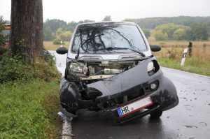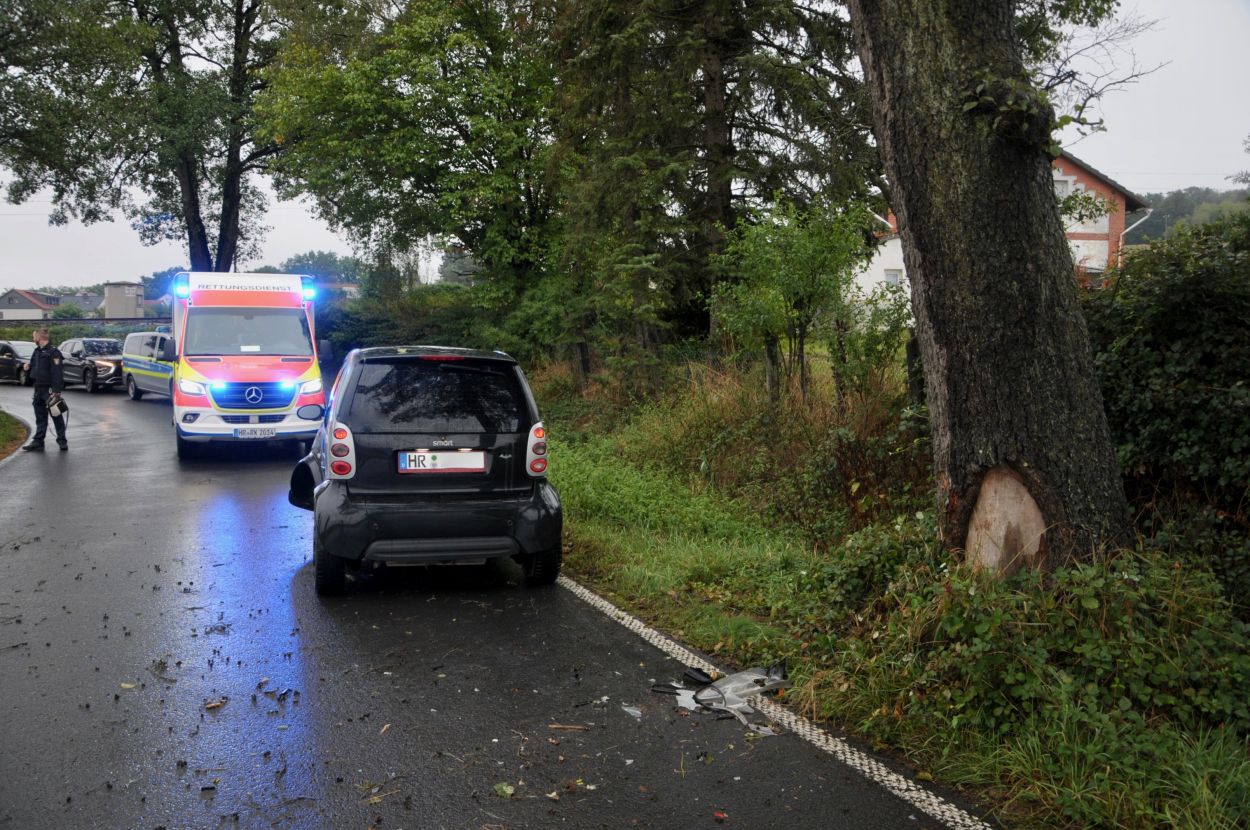 Schwalmstadt – Eher leichte Verletzungen zog sich ein 19-jährige Fahrerin aus Schwalmstadt bei einem Verkehrsunfall zwischen Allendorf-Landsburg und Dittershausen am Mittwoch zu. Aus bislang ungeklärten Umständen kam die junge Frau mit ihrem Fahrzeug von der Fahrbahn ab und kollidierte mit einem Baum. Die Schwalmstädterin war mit ihrem Fahrzeug von Allendorf-Landsburg in Richtung Dittershausen unterwegs, als sie aus bislang ungeklärten Umständen Ausgangs einer Rechtskurve über die Gegenfahrbahn fuhr und dort mit einem Baum kollidierte. Während das Fahrzeug erheblich beschädigt wurde, zog sich die 19 Jährige durch den Aufprall eher leichte Verletzungen zu. Bis zum Eintreffen des Rettungsdienstes kümmerten sich Ersthelfer um die Verunfallte, welche ihr Fahrzeug eigenständig verlassen konnte. Der Rettungsdienst brachte die Schwalmstädterin nach ihrer Erstversorgung ein umliegendes Krankenhaus. Auf der K 103 kam es während der Rettungs- und Bergungsmaßnahmen zu kurzfristigen Vollsperrungen. Im Einsatz waren ein Rettungswagen, ein Notarzt, sowie die Polizei Schwalmstadt. Zur Unfallursache konnten vor Ort keine abschließenden Angaben gemacht werden. (mpu)