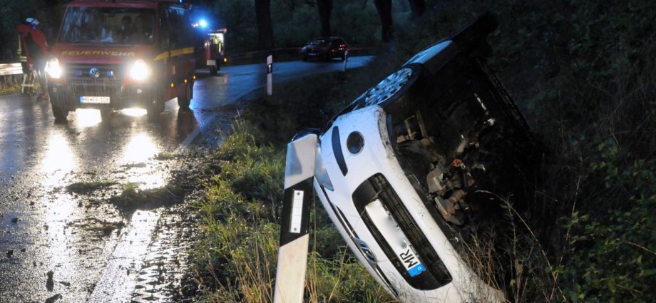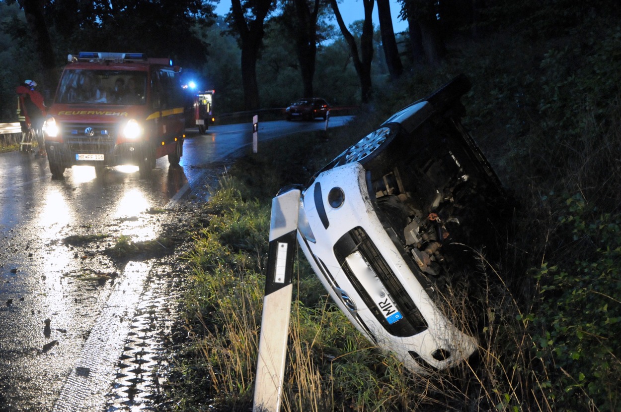 Schwalmstad – Zu einem Verkehrsunfall mit einer leichtverletzten Person kam es am frühen Sonntagabend auf der Bundesstraße 454 zwischen Schwalmstadt-Wiera und Neustadt. Eine 18-jährige Frau aus dem Landkreis Marburg Biedenkopf verlor in einer Linkskurve die Kontrolle über ihr Fahrzeug und landete im Straßengraben. Die junge Frau war mit ihrem Kleinwagen bei strömenden Regen von Wiera in Richtung Neustadt unterwegs, als sie nur wenige hundert Meter hinter dem Schwalmstädter Ortsteil in einer scharfen Linkskurve plötzlich die Kontrolle über ihr Fahrzeug verlor. Ihr Fahrzeug schleuderte quer über die Fahrbahn und kam am Ende auf der Fahrerseite liegen in einem tiefen Straßengraben zum Stillstand. Aufgrund der Unfallmeldung wurde der Unfallzug der Feuerwehr Schwalmstadt alarmiert, da zunächst von einer eingeklemmten Person ausgegangen wurde. Die junge Frau konnte aber in der Zwischenzeit ihr Fahrzeug selbstständig verlassen, so dass ein eingreifen der Brandschützer nicht mehr notwendig war. Während die Verunfallte in die Obhut des Rettungsdienstes übergeben wurde, sicherte die Feuerwehr die Unfallstelle ab. Mit leichten Verletzungen wurde die 18 Jährige in das Klinikum Schwalmstadt gebracht. Die Unfallursache ist vermutlich den Witterungsverhältnissen nicht angepasste Geschwindigkeit. Am Fahrzeug entstand wirtschaftlicher Totalschaden. Die Bundesstraße war während der Rettungs- und Bergungsmaßnahmen für etwa eine Stunde voll gesperrt. (mpu)