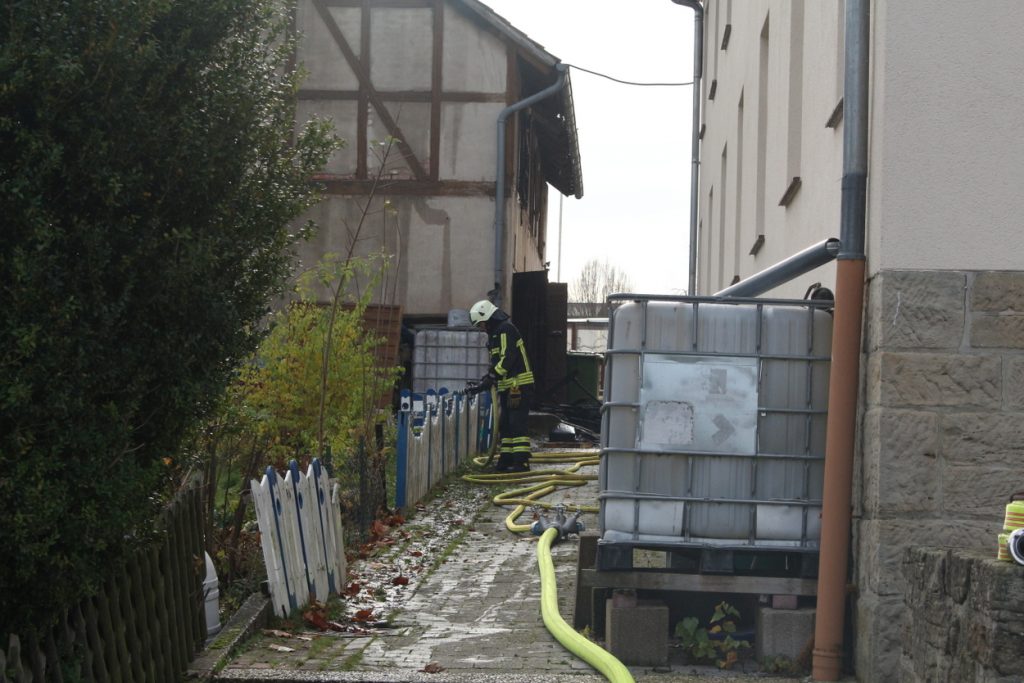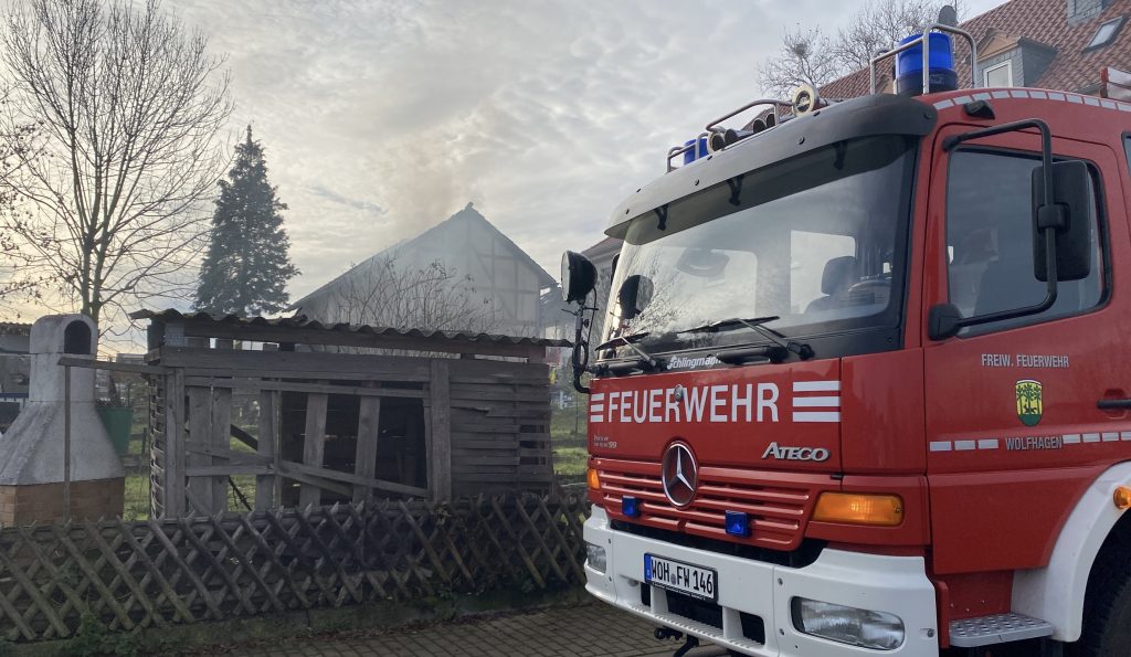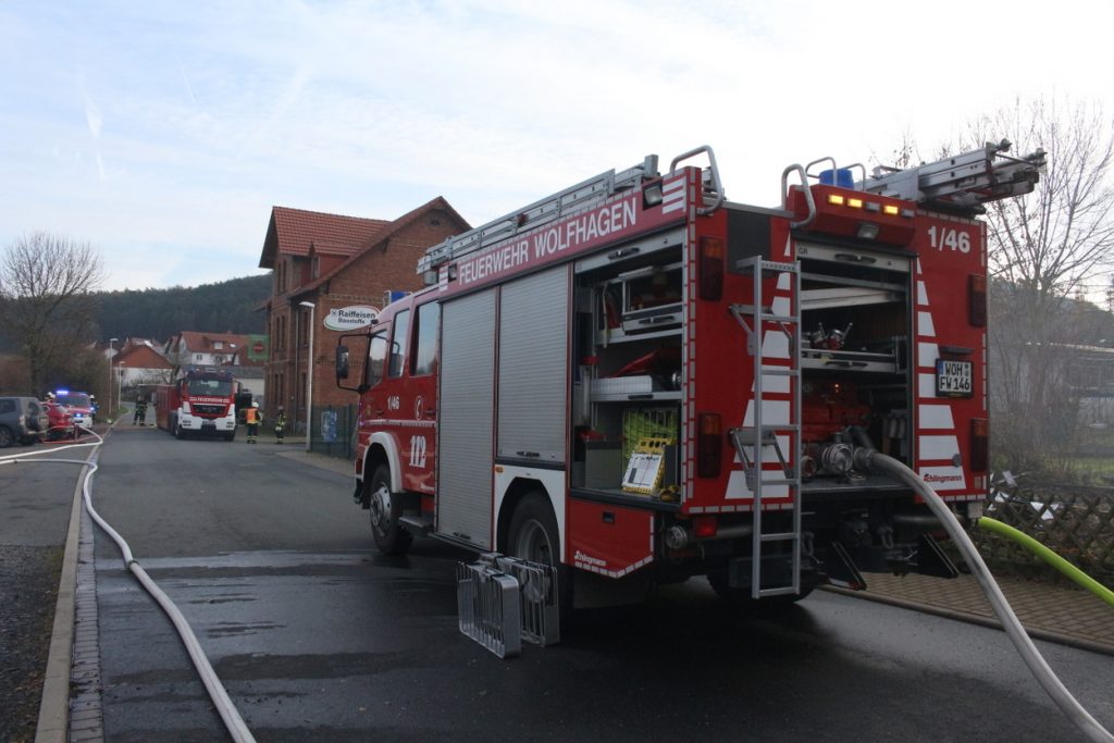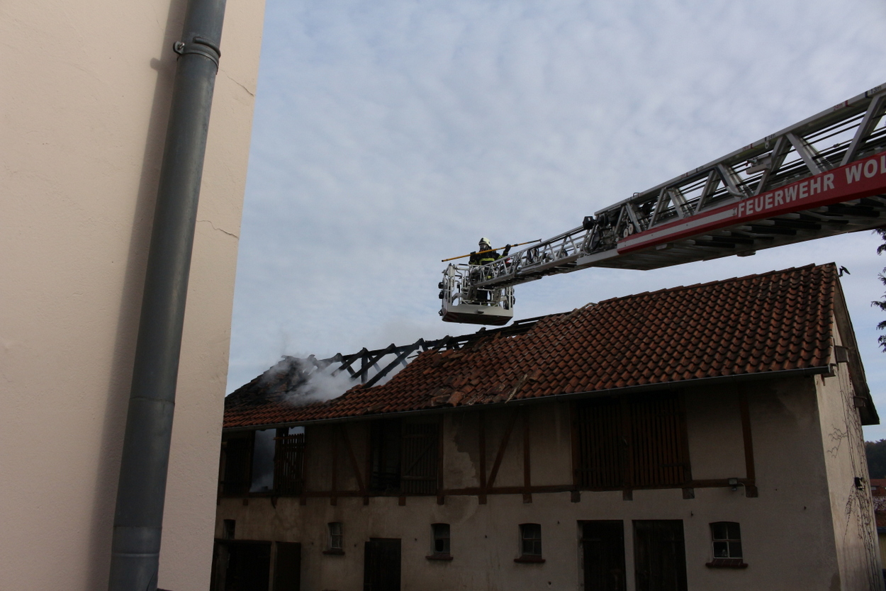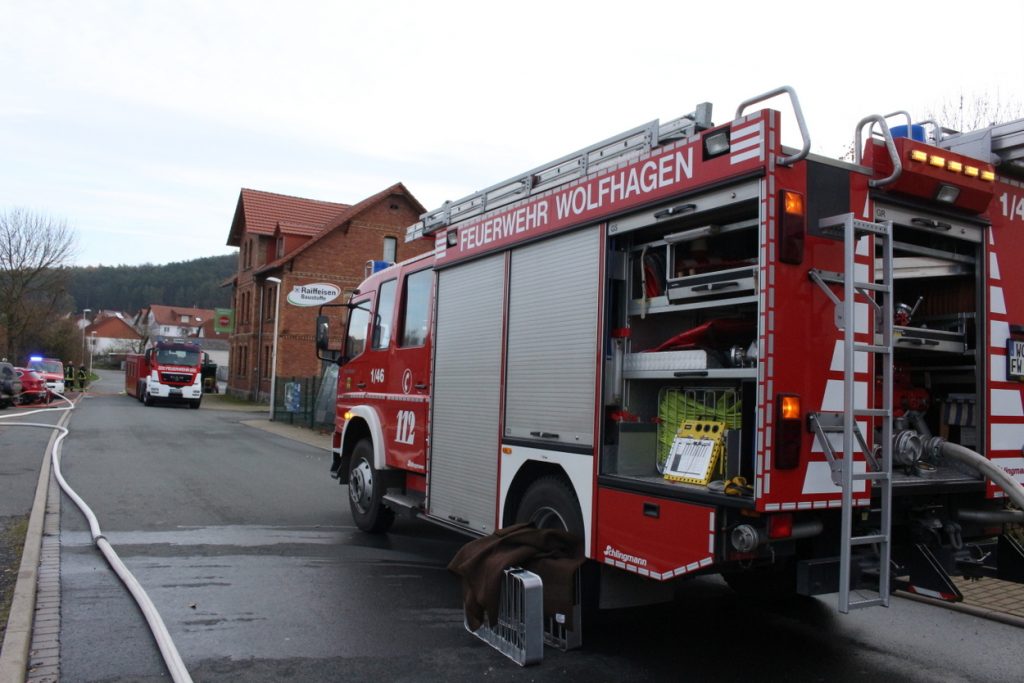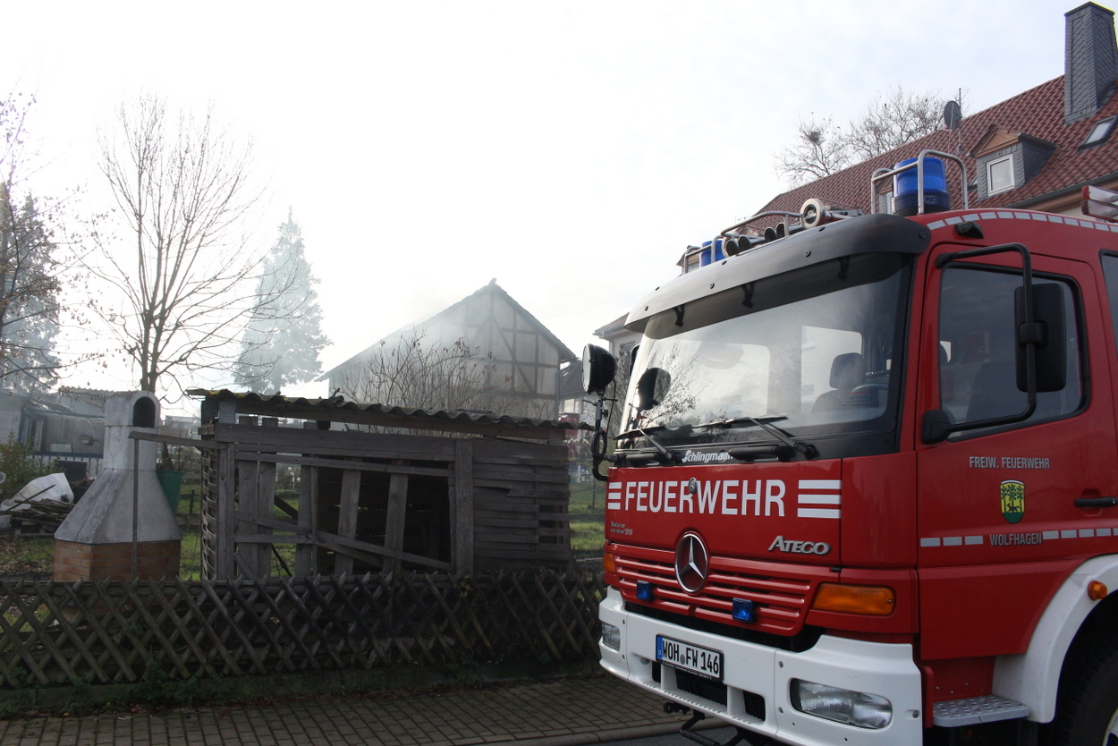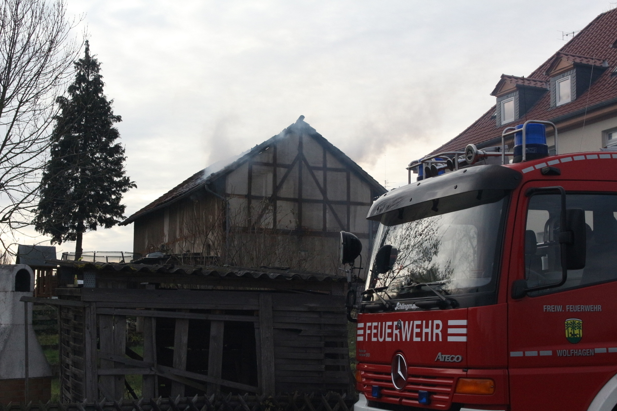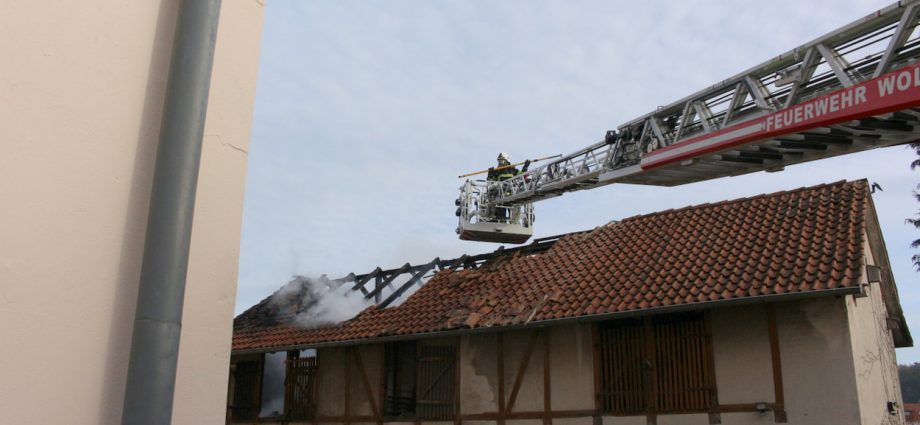 Wolfhagen – gegen 09:45 Uhr kam es in der Friedrichstraße in Wolfhagen zu einem Brand einer Scheune, beim Eintreffen der Einsatzkräfte stand das Dachgeschoss der Scheune schon in Vollbrand. Menschen waren nicht betroffen. Die Feuerwehr Wolfhagen fing daraufhin mit einem umfangreichen Löschangriff an, mit der Drehleiter wurde der Brand von oben gelöscht. Der Brand konnte relativ schnell unter Kontrolle gebracht werden. Die Nachlöscharbeiten gestalteten sich aufwendig, da das Brandgut noch aus der Scheune gebracht und außen abgelöscht werden musste. Es waren rund 35 Einsatzkräfte der Feuerwehr Wolfhagen und Nothfelden im Einsatz. Wie hoch der Sachschaden beziffert wird, ist zum aktuellen Zeitpunkt noch unklar.