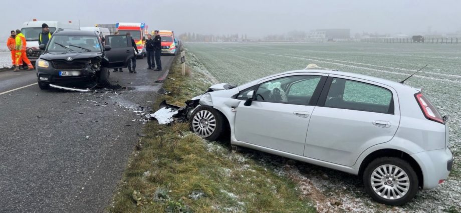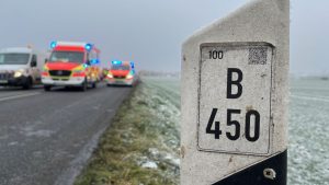 Fritzlar – Zu einer Frontalkollision kam es am Dienstagmittag auf der Bundesstraße 450 zwischen Fritzlar und der Zufahrt zur Bundesstraße 253. Ersten Erkenntnissen zur Folge befuhr zunächst eine 68-jährige Verkehrsteilnehmerin aus Waldeck-Frankenberg die Bundesstraße in Richtung Borken. Auf der geraden Strecke beabsichtigte die Frau eine in gleicher Fahrtrichtung stehende Baustellenkolonne zu überholen. Als sie diese beinahe vollständig passiert hatte, kam ihr der PKW eines 98-jährigen Mannes entgegen. Beide Fahrzeuge kollidierten Frontal miteinander. Während die 68 Jährige mit ihrem Fahrzeug auf der Gegenspur zum stillstand kam, landete der 98-jährige Fahrzeugführer sowie seine 93-jährige Beifahrerin auf einem angrenzenden Acker. Durch die Kollision wurden alle drei Insassen schwer, glücklicherweise aber nicht lebensbedrohlich Verletzt. Ersthelfer, darunter die Arbeiter der Baustellenkolonne, leisteten bis zum Eintreffen. des Rettungsdienstes Erste-Hilfe. Nach ihrer Versorgung an der Unfallstelle, wurde alle Beteiligten durch den Rettungsdienst in umliegende Krankenhäuser transportiert Im Einsatz waren drei Rettungswagen, zwei Notärzte, ein Leitender Notarzt, ein Organisatorischer Leiter Rettungsdienst sowie Beamte der Polizeistation Fritzlar. Die Bundesstraße war während der Rettungs- und Bergungsmaßnahmen zeitweise voll gesperrt. Den Gesamtschaden beziffert die Polizei auf rund 25.000 Euro. (mpu)