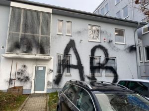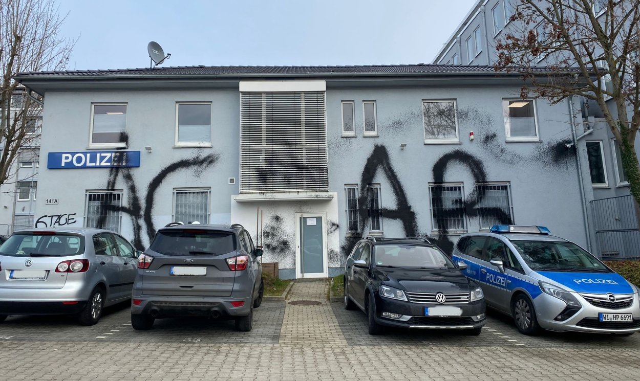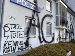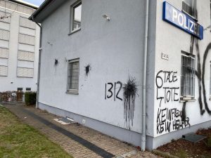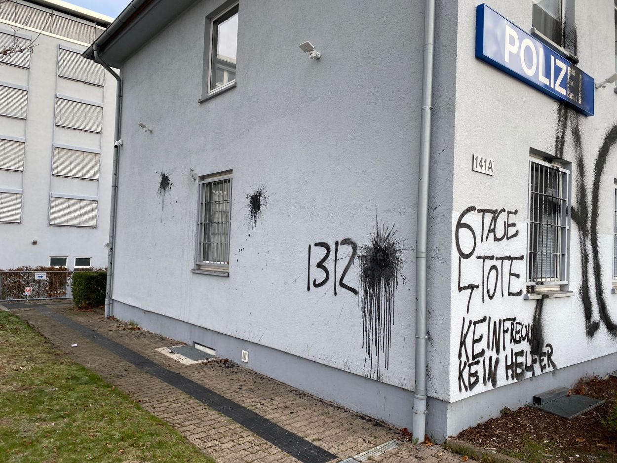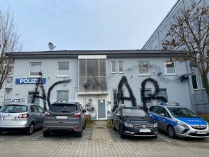 Kassel – Unbekannte haben in der vergangenen Nacht ein Polizeigebäude in der Kasseler Nordstadt durch großflächige Graffiti beschädigt. Die Täter sprühten „ACAB“, „1312“ sowie weitere Schriftzüge in schwarzer Farbe an zwei Fassaden und Fenster des Gebäudes. Zudem warfen sie Beutel mit schwarzer Farbe an die Hauswand. Nach derzeitigem Ermittlungsstand hatte sich die Tat in der Zeit zwischen Mitternacht und 3:30 Uhr ereignet. Zu dieser Zeit stellte eine Streife des Polizeireviers Nord die noch nicht vollständig getrockneten Farbschmierereien an dem Gebäude in der Holländischen Straße 141 A fest, in der sich die EG 6 der Regionalen Ermittlungsgruppe der Kasseler Polizei befindet. Die Wache ist nur tagsüber besetzt. Aufgrund der Höhe des Schriftzugs „ACAB“ von ca. 4 Metern, der sich nahezu über die gesamte Breite des Gebäudes erstreckt, ist davon auszugehen, dass die Täter eine Leiter genutzt haben. Aufschluss über den genauen Tatablauf soll nun auch die Auswertung einer Überwachungskamera geben. Da eine politische Motivation erkennbar ist, haben die Beamten der Kriminalinspektion Staatsschutz des Polizeipräsidiums Nordhessen die weiteren Ermittlungen übernommen. Zeugen, die im Tatzeitraum verdächtige Beobachtungen im Tatortbereich gemacht haben und Hinweise auf die Täter geben können, melden sich bitte bei der Kasseler Polizei unter Tel. 0561-9100.