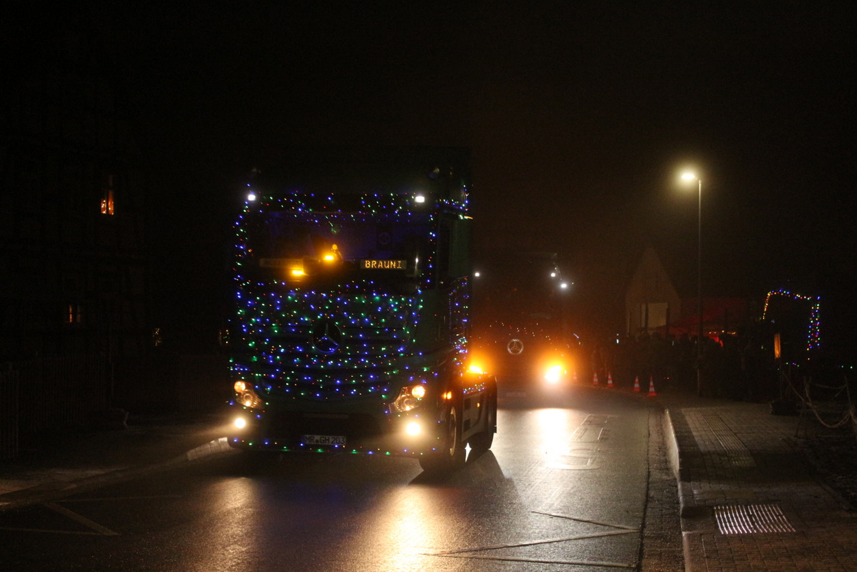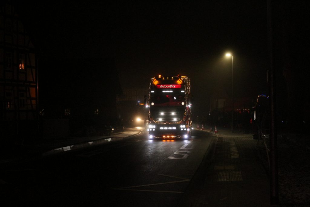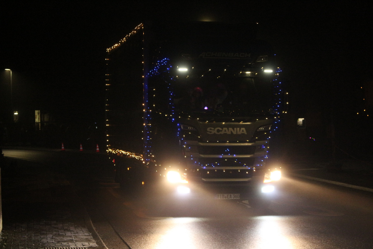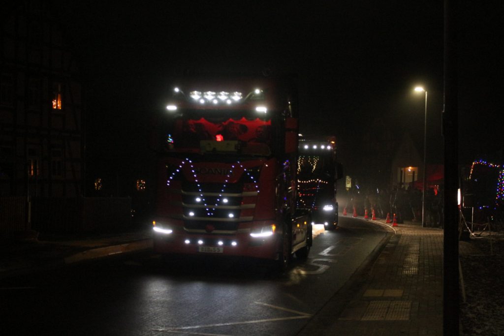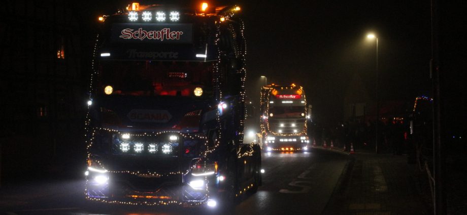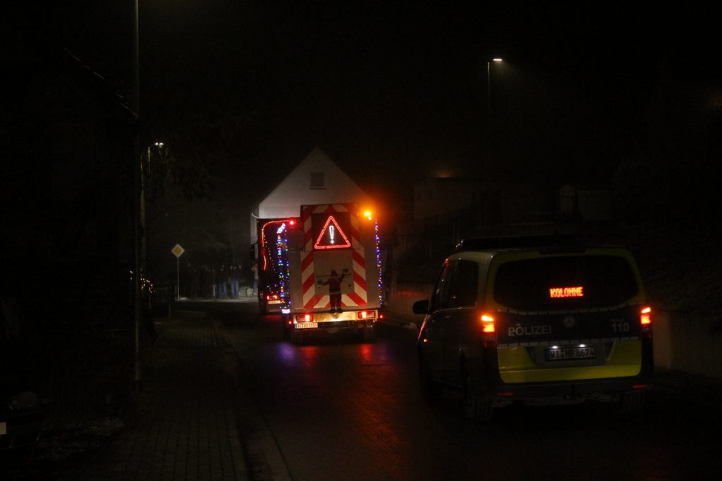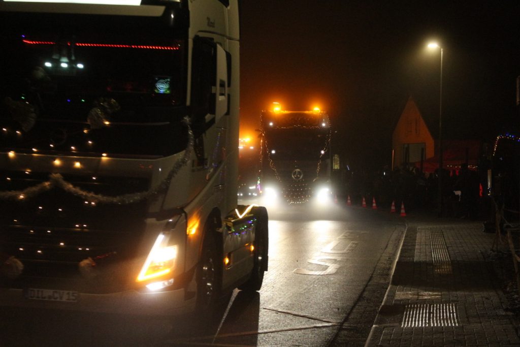 Marburg – Am Samstag dem 17. Dezember fuhren mehr als 100 weihnachtlich geschmückte Trucks mehrere Stunden durch den Landkreis Marburg-Biedenkopf. Die LKW von dem dritten Wheinachtskonvoi wurden mit unzähligen Lichterketten und Weihnachtsschmuck zurechtgemacht. Entlang der rund 70 Kilometer langen Route durch den Landkreis, verfolgten unzählige Menschen das weihnachtliche Spektakel. Nicht einmal die eisigen Temperaturen konnten die vielen Zuschauerinnen und Zuschauer davon abhalten. Gegen 17 Uhr machte sich der Lkw-Konvoi aus Breidenbach auf den Weg in Richtung Marburg Messeplatz. In fast jedem Dorf der Route entlang gab es für die Zuschauerinnen und Zuschauer warme Speisen und Getränke. Während der gesamten Fahrt hielten die Trucker immer wieder an, damit Spenden entgegengenommen werden konnten. Das gesammelte Geld geht dieses Jahr an den ambulanten Kinder- und Jugendhospizdienst in Marburg. Gegen 21:30 Uhr trafen die Trucks dann nach und nach bei ihrer letzten Station am Messeplatz in Marburg ein. Nach rund 5 Stunden war das Spektakel vorbei.