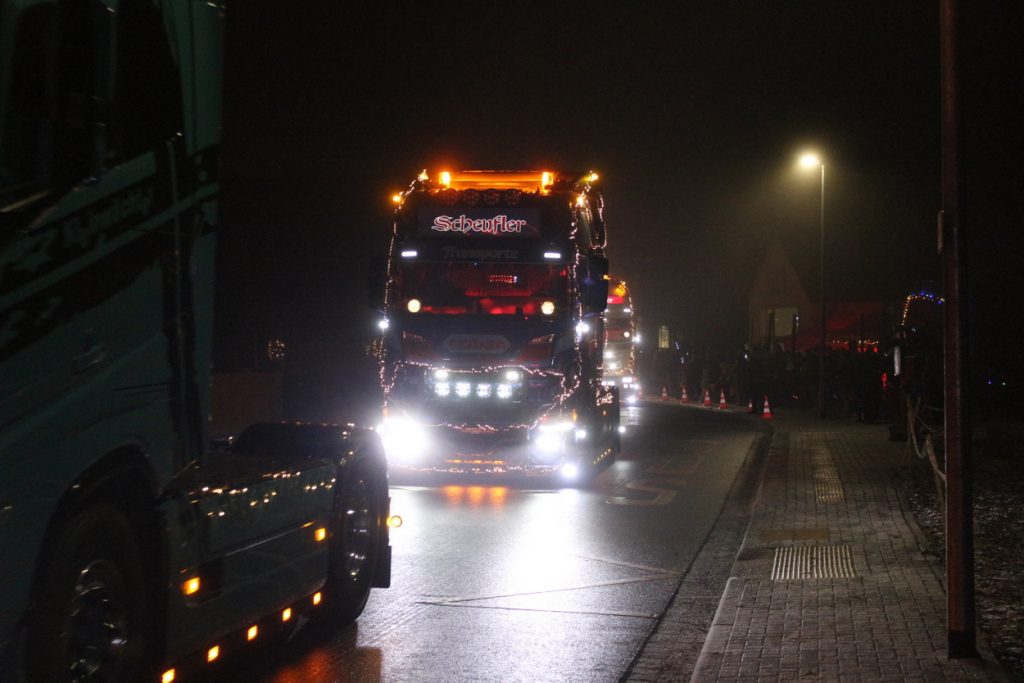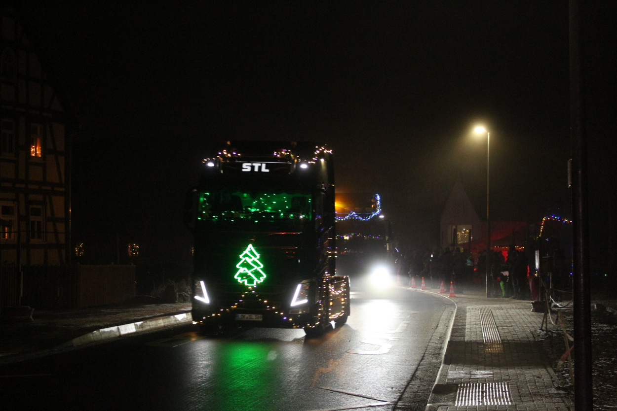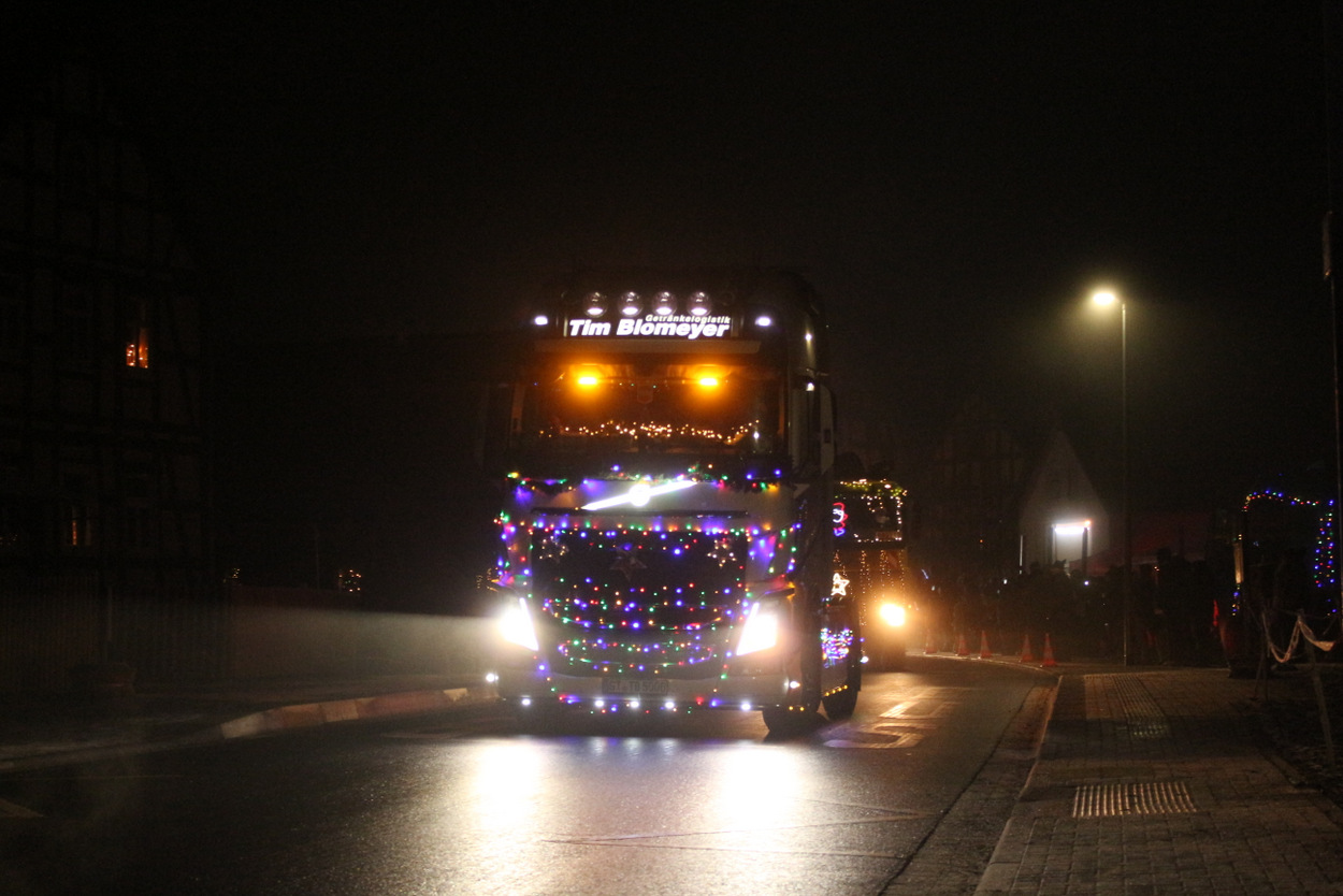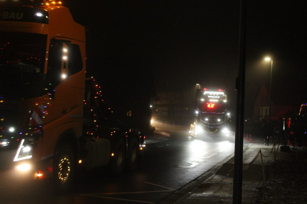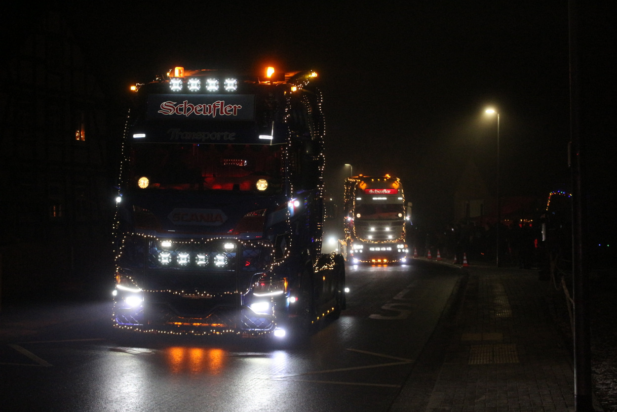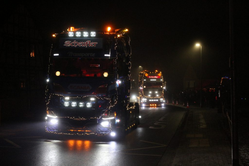 Marburg – Am Samstag dem 17. Dezember fuhren mehr als 100 weihnachtlich geschmückte Trucks mehrere Stunden durch den Landkreis Marburg-Biedenkopf. Die LKW von dem dritten Wheinachtskonvoi wurden mit unzähligen Lichterketten und Weihnachtsschmuck zurechtgemacht. Entlang der rund 70 Kilometer langen Route durch den Landkreis, verfolgten unzählige Menschen das weihnachtliche Spektakel. Nicht einmal die eisigen Temperaturen konnten die vielen Zuschauerinnen und Zuschauer davon abhalten. Gegen 17 Uhr machte sich der Lkw-Konvoi aus Breidenbach auf den Weg in Richtung Marburg Messeplatz. In fast jedem Dorf der Route entlang gab es für die Zuschauerinnen und Zuschauer warme Speisen und Getränke. Während der gesamten Fahrt hielten die Trucker immer wieder an, damit Spenden entgegengenommen werden konnten. Das gesammelte Geld geht dieses Jahr an den ambulanten Kinder- und Jugendhospizdienst in Marburg. Gegen 21:30 Uhr trafen die Trucks dann nach und nach bei ihrer letzten Station am Messeplatz in Marburg ein. Nach rund 5 Stunden war das Spektakel vorbei.