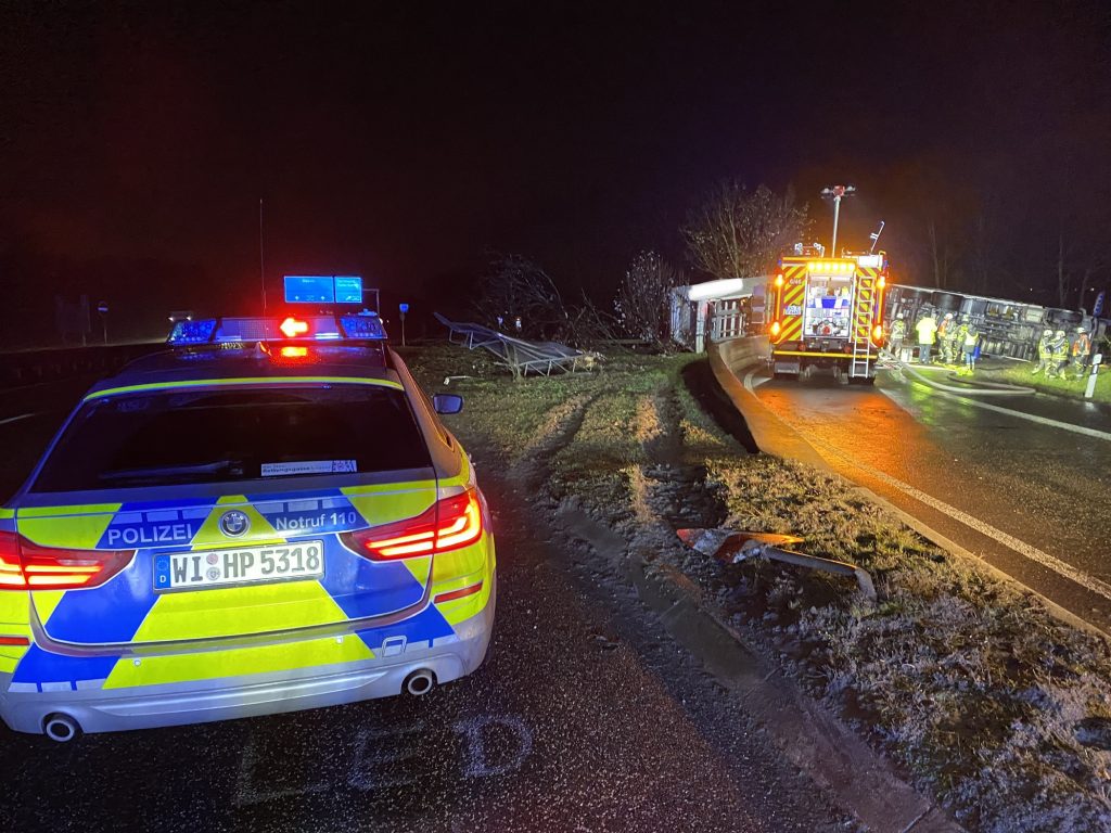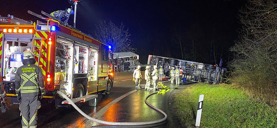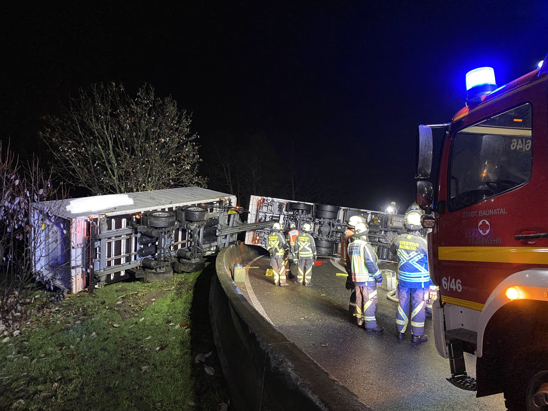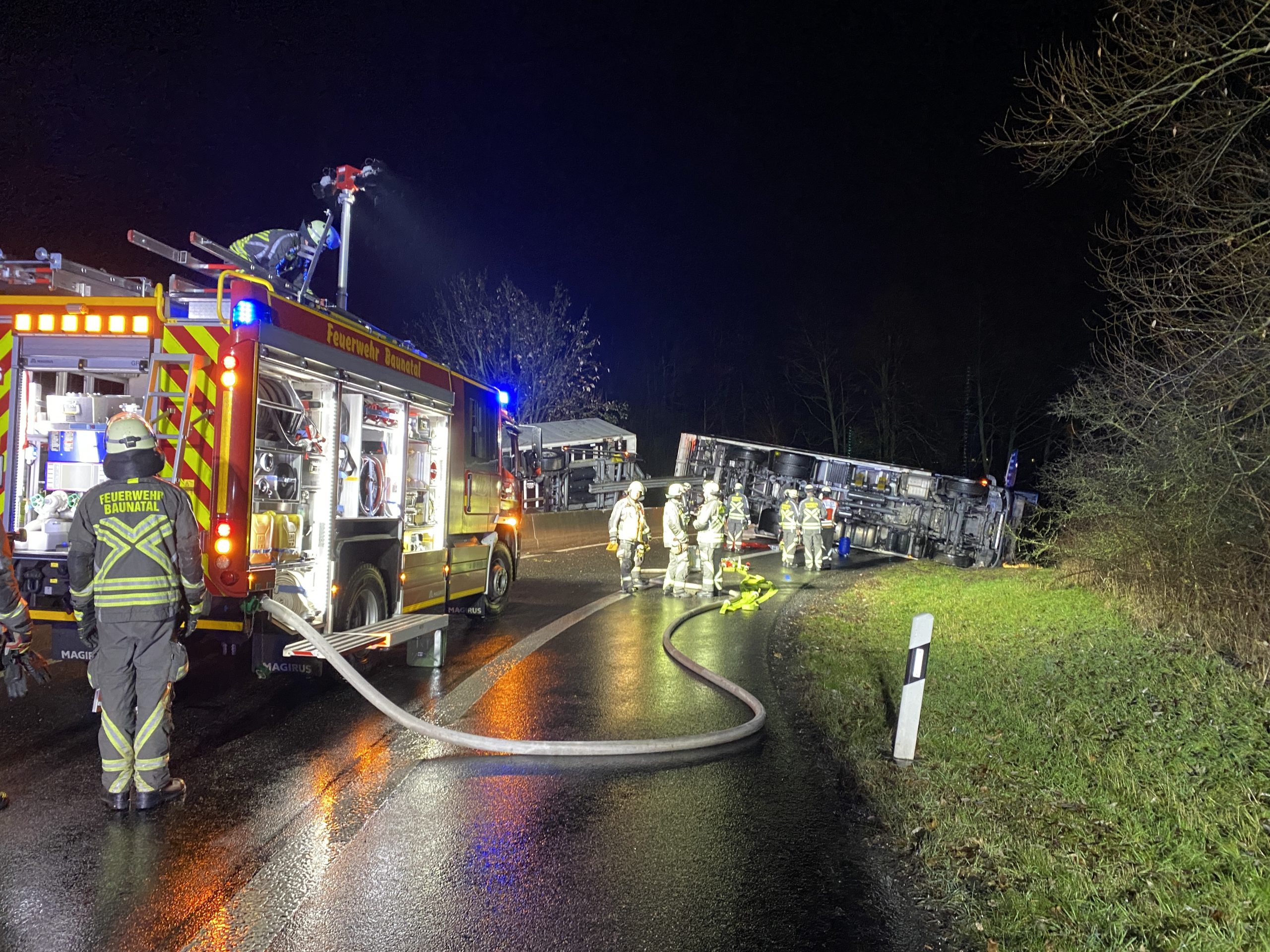 Baunatal/A49 – in der Nacht zum Mittwoch gegen 00:05 Uhr kam es am Autobahnkreuz Kassel West zu einem Alleinunfall eines LKW mit Anhänger. Der LKW befuhr die A49 in Fahrtrichtung Kassel und wollte auf die A44 in Fahrtrichtung A7 auffahren. In der Kurve kam der LKW zunächst nach rechts auf die dortige Bankette von der Fahrbahn ab und fuhr im Anschluss gegen die linksseitig vorhandene Betonleitplanke. Hiernach kippte er auf die linke Seite. Die dortige Fahrbahn wurde dadurch komplett blockiert. Der Fahrer des LKW wurde durch den Unfall nicht verletzt. Aus dem LKW traten etwa 200 Liter Dieselkraftstoff aus. Das verunreinigte Erdreich wird im Laufe des Tages durch die zuständige Autobahn- GmbH des Bundes fachgerecht entsorgt. Weiterhin waren auch die Feuerwehr Baunatal Altenbauna, Kirchbauna, Rengershausen und Mitarbeiter der Unteren Wasserbehörde vor Ort. Die Unfallursache ist bislang noch nicht bekannt, der Sachschaden wird auf ca. 85.000 Euro beziffert. Die Bergungs- und Reinigungsarbeiten dauern bis in die frühen Morgenstunden an.