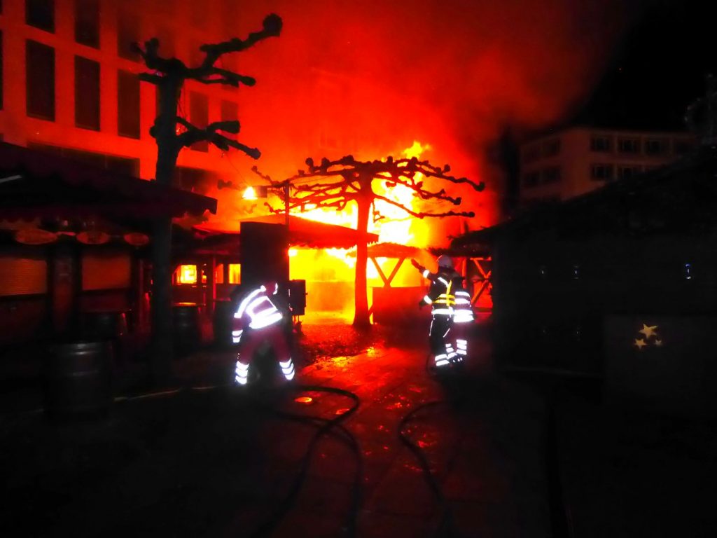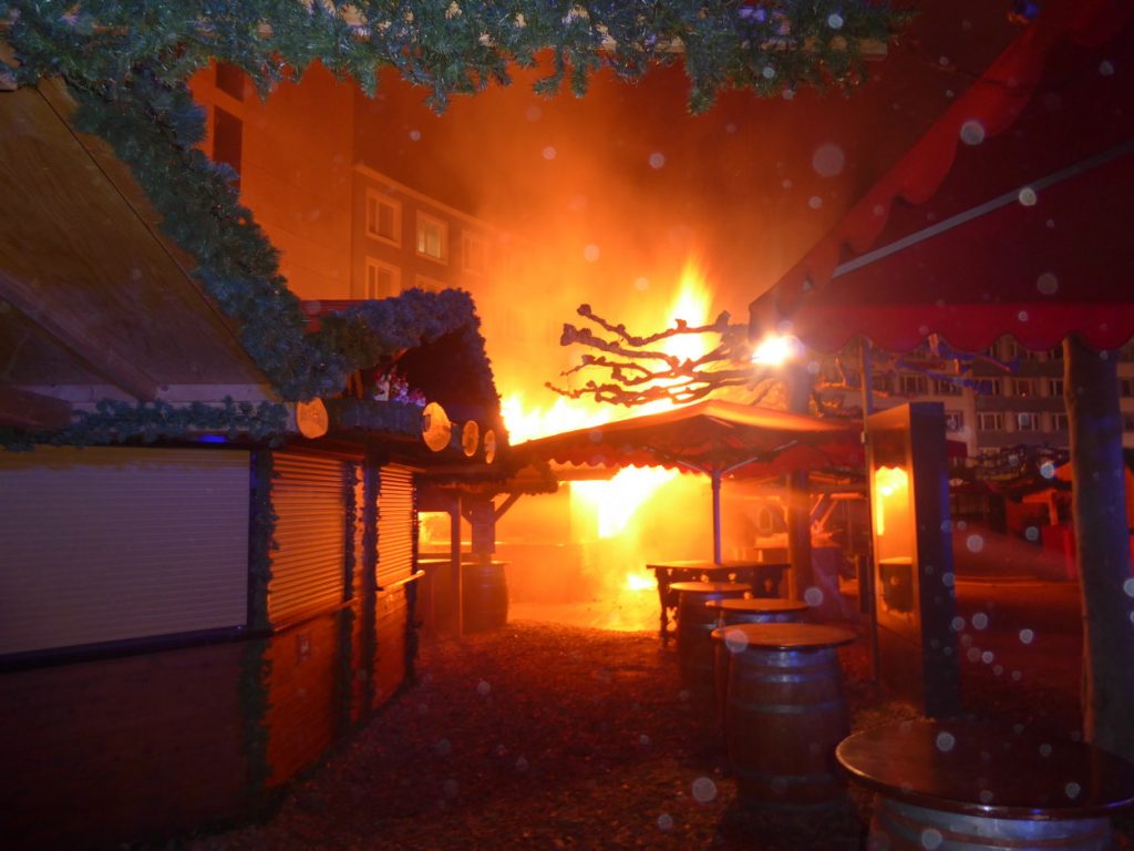 Kassel – Die Feuerwehr wurde in der Nacht auf Donnerstag gegen 04.45 Uhr zu einem Brand auf dem Kasseler Weihnachtsmarkt alarmiert. Ein Mitarbeiter einer Sicherheitsfirma bemerkte Flammenschein und eine Rauchentwicklung aus einer Bratwurstbude auf dem Königsplatz. Bei Ankunft schlugen bereits Flammen aus der Holzhütte. Kurze Zeit später stand die komplette Hütte in Flammen. Eine Ausbreitung des Feuers auf die benachbarten Hütten konnte verhindert werden. Die Freiwillige Feuerwehr Niederzwehren unterstützte die Einsatzkräfte der Feuerwache 1. Der Schaden wird auf 25.000 Euro geschätzt. Personen kamen nicht zu Schaden. Zur Brandursache ermittelt die zuständige Polizei.