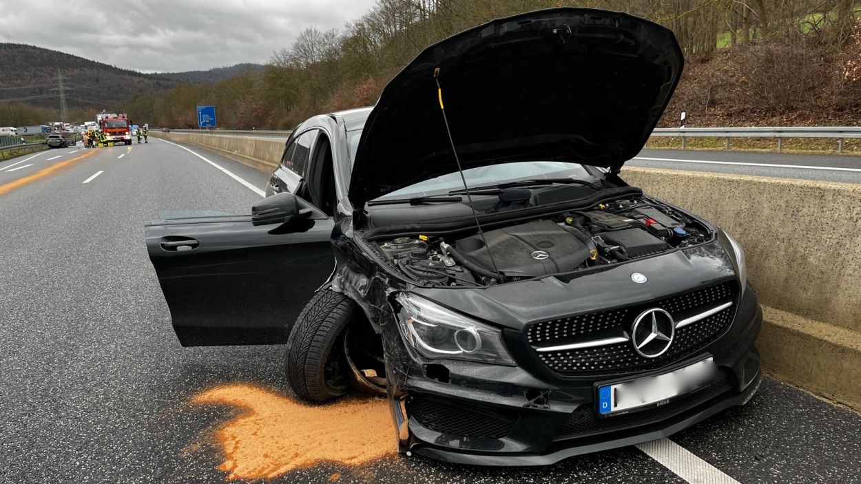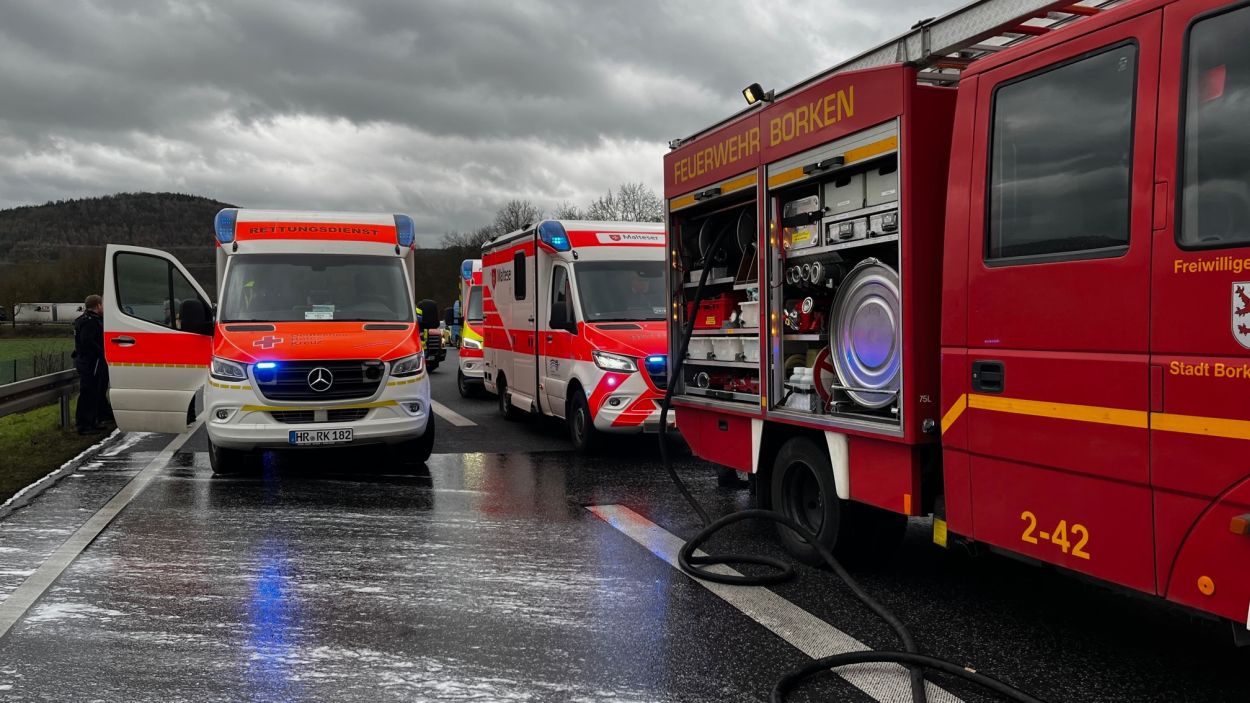Borken – Zu einem schweren Auffahrunfall kam es am Freitagmittag auf der A49 zwischen Borken und Wabern. Nach ersten Informationen beabsichtigte ein LKW Fahrer mit seinem Sattelzug auf die A49 im Bereich Borken aufzufahren. Eine aus Richtung Schwalmstadt kommende 56-jährige Verkehrsteilnehmerin beabsichtigte den Auffahrenden LKW zu überholen. Dabei übersah sie offenbar den rückwärtigen Verkehr. Die Frau scherte mit ihrem Kleinwagen aus. Ein 19 jähriger Mercedesfahrer, welche mit erhöhter Geschwindigkeit aus Richtung Neuental angefahren kam, konnte trotz einer Notbremsung ein Auffahren nicht verhindert. Durch den heftigen Heckeinschlag wurde die Schwalmstädterin mit ihrem Fahrzeug quer über die Fahrbahn geschleudert und schlug in der Leitplanke ein. Das Fahrzeug kam mit der Fahrerseite an der Schutzplanke zum stehen und ging unmittelbar in Flammen auf. Obwohl sich die 56 Jährige verletzte, konnte sie ihr Fahrzeug in letzter Sekunde noch eigenständig verlassen. Nur wenige Sekunden später stand der Kleinwagen in Vollbrand. Der 19 Jährige und sein gleichaltriger Beifahrer kam rund 150 Meter weiter mit ihrem Fahrzeug zum stehen. Alle drei beteiligten PKW Fahrer wurden bei dem Unfall verletzt und kamen in Krankenhäuser nach Fritzlar und Kassel. Der LKW Fahrer blieb unverletzt. Den Gesamtschaden schätzt die Polizei auf rund 40.000 Euro. Die A49 war während der Rettungs-, Bergungs- und Löschmaßnahmen für rund zwei Stunden voll gesperrt. (mpu)