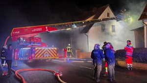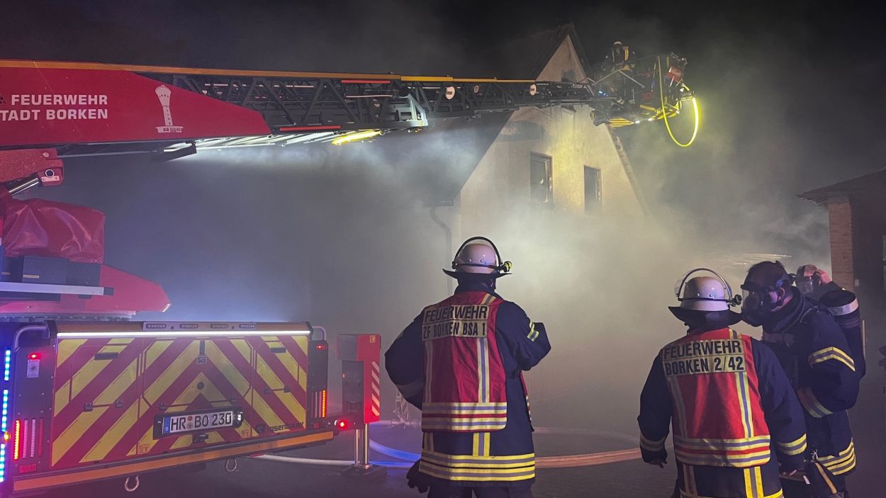 Borken – Ein schnelles Eingreifen der Borkener Brandschützer hat am Sonntag in den frühen Morgenstunden in Borken-Arnsbach sicher schlimmeres Verhindert. Aus bislang ungeklärten Umständen brannte es in einem überdachtem Freisitz. Rauch und Flammen griffen bereits auf das Wohngebäude über. Mit mehreren Atemschutztrupps ging die Feuerwehr direkt im Innen- und Außenangriff vor und konnte den Brand schnell unter Kontrolle bringen. Da zunächst davon ausgegangen werden musste, dass sich noch mindestens eine Person in dem Gebäude befand, konzentrierten sich die Maßnahmen zunächst auf die Suche und die Rettung eines Anwohners. Vom Keller bis zum Dachgeschoss suchten die Einsatzkräfte das Gebäude ab. Glücklicherweise stellte sich aber schnell heraus, dass sich niemand zum Zeitpunkt des Brandes im Haus befand. Die Schadenhöhe sowie die Brandursache konnte vor Ort nicht abschließend geklärt werden. Das Gebäude ist derzeit nicht mehr bewohnbar. Im Einsatz waren rund 70 Einsatzkräfte der Feuerwehren Borken unter Einsatzleiter und Stadtbrandinspektor Alexander Wilhelm, ein Rettungswagen, ein Notarzt sowie die Polizei Homberg. (mpu)