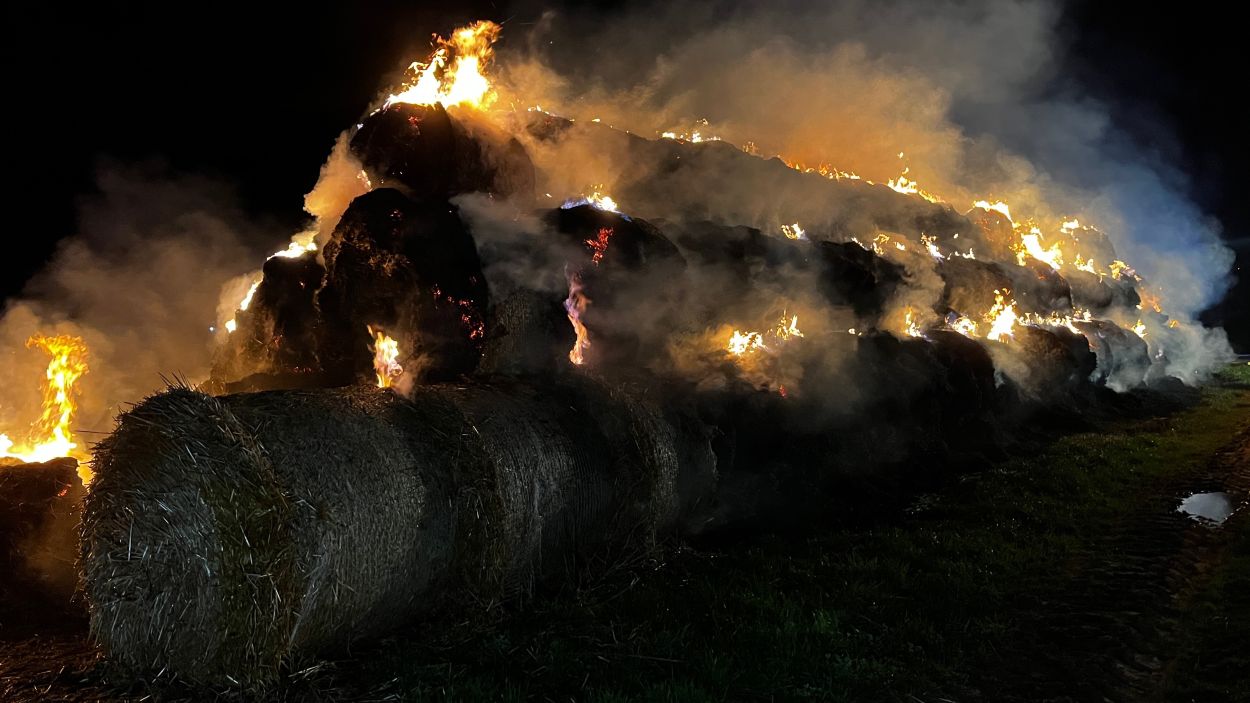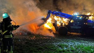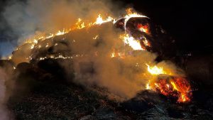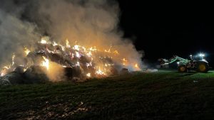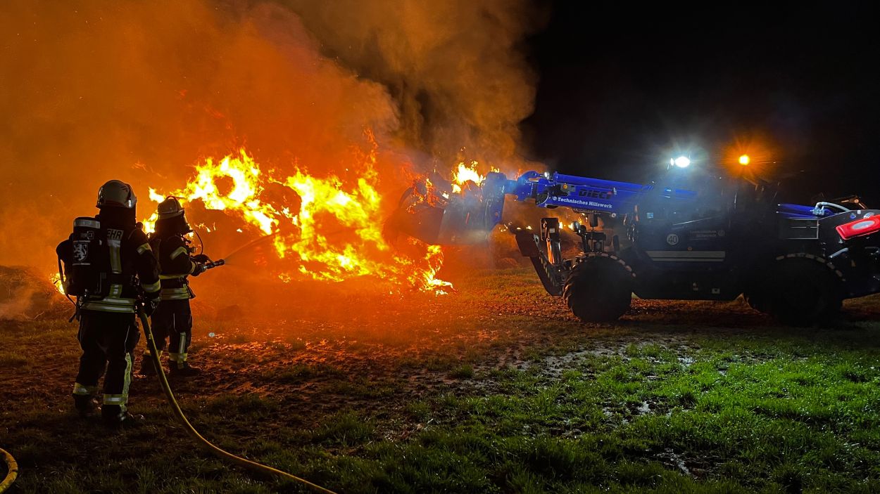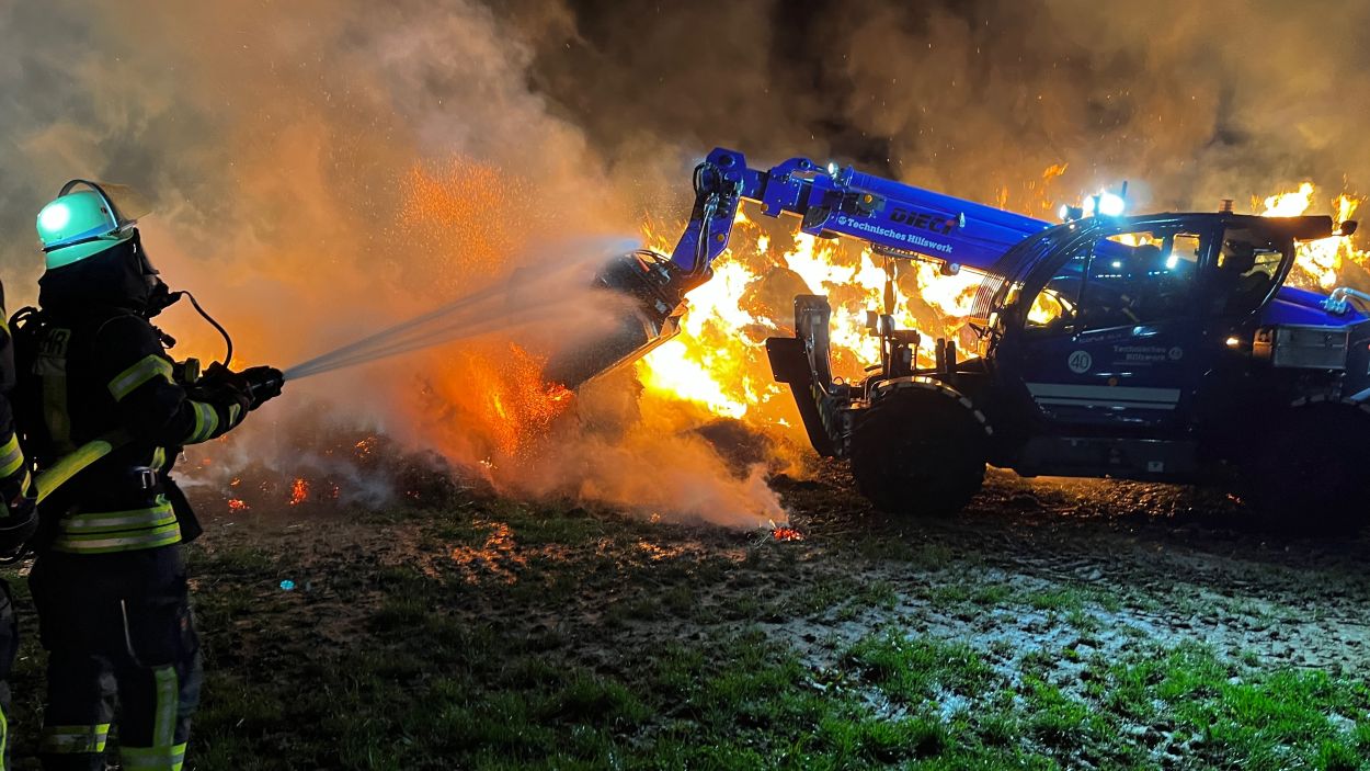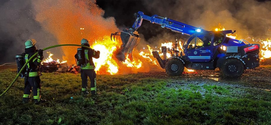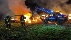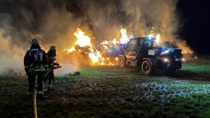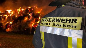Borken – Was den Feuerwehreinsatzkräften zunächst als ein kleiner Waldbrand gemeldet wurde, entpuppte sich am Montagabend zu einem Brand von über 100 Rundballen Stroh. Bereits aus der Ferne waren die Flammen zu sehen. Bis auf zwei Rundballen, fielen alle den Flammen zum Opfer. Über 70 Einsatzkräfte von Feuerwehr und THW waren nötig, um den Brand in der Gemarkung von Borken-Großenenglis unter Kontrolle zu bekommen. Aus bislang ungeklärten Umständen gerieten über 100 Rundballen Stroh nur wenige hundert Meter vom Sportplatz Großenenglis entfernt in Brand. Bei Ankunft der Einsatzkräfte standen die eigens am Rande eines Feldes gelagerten und abgedeckten Ballen bereits in Vollbrand. Für die Feuerwehr gestaltete sich die Löschwasserversorgung vor Ort zunächst schwierig.