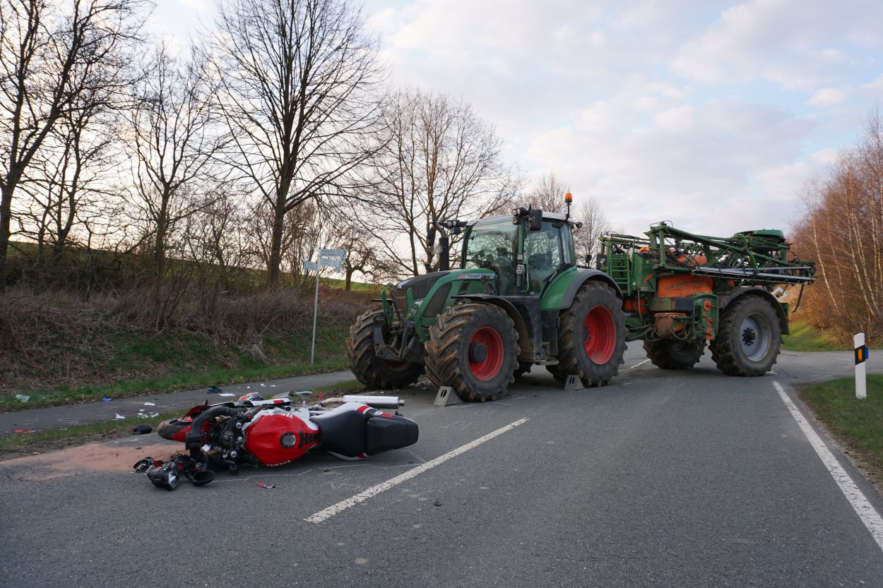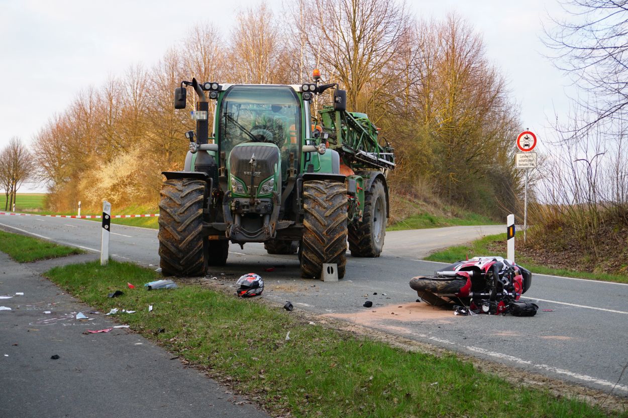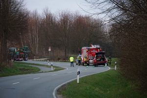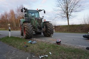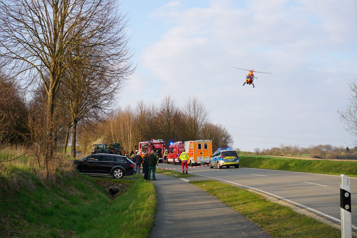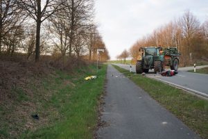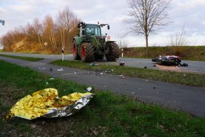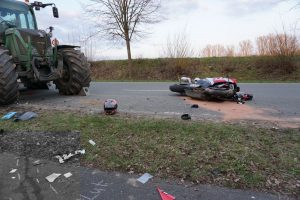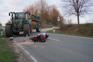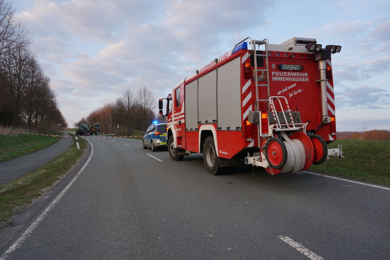 Immenhausen – Am Ostersonntag kam es auf der L3386 zwischen Mariendorf und Immenhausen zu einem schweren Verkehrsunfall. Nach bisherigen Informationen, fuhr gegen 18 Uhr ein Traktor aus einem Feldweg heraus und bog auf die Landstraße ein. Dabei übersah er wohlmöglich eine Motorradfahrerin von Immenhausen kommend. Bei dem Zusammenstoß wurde die Motorradfahrerin schwer verletzt und musste mit dem Rettungshubschrauber Christoph 7 in ein Krankenhaus geflogen werden. Der Traktorfahrer wurde nicht verletzt. Ein Unfallgutachter wurde in die Ermittlungen hinzugezogen. Die Landstraße musste für mehrere Stunden voll gesperrt werden. Neben Rettungsdienst und Polizei war auch die Feuerwehr aus Immenhausen im Einsatz.