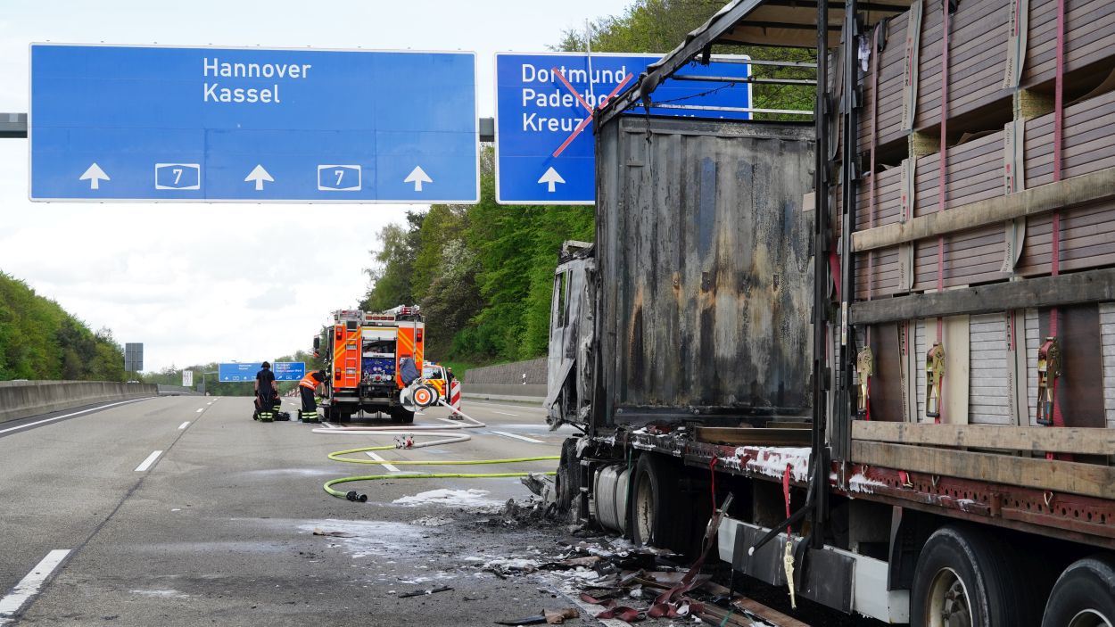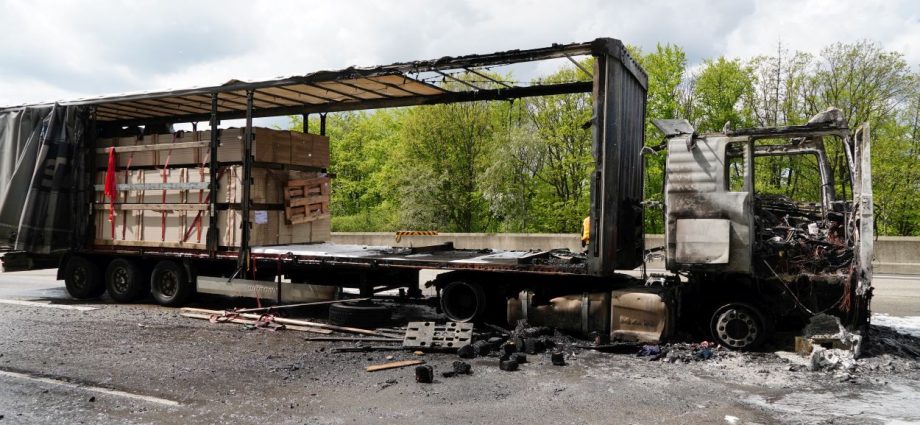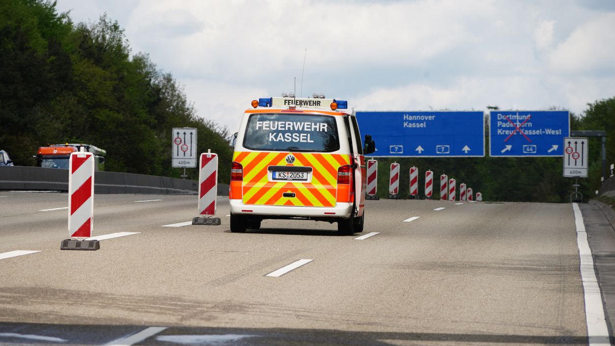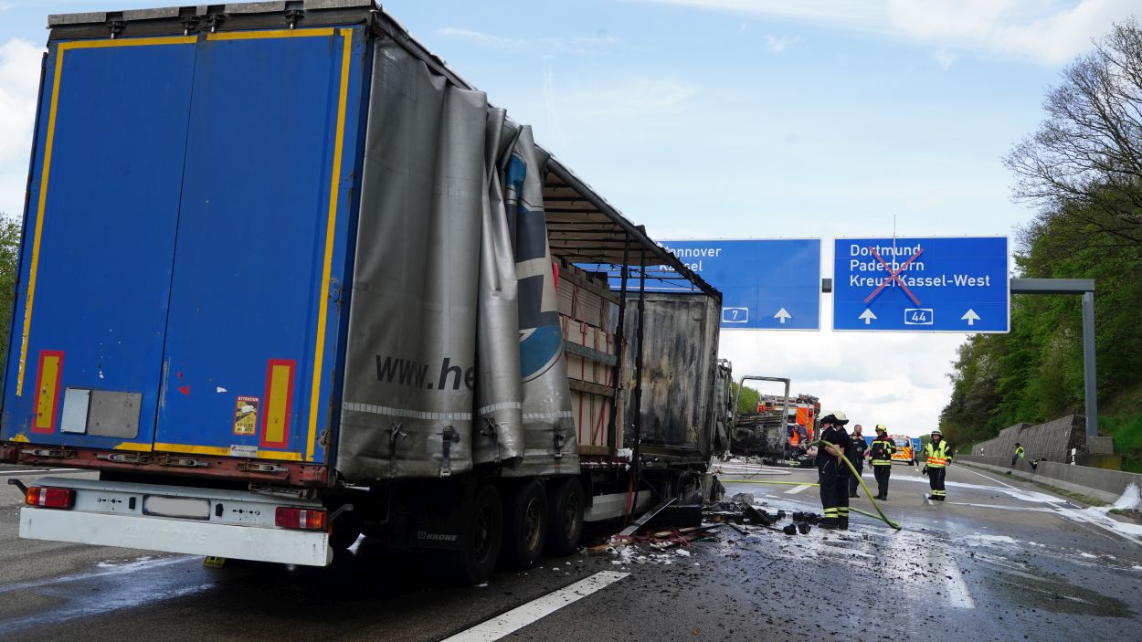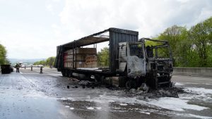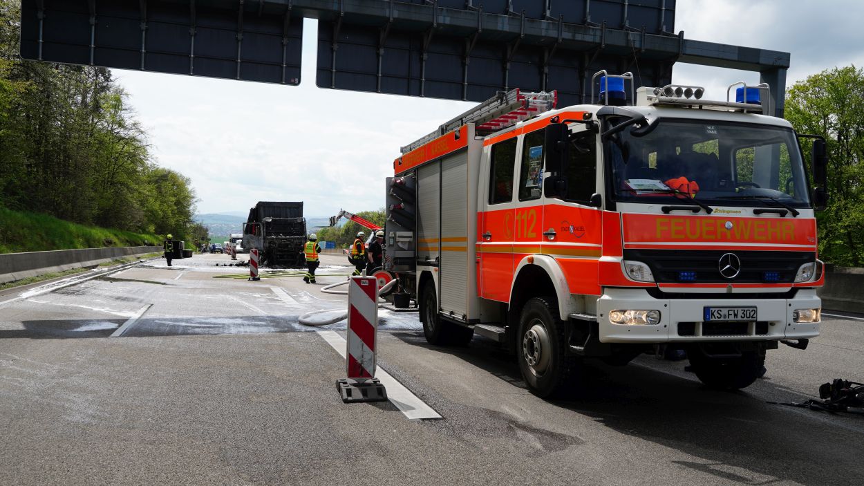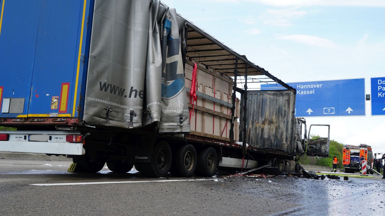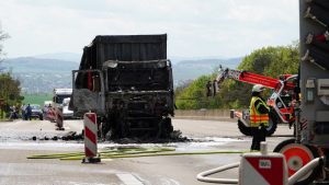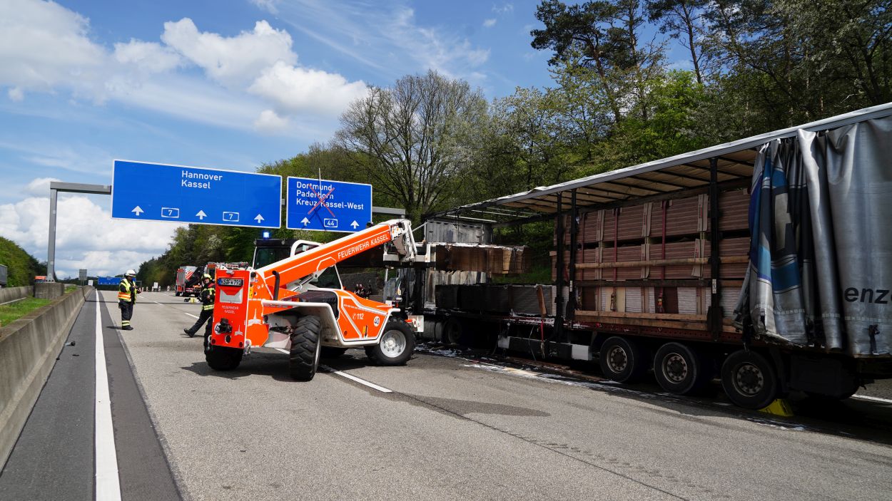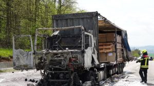 Kassel – Auf der A7 zwischen Guxhagen und Kassel kam es am Samstagnachmittag gegen 13.20 Uhr zu einem LKW Brand. Der Fahrer konnte den LKW kurz vorm Kreuz Kassel-Süd zum Stehen bringen und sich unverletzt retten. Die Rettungsauffahrt, die nur wenige Meter von der Einsatzstelle entfernt war, hatte die Feuerwehr leichtes Spiel rechtzeitig zum Brand zu gelangen. Beim Eintreffen der ersten Einsatzkräfte stand die Zugmaschine sowie die Hälfte vom Auflieger in Vollbrand. Der LKW hatte Küchenarbeitsplatten geladen. Um auch an die letzten Glutnester zu gelangen, wurde der Teleskoplader von der Berufsfeuerwehr nachalarmiert, um die Paletten zu entladen. Die Polizei geht von einem technischen Defekt an der Zugmaschine als Brandursache aus. Der Sachschaden wird auf 400.000 Euro geschätzt. Die Autobahn in Fahrtrichtung Nord war für mehrere Stunden voll gesperrt. Es staute sich mehrere Kilometer zurück.