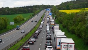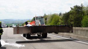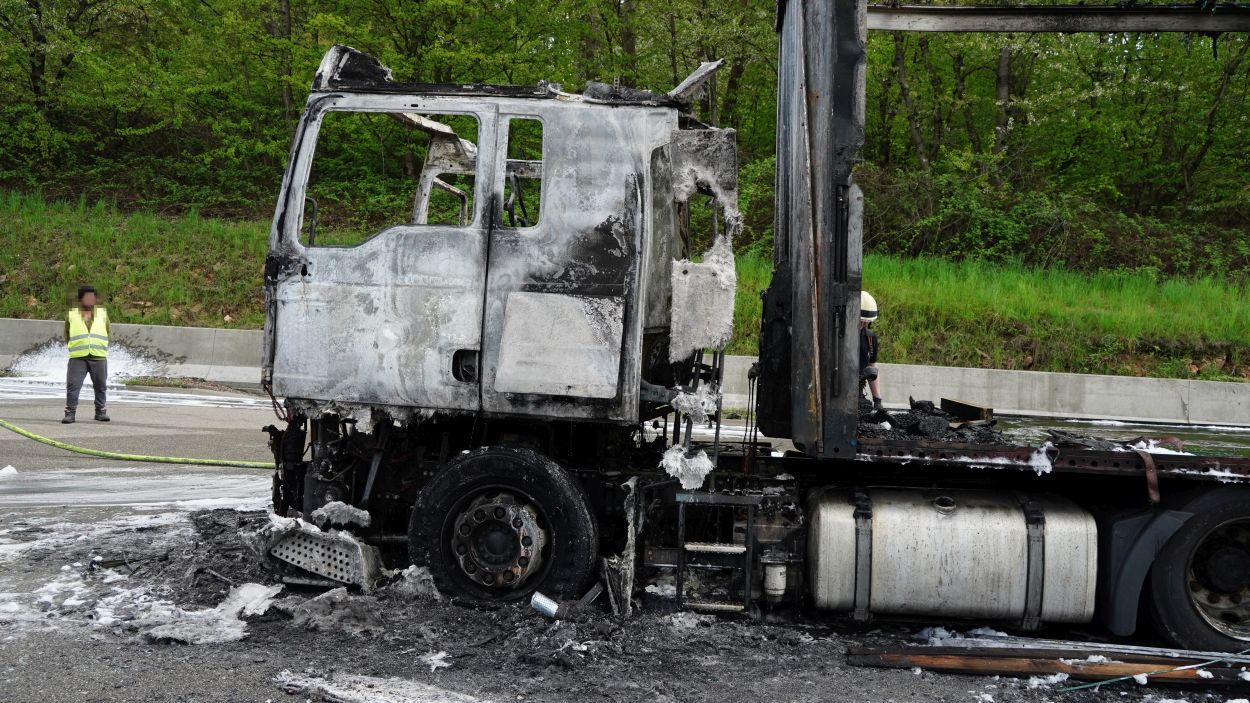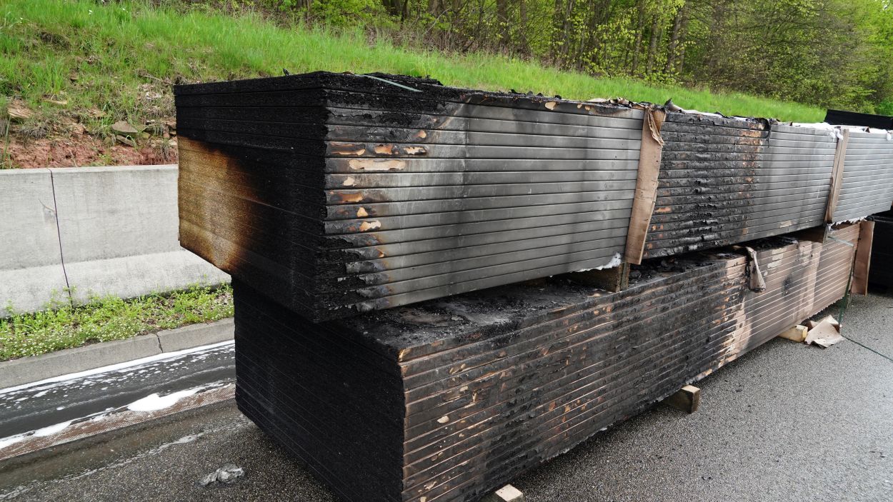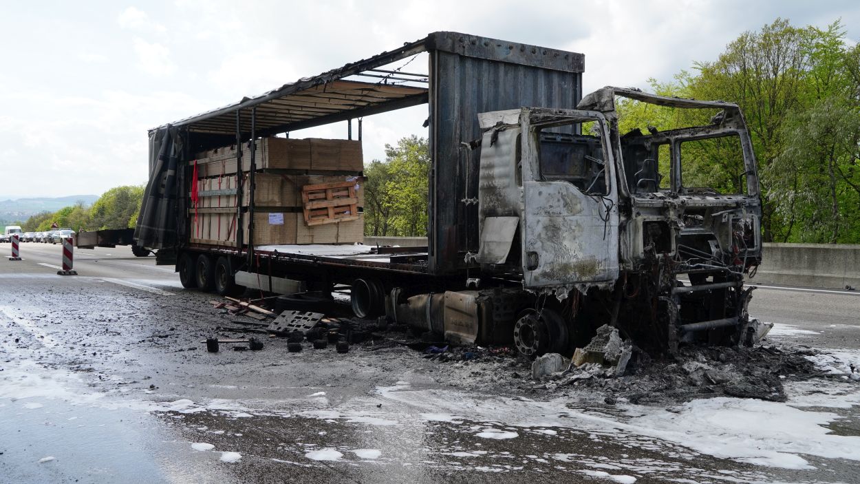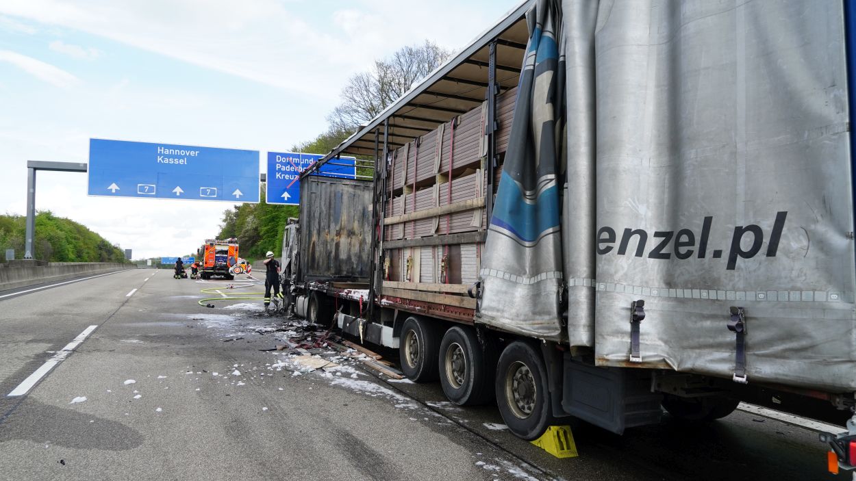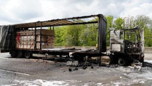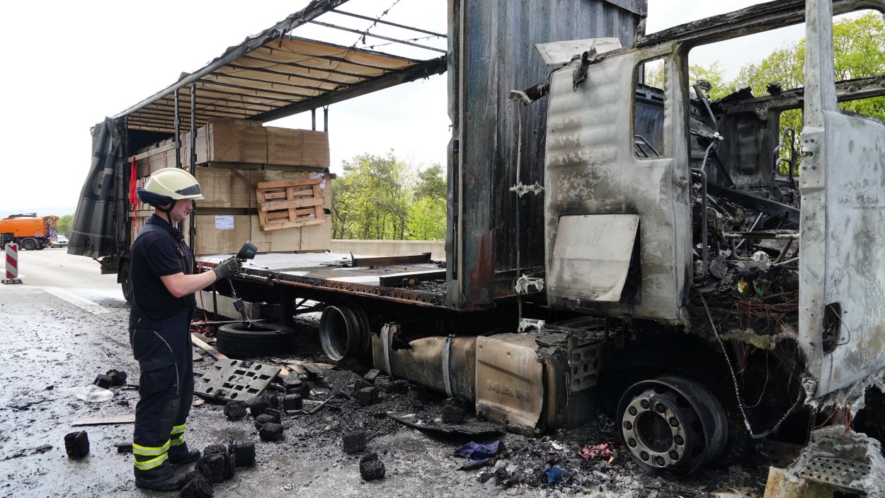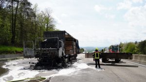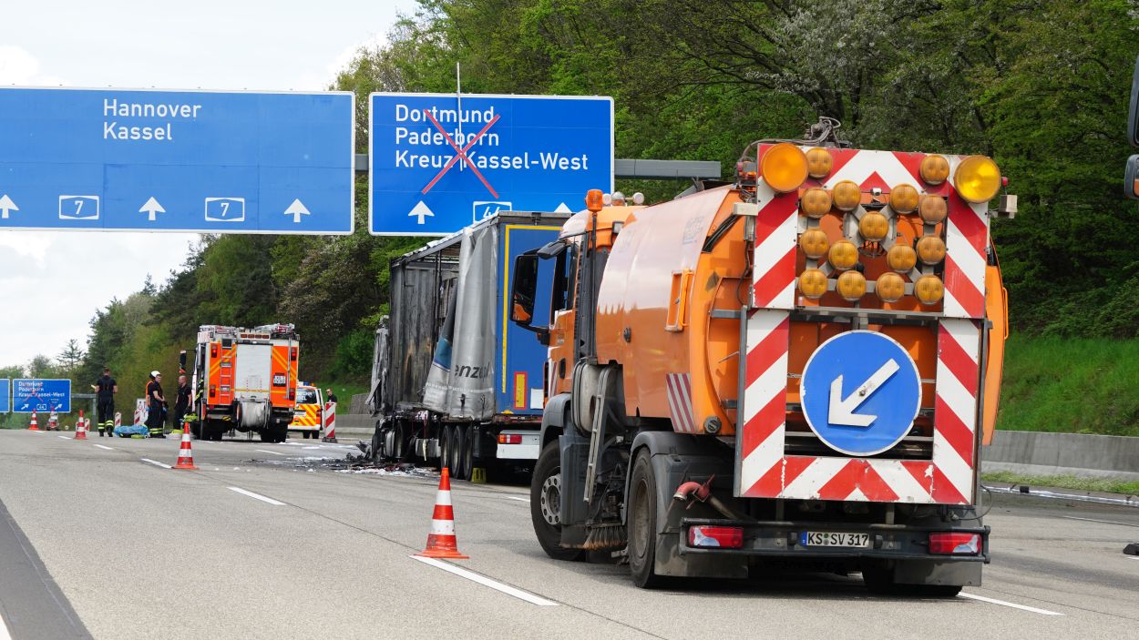 Kassel – Auf der A7 zwischen Guxhagen und Kassel kam es am Samstagnachmittag gegen 13.20 Uhr zu einem LKW Brand. Der Fahrer konnte den LKW kurz vorm Kreuz Kassel-Süd zum Stehen bringen und sich unverletzt retten. Die Rettungsauffahrt, die nur wenige Meter von der Einsatzstelle entfernt war, hatte die Feuerwehr leichtes Spiel rechtzeitig zum Brand zu gelangen. Beim Eintreffen der ersten Einsatzkräfte stand die Zugmaschine sowie die Hälfte vom Auflieger in Vollbrand. Der LKW hatte Küchenarbeitsplatten geladen. Um auch an die letzten Glutnester zu gelangen, wurde der Teleskoplader von der Berufsfeuerwehr nachalarmiert, um die Paletten zu entladen. Die Polizei geht von einem technischen Defekt an der Zugmaschine als Brandursache aus. Der Sachschaden wird auf 400.000 Euro geschätzt. Die Autobahn in Fahrtrichtung Nord war für mehrere Stunden voll gesperrt. Es staute sich mehrere Kilometer zurück.