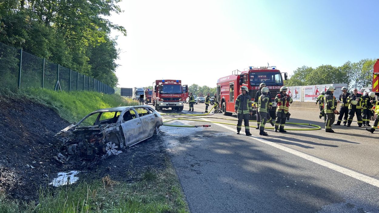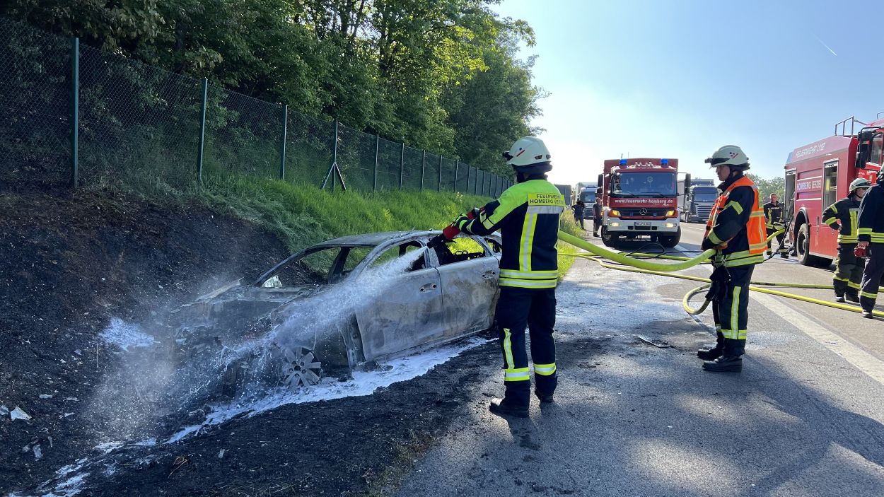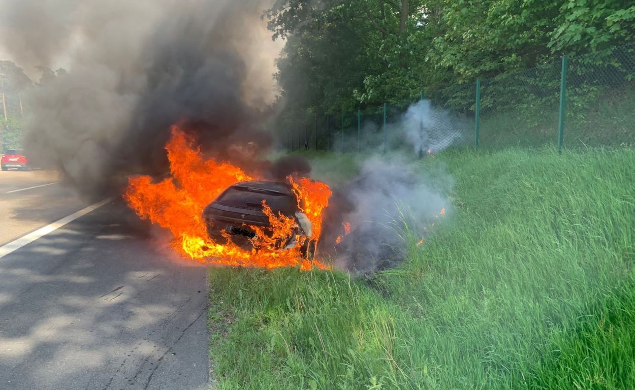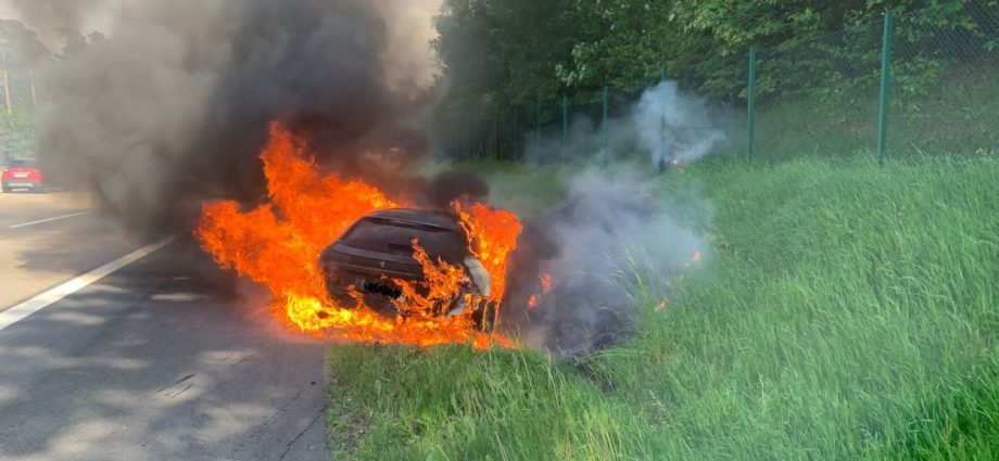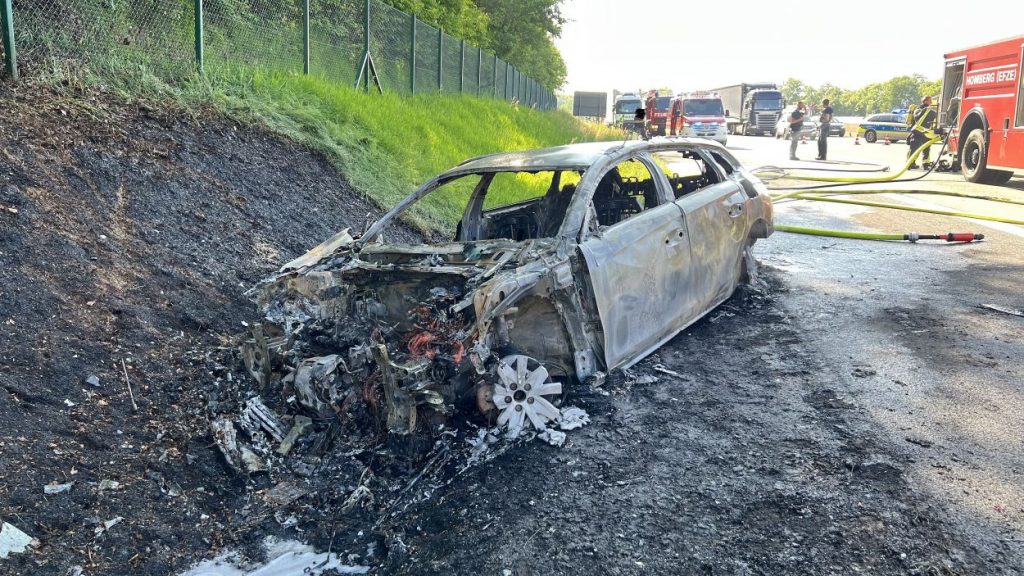 Homberg (Efze) – Am Donnerstagabend wurden die Feuerwehren aus Homberg-Efze, Bad Hersfeld und Kirchheim, sowie die Feuerwehr aus Neuenstein zu einem brennenden Hybrid-PKW auf die A7 ca. 300 Meter vor dem Parkplatz Pommer in Fahrtrichtung Süden alarmiert. Der Fahrer (48) eines Peugeot 508e musste aufgrund eines technischen Defektes auf der Standspur anhalten. Der Mann konnte sein Fahrzeug gerade noch verlassen, als der Peugeot auch schon in ganzer Ausdehnung brannte. Da der Fahrer sehr weit rechts auf dem Standstreifen stand, griffen die Flammen sofort auf die angrenzende Böschung über. Beim Eintreffen der ersten Feuerwehren brannte bereits eine größere Fläche der Böschung. Um einen Waldbrand zu verhindern, mussten die Einsatzkräfte zuerst den Böschungsbrand löschen, bevor sie sich dem Peugeot zuwenden konnten.