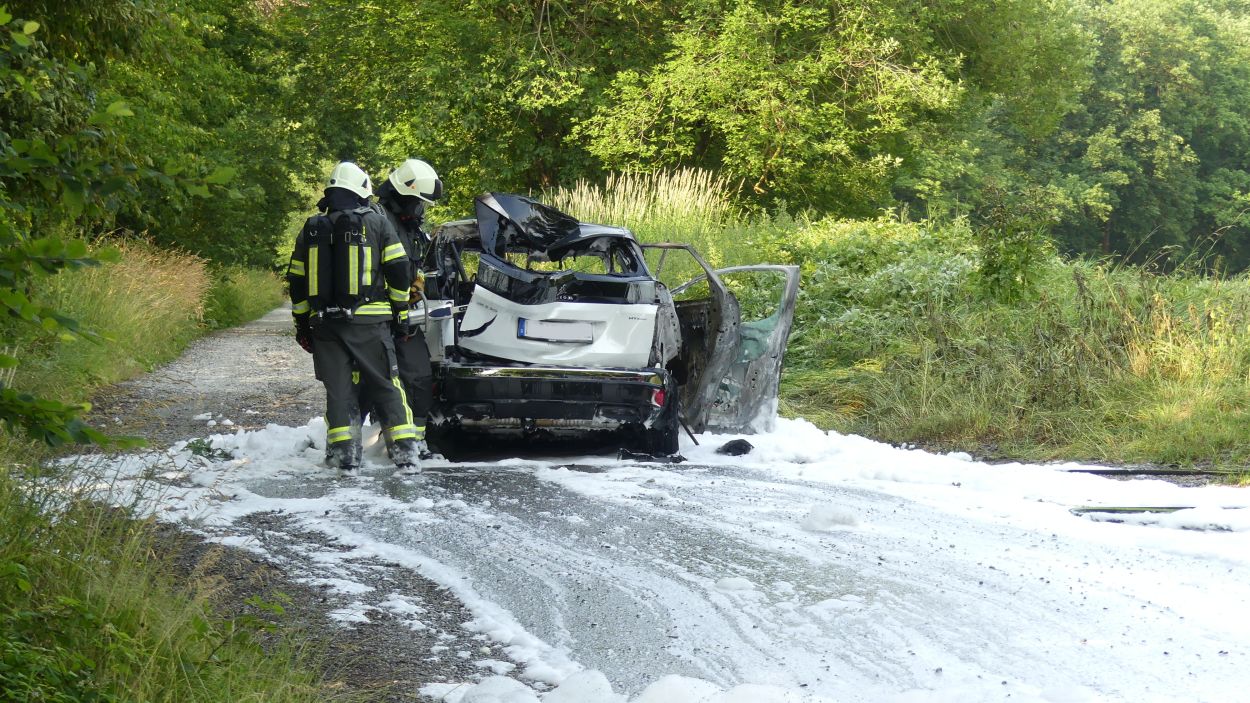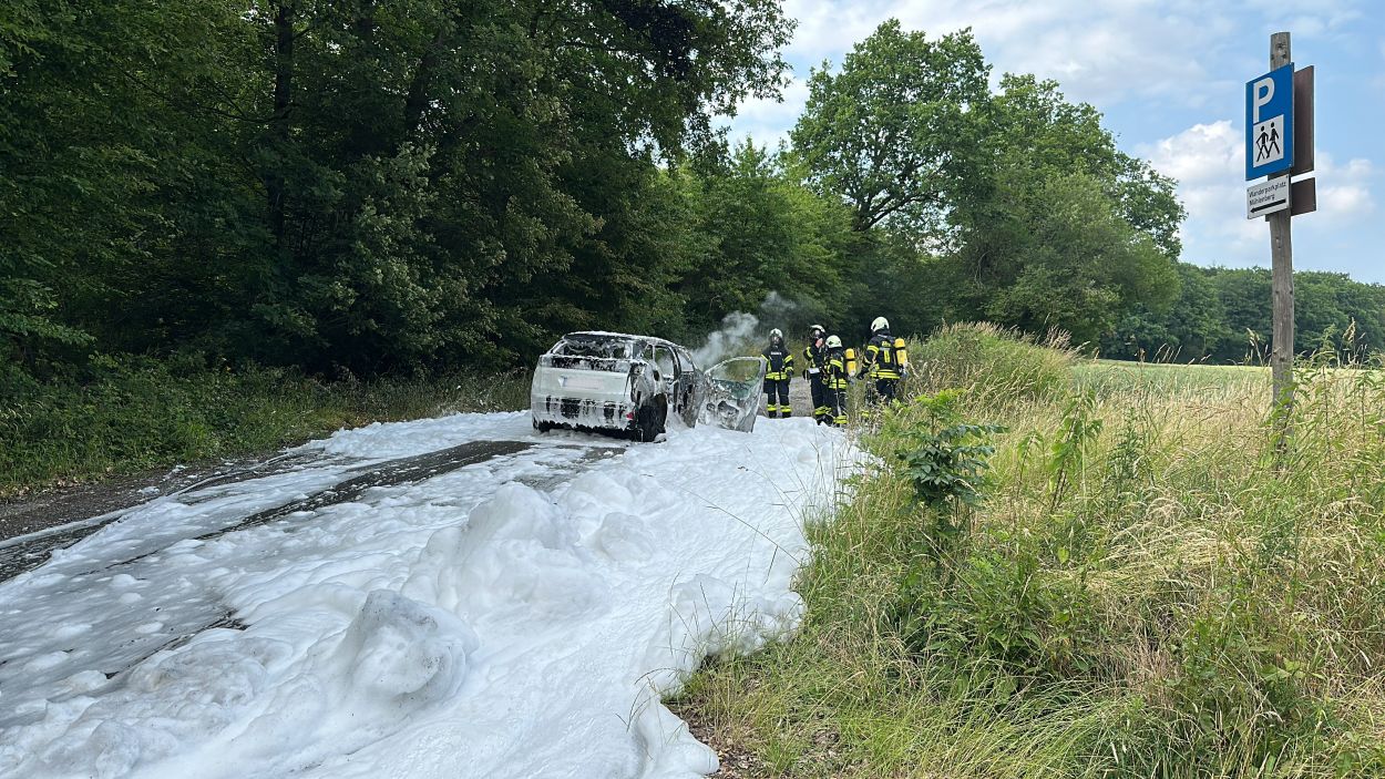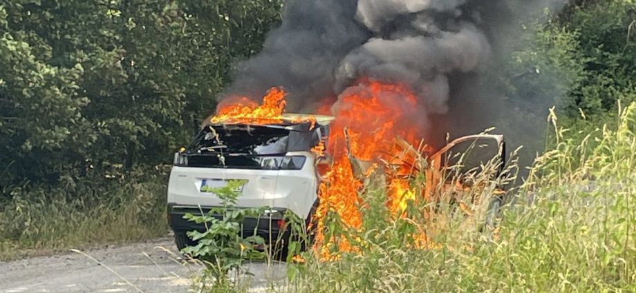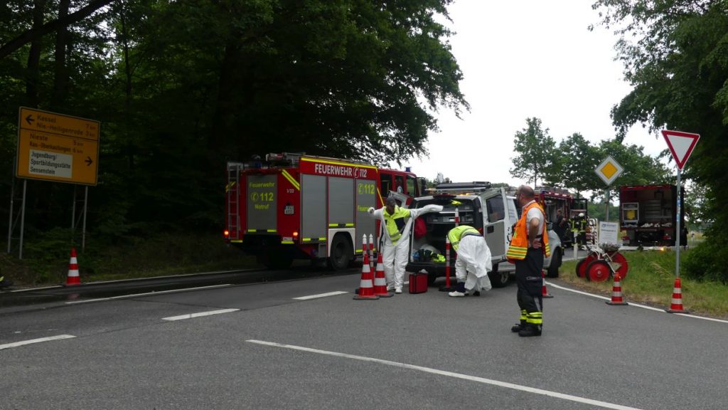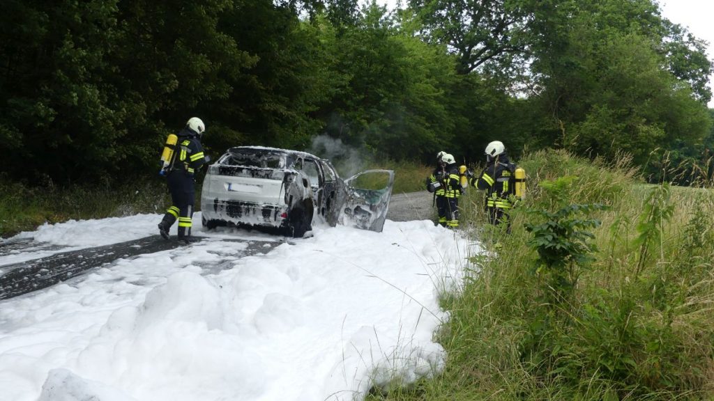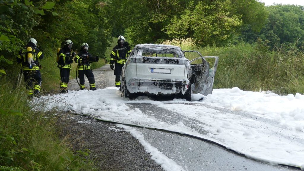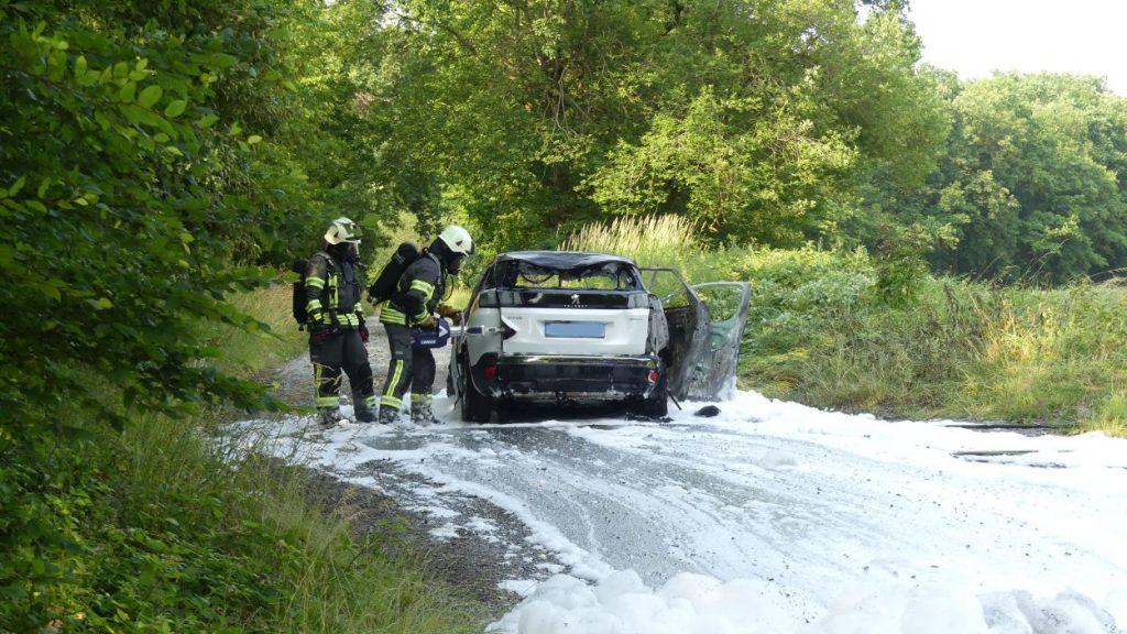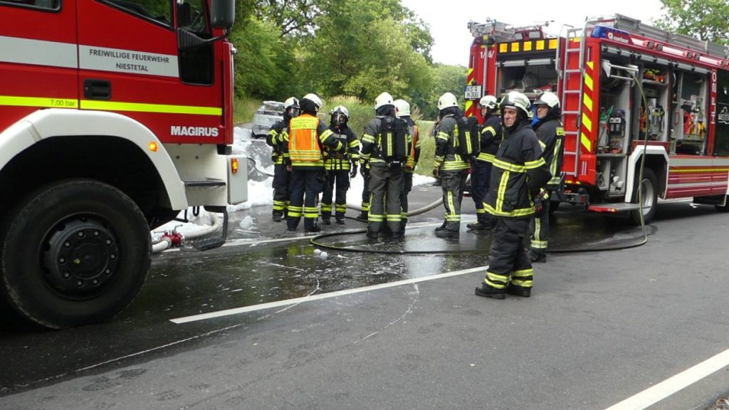 Niestetal – Am Montagnachmittag wurde die Feuerwehr Niestetal gegen 16:30 Uhr zu einem Fahrzeugbrand mit Hybridantrieb auf die K4 in Richtung Nieste alarmiert. Da bereits auf Anfahrt eine riesige Rauchwolke zu sehen war, wurde direkt die Feuerwehr Kaufungen nachalarmiert und der GW Hygiene der Feuerwehr Helsa. Das Fahrzeug ließ sich relativ zügig mit Schaum und Wasser löschen, da es sich jedoch um ein E-Auto handelt, gestattete sich die Bergung sehr kompliziert. Die Firma Aschenbrenner geht hier mit einer neuen Technik voran. Statt das ganze Fahrzeug in einen Container mit Wasser zu packen, wird hier lediglich nur die Batterie vom Fahrzeug getrennt und in einer Box zur Kühlung verstaut. Bis zu 14 Tagen wird der Akku in der Box dann kontrolliert. Gegen 21:30 Uhr war der Akku dann ausgebaut und die Feuerwehr führte letzte Aufräumarbeiten durch. Im Einsatz befanden sich 35 Feuerwehrleute sowie die Polizei. Das Zusammenspiel aller Kräfte verlief super, lobte Einsatzleiter Kai Brückmann.