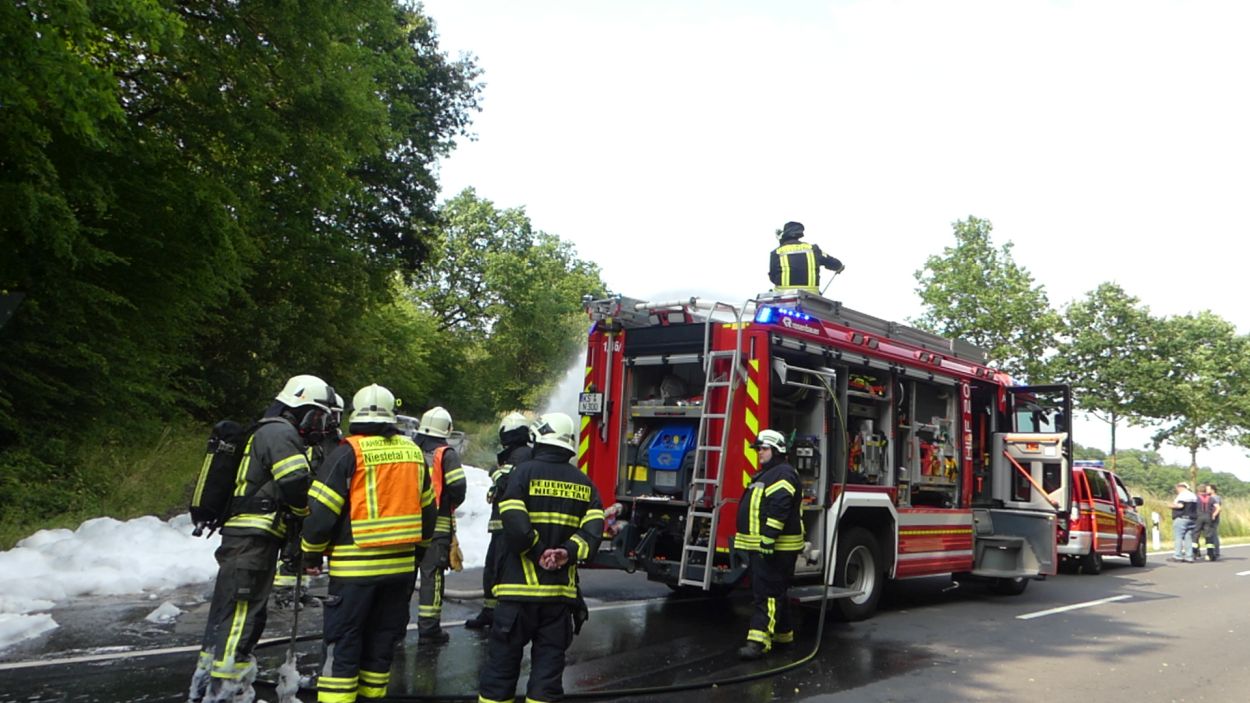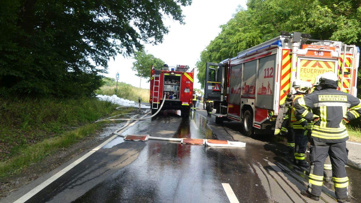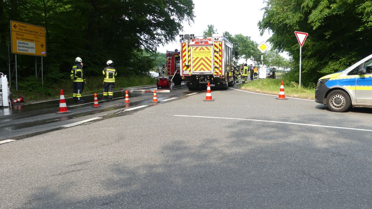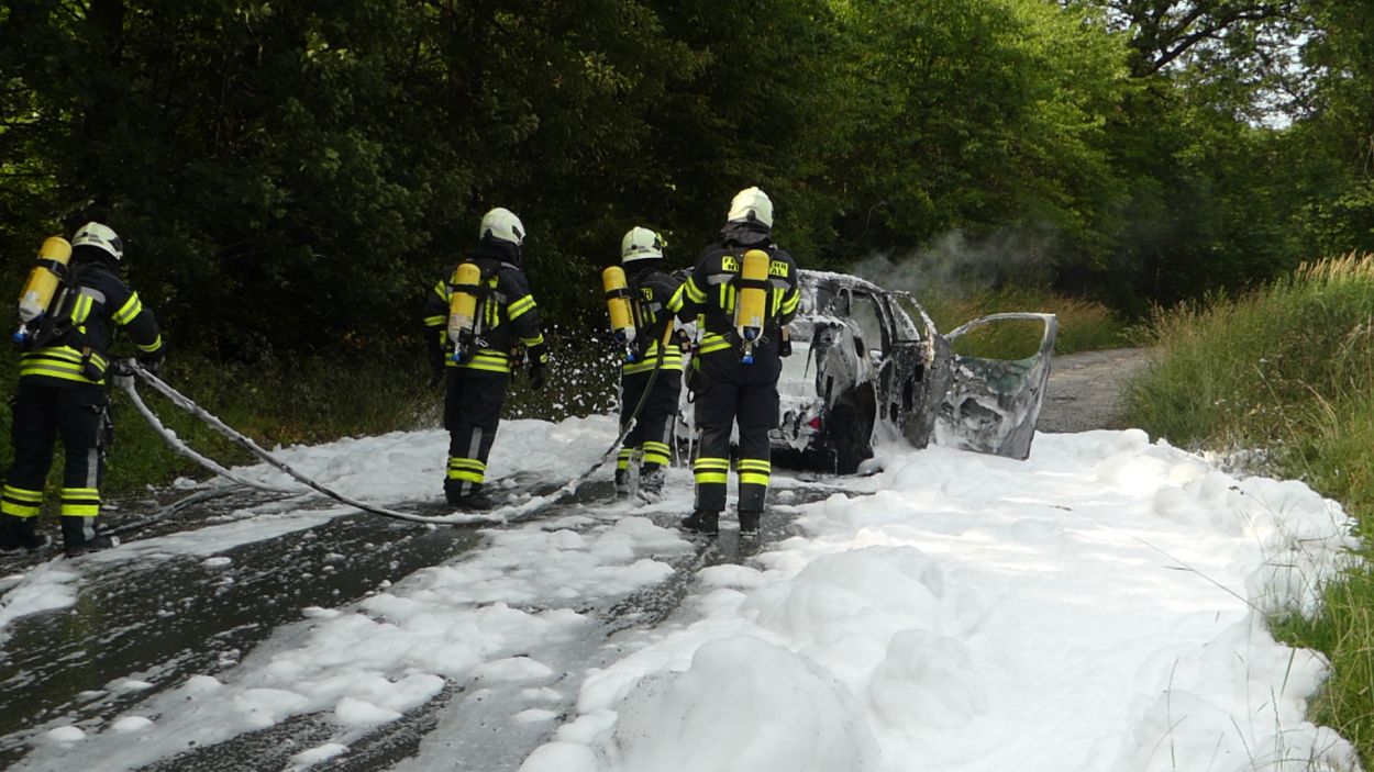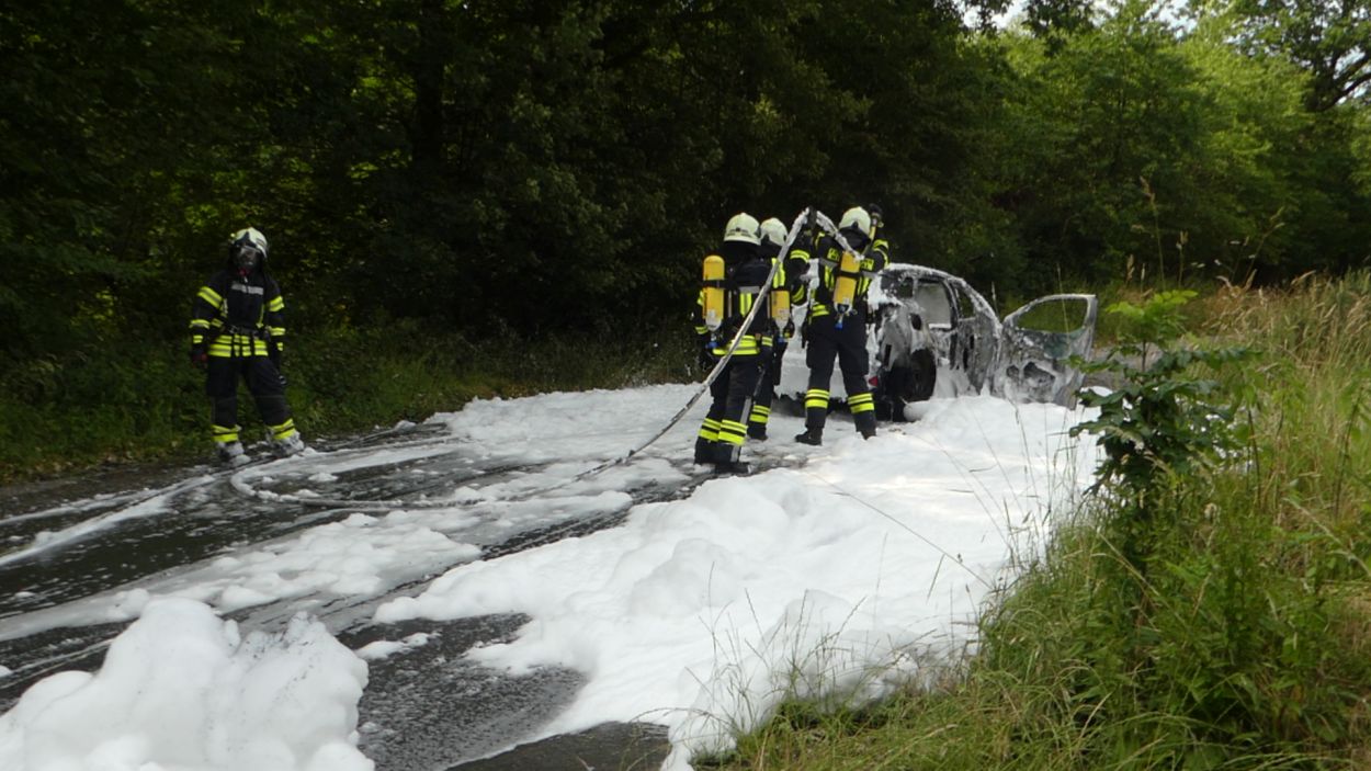 Niestetal – Am Montagnachmittag wurde die Feuerwehr Niestetal gegen 16:30 Uhr zu einem Fahrzeugbrand mit Hybridantrieb auf die K4 in Richtung Nieste alarmiert. Da bereits auf Anfahrt eine riesige Rauchwolke zu sehen war, wurde direkt die Feuerwehr Kaufungen nachalarmiert und der GW Hygiene der Feuerwehr Helsa. Das Fahrzeug ließ sich relativ zügig mit Schaum und Wasser löschen, da es sich jedoch um ein E-Auto handelt, gestattete sich die Bergung sehr kompliziert. Die Firma Aschenbrenner geht hier mit einer neuen Technik voran. Statt das ganze Fahrzeug in einen Container mit Wasser zu packen, wird hier lediglich nur die Batterie vom Fahrzeug getrennt und in einer Box zur Kühlung verstaut. Bis zu 14 Tagen wird der Akku in der Box dann kontrolliert. Gegen 21:30 Uhr war der Akku dann ausgebaut und die Feuerwehr führte letzte Aufräumarbeiten durch. Im Einsatz befanden sich 35 Feuerwehrleute sowie die Polizei. Das Zusammenspiel aller Kräfte verlief super, lobte Einsatzleiter Kai Brückmann.