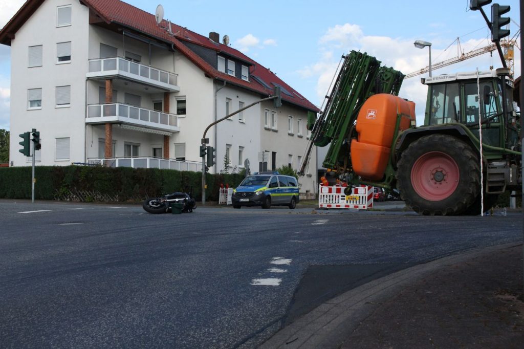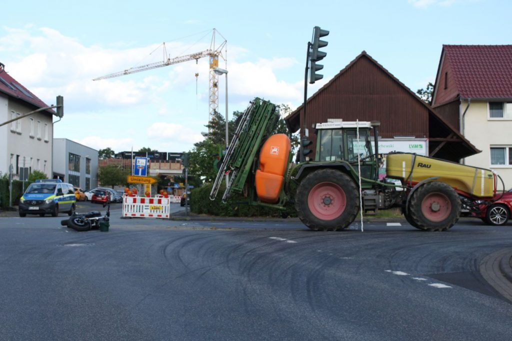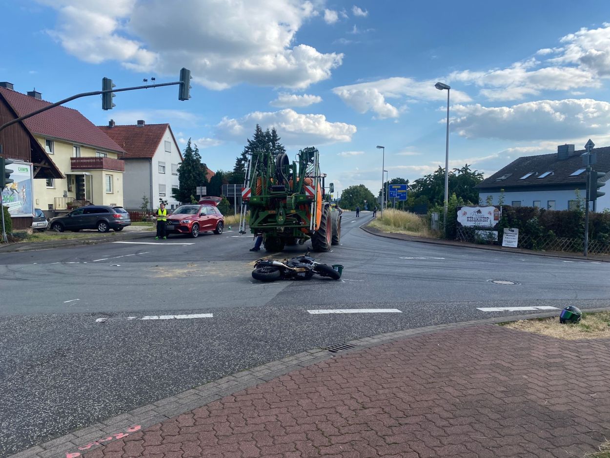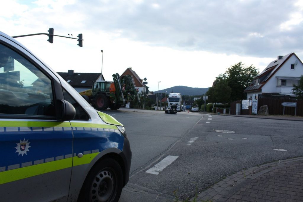 Baunatal – Am Mittwoch gegen 16:20 Uhr, kam es in Baunatal-Hertingshausen zu einem Verkehrsunfall zwischen einem Traktor und einem Motorrad. Beide Fahrzeuge befuhren die Frankfurter Straße in Fahrtrichtung Edermünde. Der Motorradfahrer musste verkehrsbedingt an der Ampel an der Frankfurter Straße Ecke Großenritter Straße anhalten, da diese aufgrund einer Baustelle aktuell außer Betrieb ist. Der Fahrer des Traktors übersah den halten Motorradfahrer. Dabei kam es zu einer Kollision zwischen beiden Fahrzeugen. Der 44- jährige Motorradfahrer aus Jesberg wurde bei dem Verkehrsunfall schwer verletzt und musste in ein Kasseler Krankenhaus eingeliefert werden. Zur Rekonstruktion des Unfallhergangs wurde ein Gutachter an der Unfallstelle eingesetzt. Die Ermittlungen dauern an.