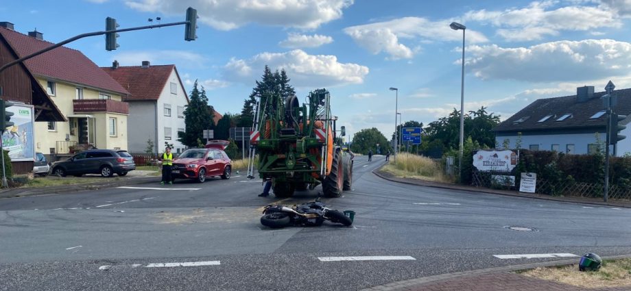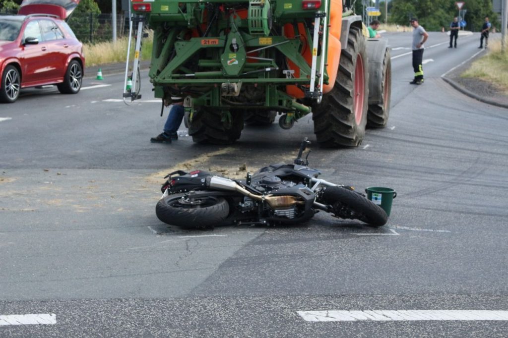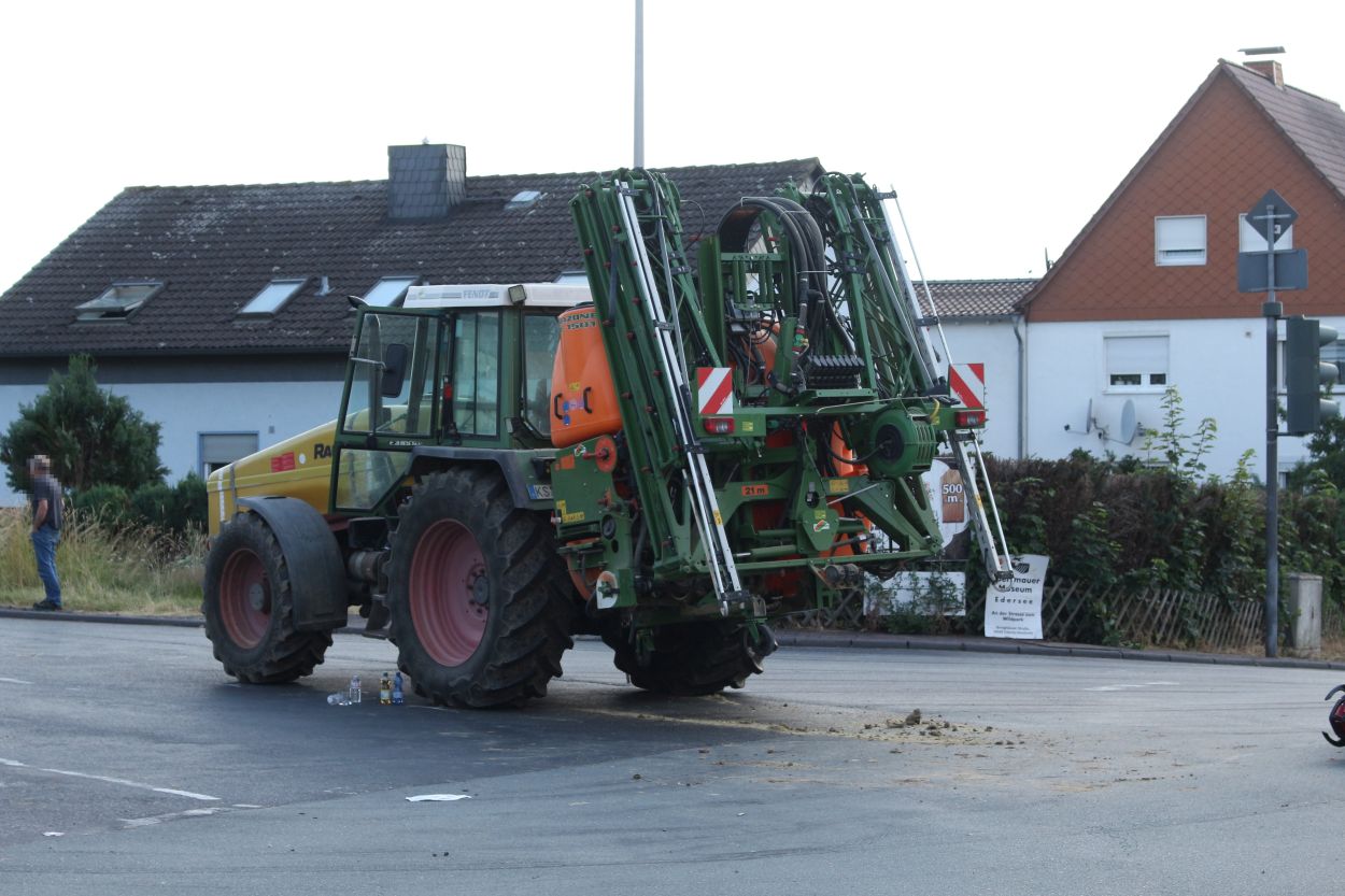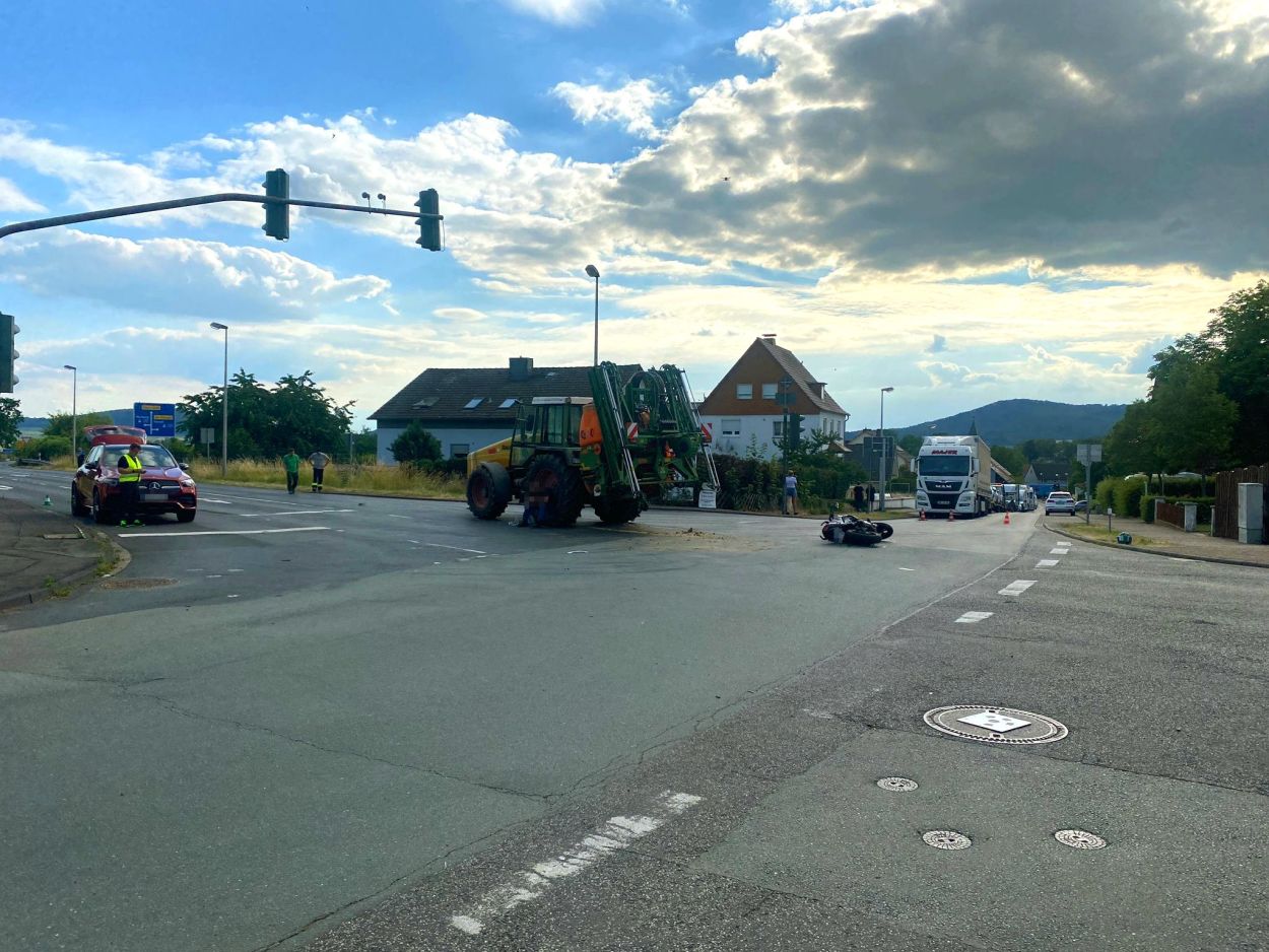 Baunatal – Am Mittwoch gegen 16:20 Uhr, kam es in Baunatal-Hertingshausen zu einem Verkehrsunfall zwischen einem Traktor und einem Motorrad. Beide Fahrzeuge befuhren die Frankfurter Straße in Fahrtrichtung Edermünde. Der Motorradfahrer musste verkehrsbedingt an der Ampel an der Frankfurter Straße Ecke Großenritter Straße anhalten, da diese aufgrund einer Baustelle aktuell außer Betrieb ist. Der Fahrer des Traktors übersah den halten Motorradfahrer. Dabei kam es zu einer Kollision zwischen beiden Fahrzeugen. Der 44- jährige Motorradfahrer aus Jesberg wurde bei dem Verkehrsunfall schwer verletzt und musste in ein Kasseler Krankenhaus eingeliefert werden. Zur Rekonstruktion des Unfallhergangs wurde ein Gutachter an der Unfallstelle eingesetzt. Die Ermittlungen dauern an.
