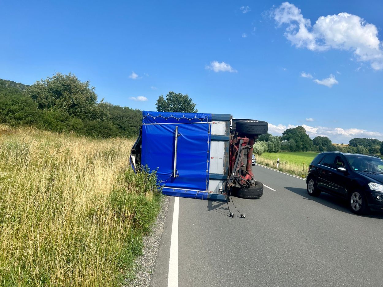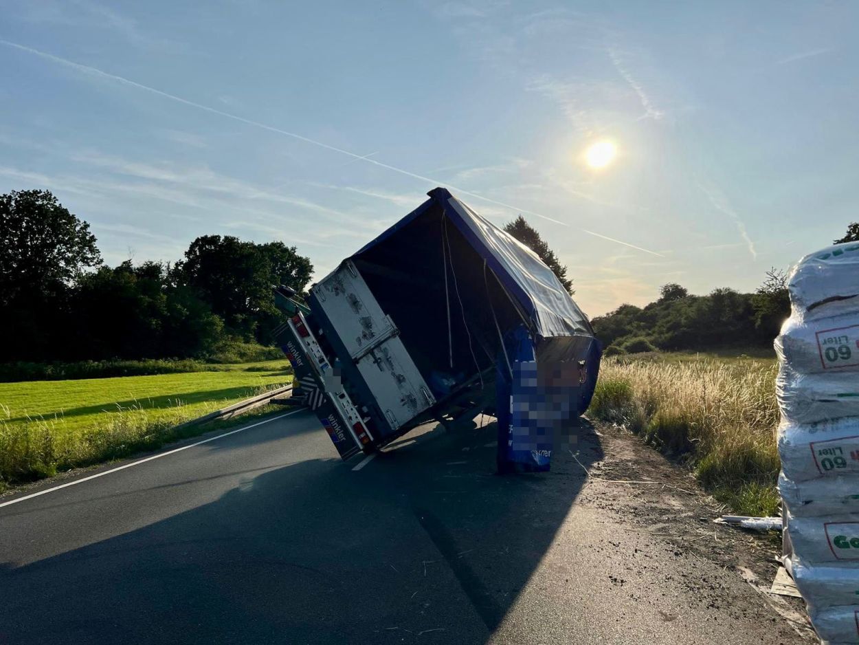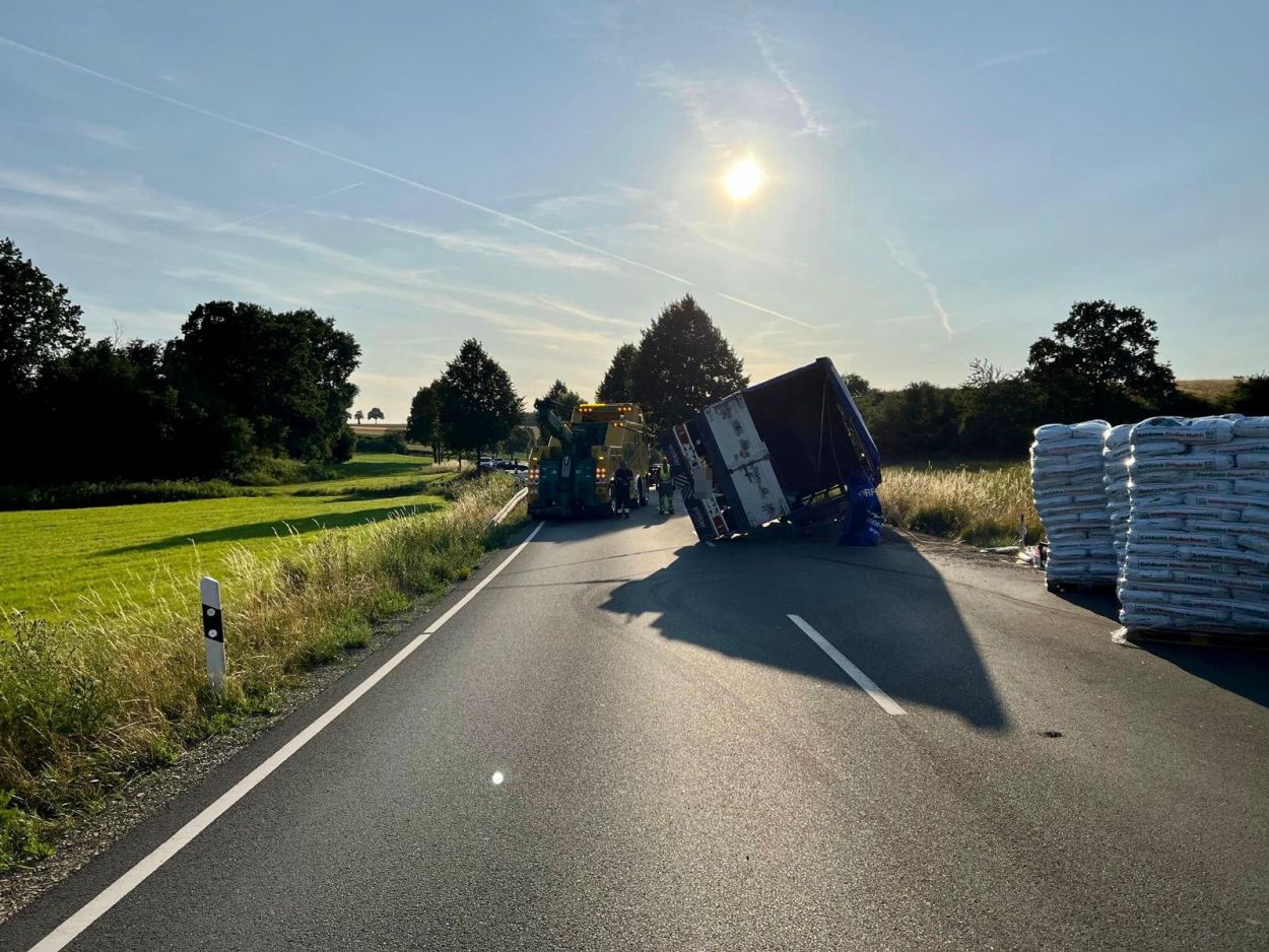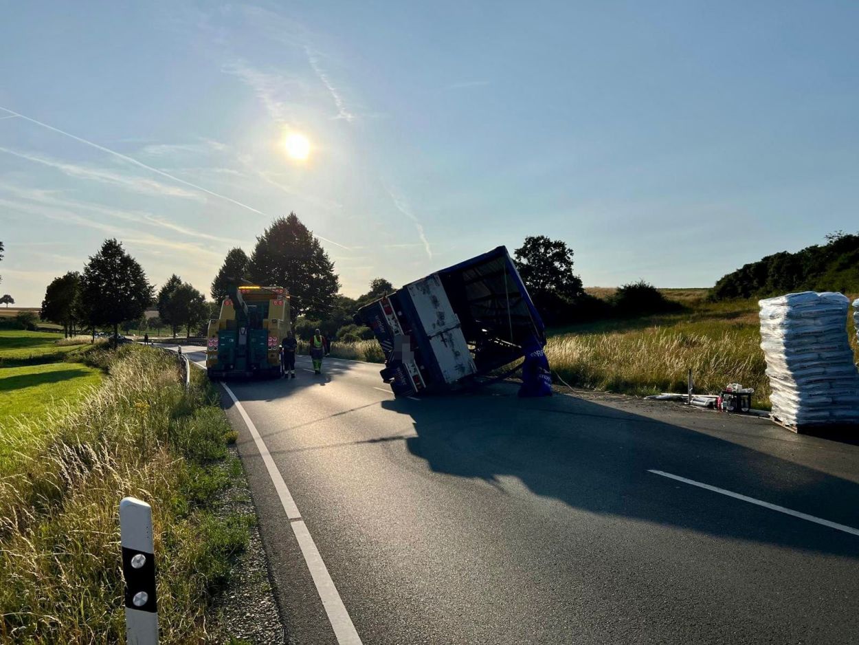 Wolfhagen – Am Montagnachmittag kam es auf der B450 zwischen Wolfhagen und Istha zu einem Verkehrsunfall mit einem LKW. Der 26 Jahre alte Fahrer eines Gliederzuges befuhr die Bundesstraße gegen 15 Uhr von Istha kommend in Fahrtrichtung Wolfhagen. In Höhe dem Pfaffental verlor der Fahrer die Kontrolle über seinen LKW, kam nach rechts in die Bankette ab, lenkte dagegen und dabei kippte der Anhänger mit 14 Paletten Rindenmulch um. Die Zugmaschine blieb auf der Fahrbahn stehen. Der Verkehr konnte einspurig an der Unfallstelle vorbeigeleitet werden. Beim Aufrichten des Anhängers war die Bundesstraße kurzfristig voll gesperrt. Die Bergungsarbeiten waren gegen 20.30 Uhr beendet.