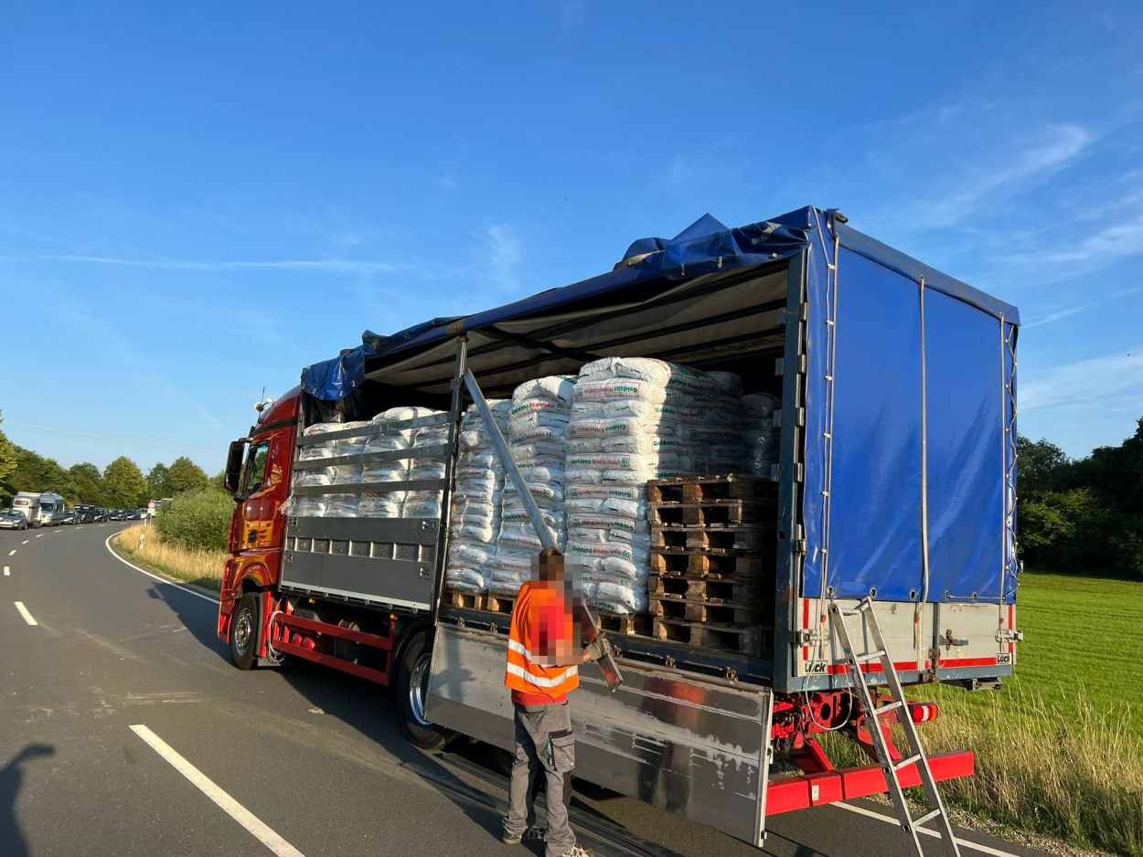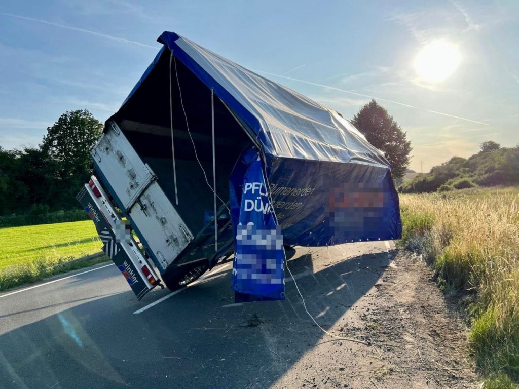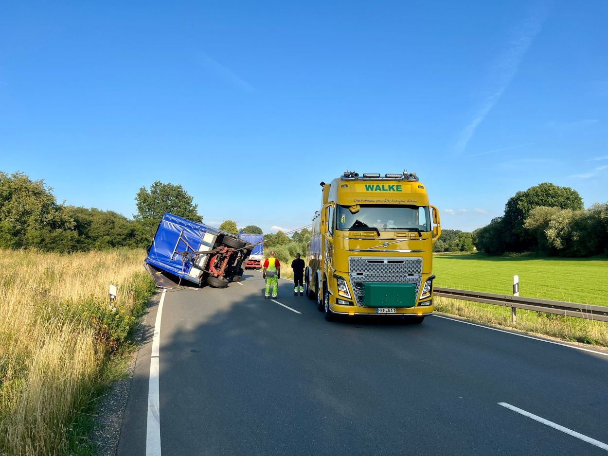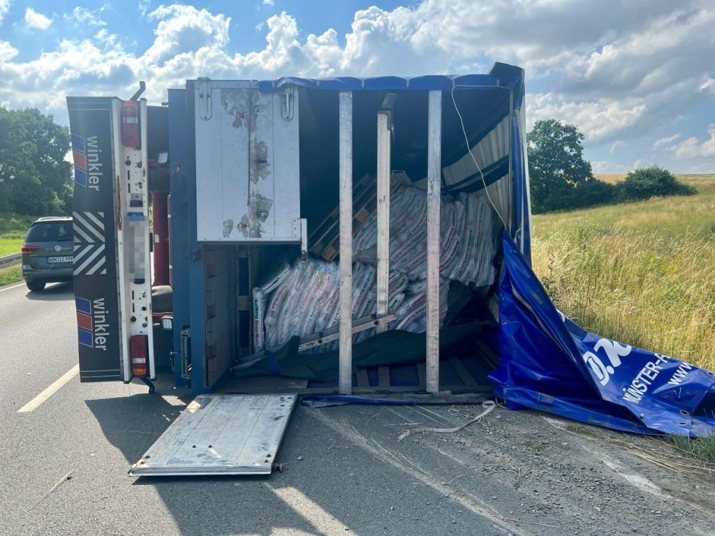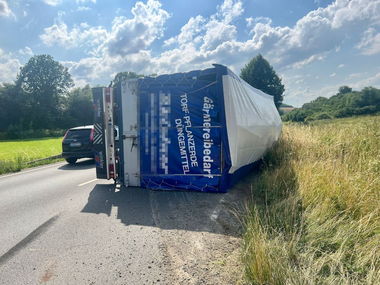 Wolfhagen – Am Montagnachmittag kam es auf der B450 zwischen Wolfhagen und Istha zu einem Verkehrsunfall mit einem LKW. Der 26 Jahre alte Fahrer eines Gliederzuges befuhr die Bundesstraße gegen 15 Uhr von Istha kommend in Fahrtrichtung Wolfhagen. In Höhe dem Pfaffental verlor der Fahrer die Kontrolle über seinen LKW, kam nach rechts in die Bankette ab, lenkte dagegen und dabei kippte der Anhänger mit 14 Paletten Rindenmulch um. Die Zugmaschine blieb auf der Fahrbahn stehen. Der Verkehr konnte einspurig an der Unfallstelle vorbeigeleitet werden. Beim Aufrichten des Anhängers war die Bundesstraße kurzfristig voll gesperrt. Die Bergungsarbeiten waren gegen 20.30 Uhr beendet.