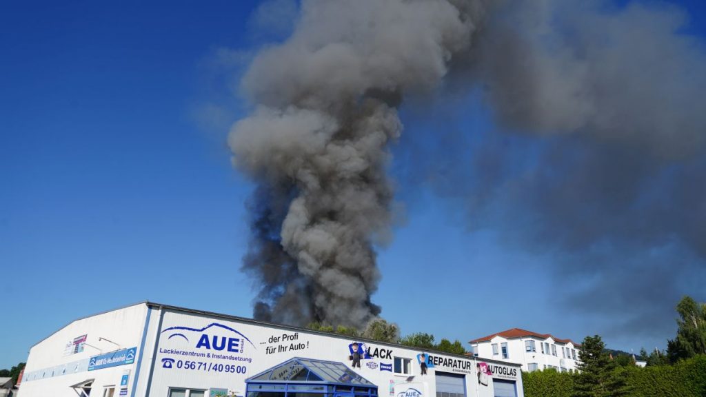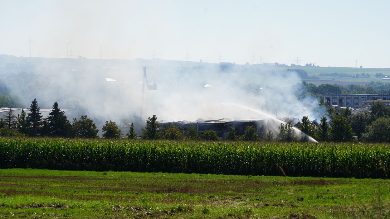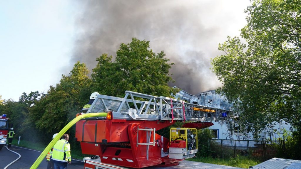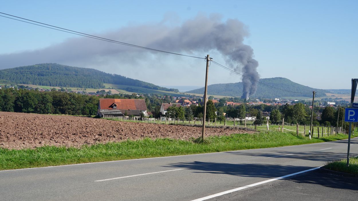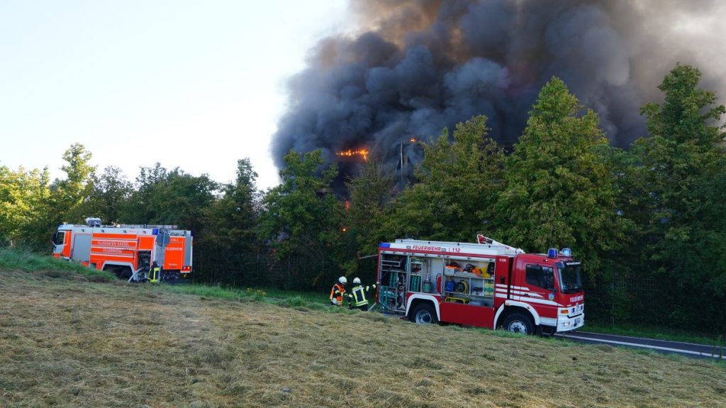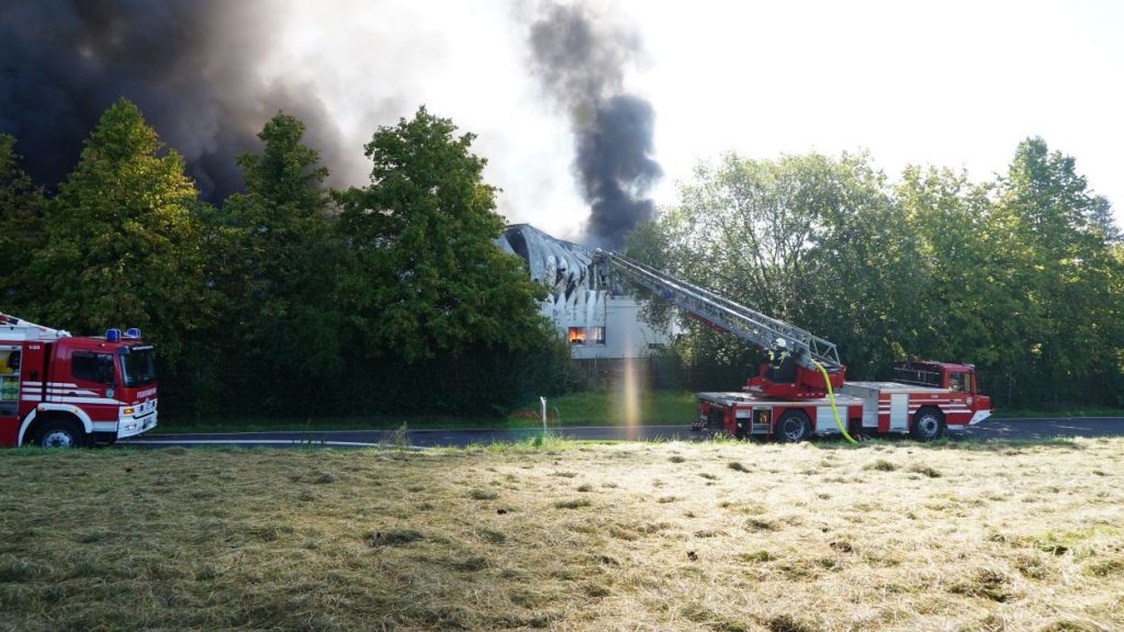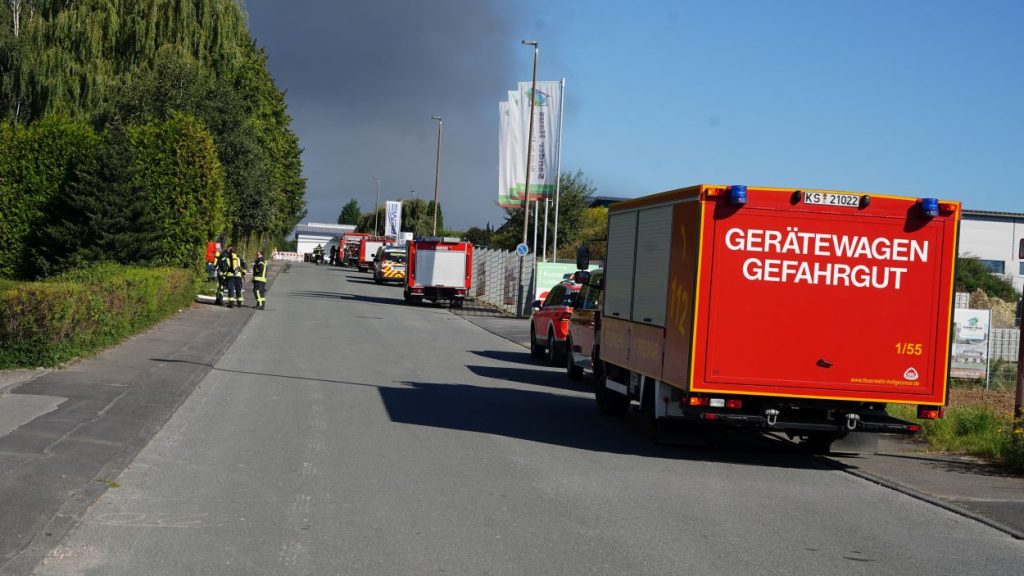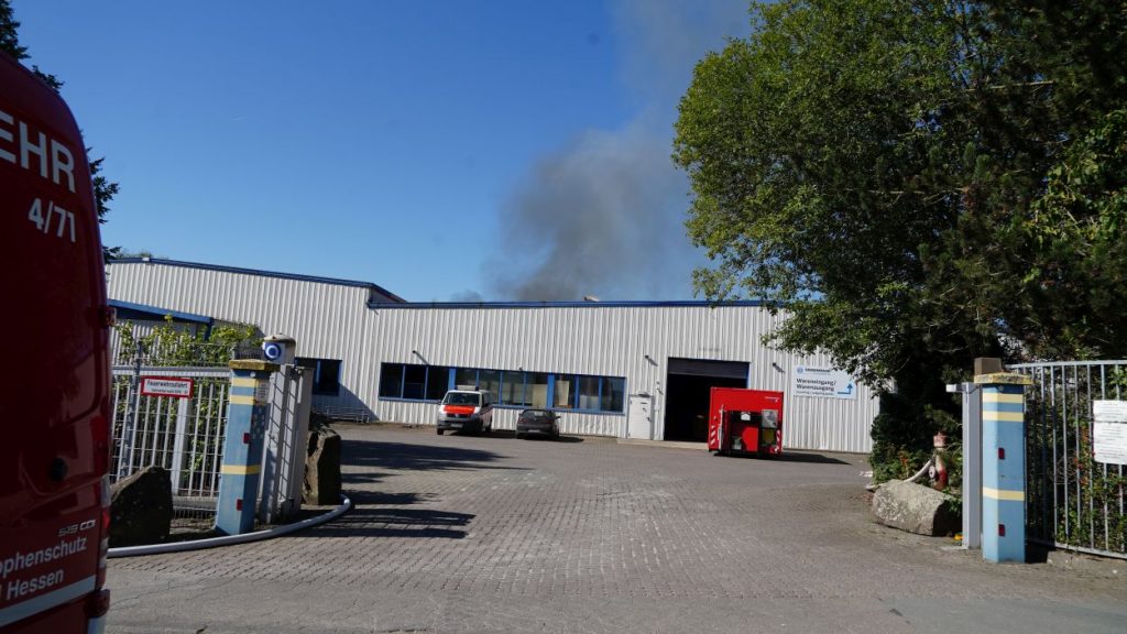 Hofgeismar – Zu einem Großbrand einer Lagerhalle kam es am Freitag gegen 09.30 Uhr im Hofgeismarer Industriegebiet. Bereits auf der Anfahrt konnten die Einsatzkräfte eine große schwarze Rauchsäule erkennen, die mehrere Kilometerweit sichtbar war. Beim Eintreffen der Rettungskräfte stand die Halle einer Antriebstechnik-Firma in Vollbrand. Die Feuerwehr baute eine Riegelstellung auf, um die Nachbarhallen vor den Flammen zu schützen. Das Gebäude besteht aus einer sogenannten Sandwich-Bausweise. Durch die thermische Einwirkung verformt sich der Stahl und das Gebäude, was die Löscharbeiten erschwert. Ein Bagger wurde angefordert, um die Platten von der Wand nehmen zu können, damit die Einsatzkräfte besser an die Glutnester kommen. Zu einer größeren Verpuffung kam es, als eine Acetylenflasche explodierte. Dabei sind auch Teile der Lagerhalle eingestürzt. Schadstoffmessungen wurden durchgeführt, um zu schauen, ob von der Rauchsäule, die in Richtung Hümme und Schöneberg zog, eine Gefahr bestand. Rund 120 Einsatzkräfte, darunter die Flughafenfeuerwehr mit einem GTLF/Flugfeldlöschfahrzeug und die Werkfeuerwehr Mercedes mit einem Gelenkmast waren im Einsatz. Die Löscharbeiten werden noch mehrere Stunden andauern. Verletzt wurde nach aktuellen Erkenntnissen niemand.