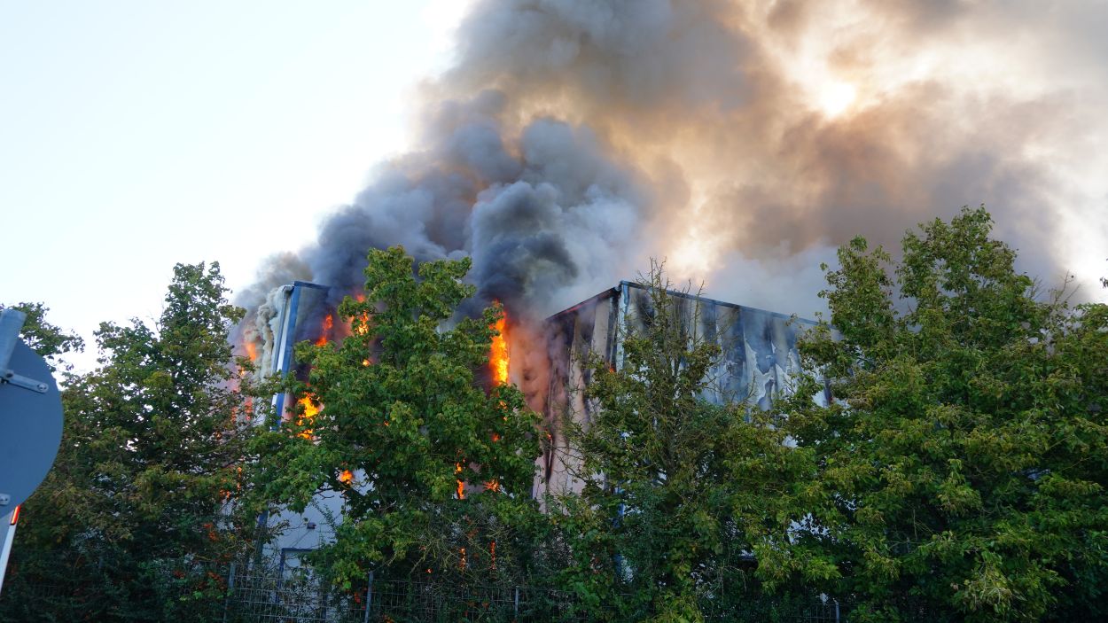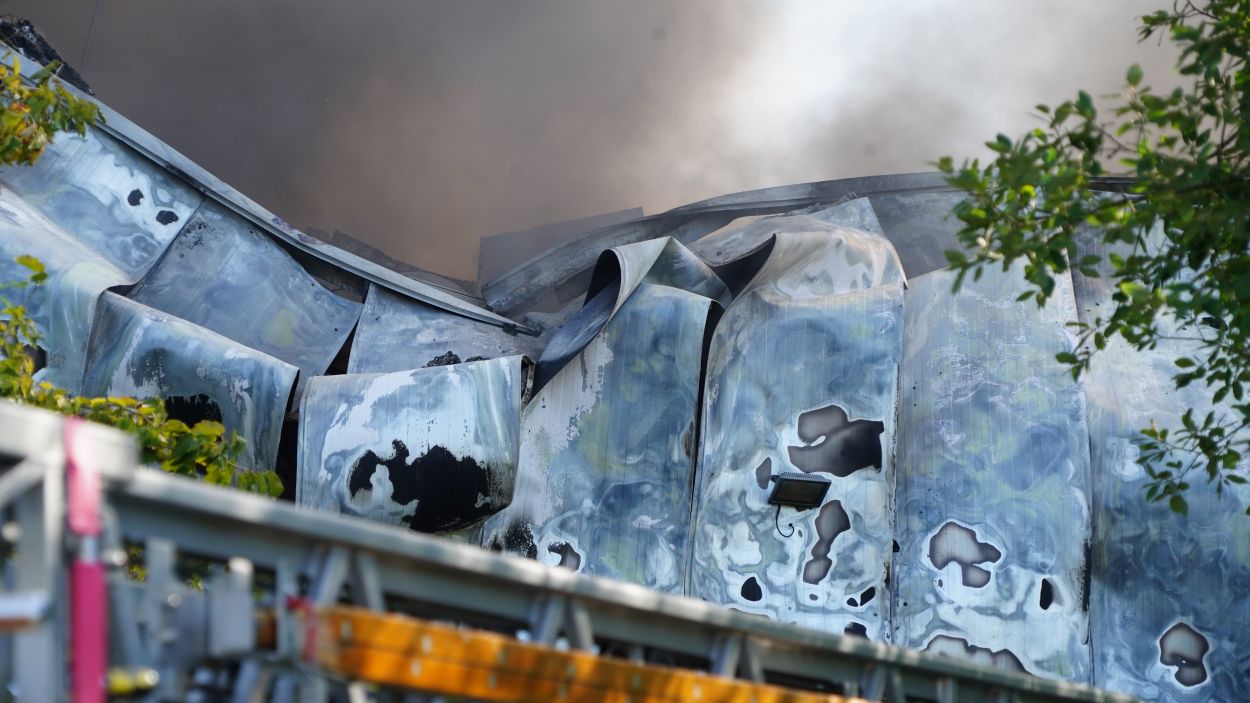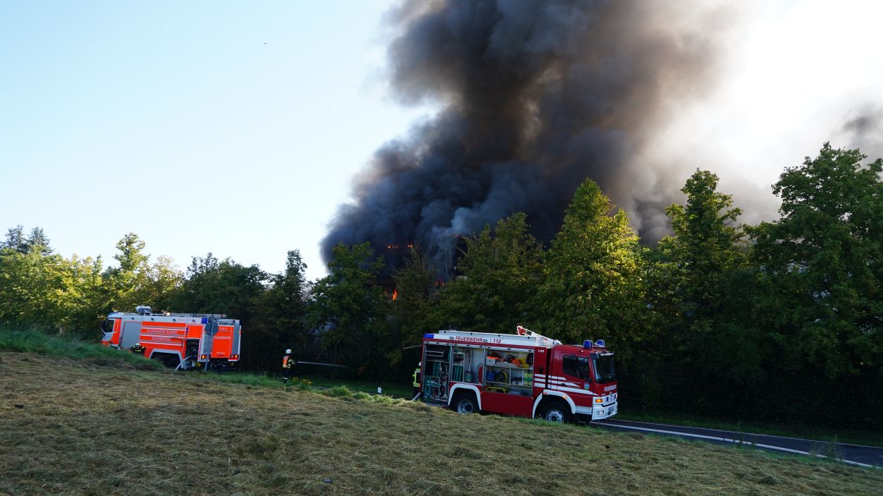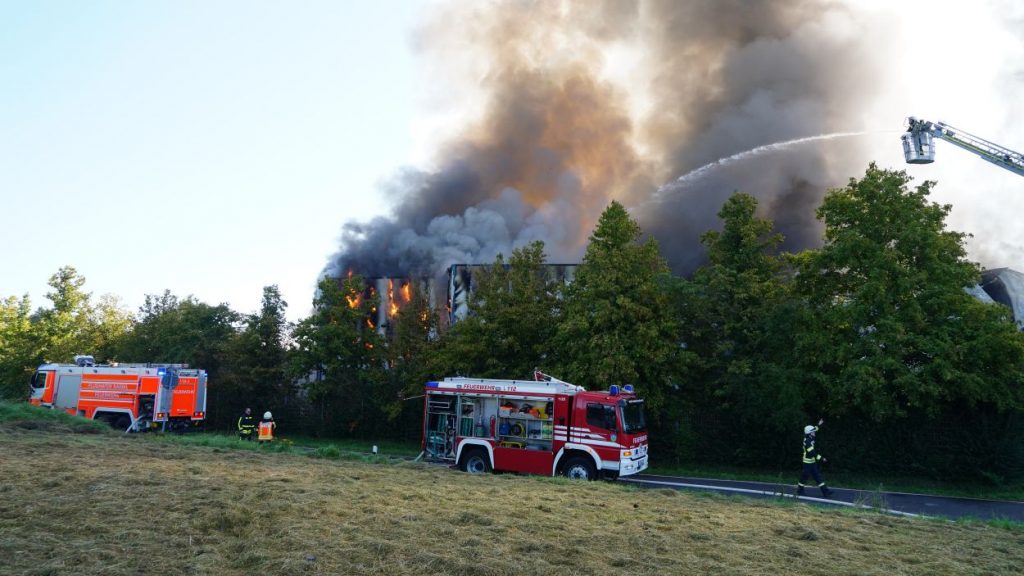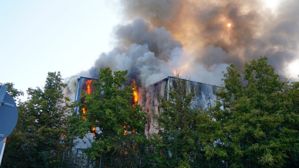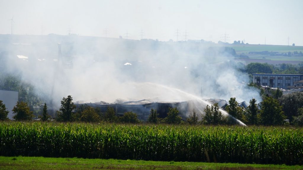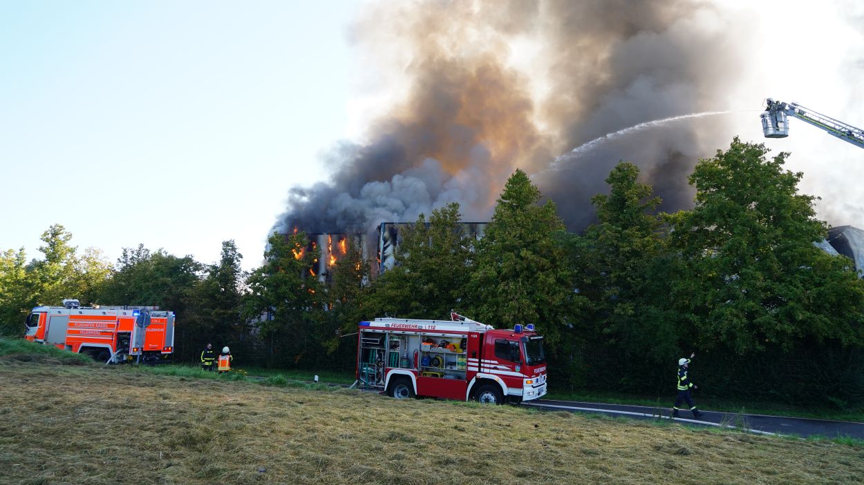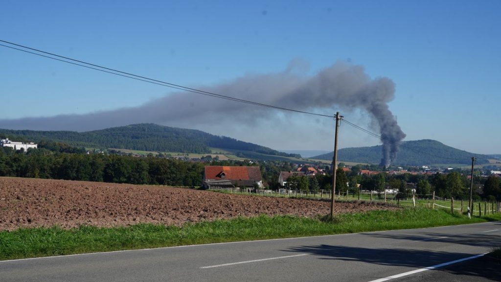 Hofgeismar – Zu einem Großbrand einer Lagerhalle kam es am Freitag gegen 09.30 Uhr im Hofgeismarer Industriegebiet. Bereits auf der Anfahrt konnten die Einsatzkräfte eine große schwarze Rauchsäule erkennen, die mehrere Kilometerweit sichtbar war. Beim Eintreffen der Rettungskräfte stand die Halle einer Antriebstechnik-Firma in Vollbrand. Die Feuerwehr baute eine Riegelstellung auf, um die Nachbarhallen vor den Flammen zu schützen. Das Gebäude besteht aus einer sogenannten Sandwich-Bausweise. Durch die thermische Einwirkung verformt sich der Stahl und das Gebäude, was die Löscharbeiten erschwert. Ein Bagger wurde angefordert, um die Platten von der Wand nehmen zu können, damit die Einsatzkräfte besser an die Glutnester kommen. Zu einer größeren Verpuffung kam es, als eine Acetylenflasche explodierte. Dabei sind auch Teile der Lagerhalle eingestürzt. Schadstoffmessungen wurden durchgeführt, um zu schauen, ob von der Rauchsäule, die in Richtung Hümme und Schöneberg zog, eine Gefahr bestand. Rund 120 Einsatzkräfte, darunter die Flughafenfeuerwehr mit einem GTLF/Flugfeldlöschfahrzeug und die Werkfeuerwehr Mercedes mit einem Gelenkmast waren im Einsatz. Die Löscharbeiten werden noch mehrere Stunden andauern. Verletzt wurde nach aktuellen Erkenntnissen niemand.