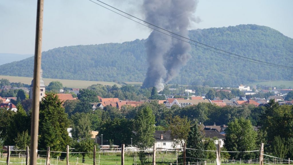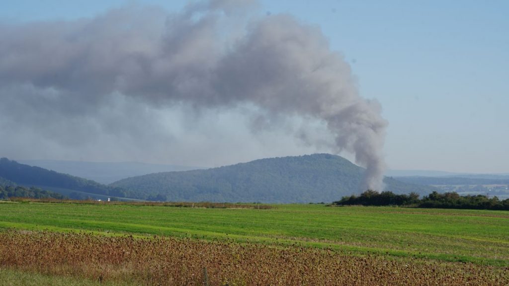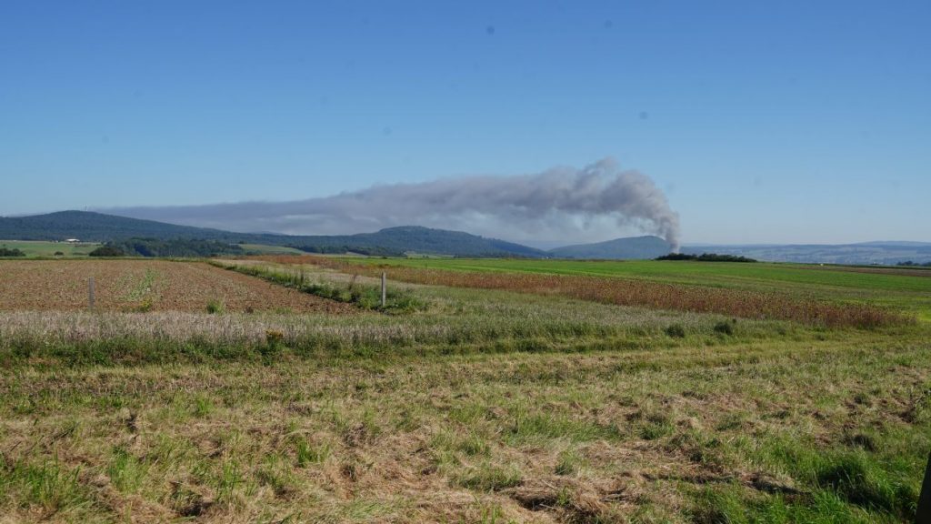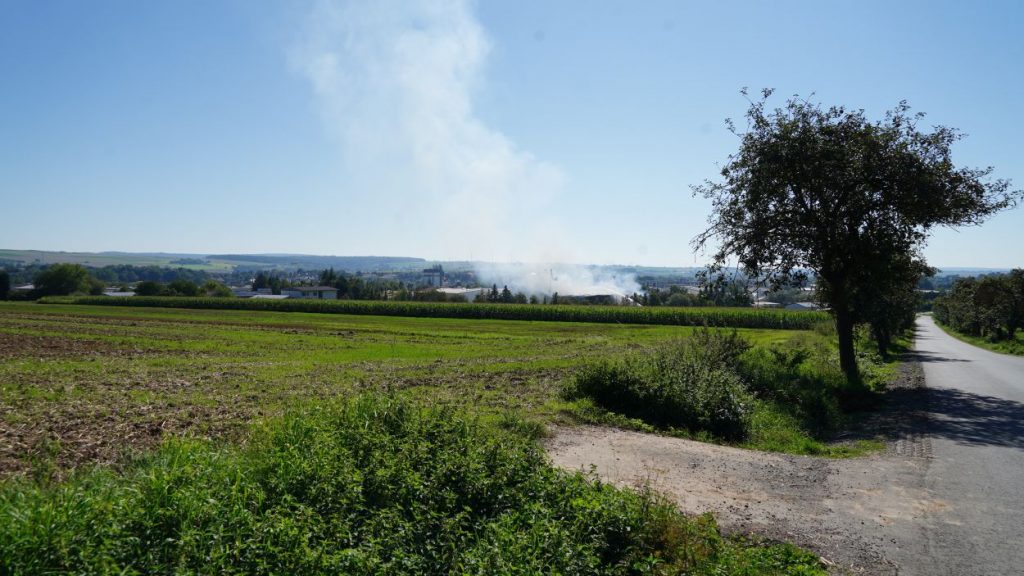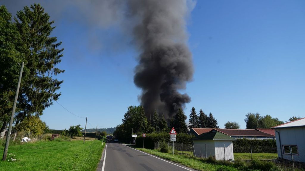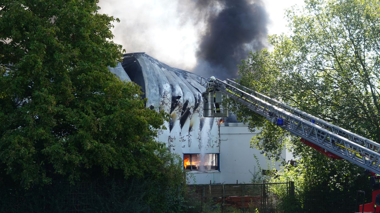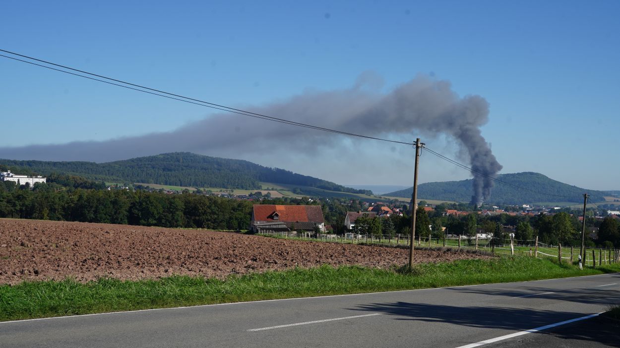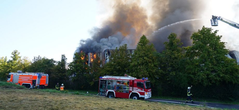 Hofgeismar – Zu einem Großbrand einer Lagerhalle kam es am Freitag gegen 09.30 Uhr im Hofgeismarer Industriegebiet. Bereits auf der Anfahrt konnten die Einsatzkräfte eine große schwarze Rauchsäule erkennen, die mehrere Kilometerweit sichtbar war. Beim Eintreffen der Rettungskräfte stand die Halle einer Antriebstechnik-Firma in Vollbrand. Die Feuerwehr baute eine Riegelstellung auf, um die Nachbarhallen vor den Flammen zu schützen. Das Gebäude besteht aus einer sogenannten Sandwich-Bausweise. Durch die thermische Einwirkung verformt sich der Stahl und das Gebäude, was die Löscharbeiten erschwert. Ein Bagger wurde angefordert, um die Platten von der Wand nehmen zu können, damit die Einsatzkräfte besser an die Glutnester kommen. Zu einer größeren Verpuffung kam es, als eine Acetylenflasche explodierte. Dabei sind auch Teile der Lagerhalle eingestürzt. Schadstoffmessungen wurden durchgeführt, um zu schauen, ob von der Rauchsäule, die in Richtung Hümme und Schöneberg zog, eine Gefahr bestand. Rund 120 Einsatzkräfte, darunter die Flughafenfeuerwehr mit einem GTLF/Flugfeldlöschfahrzeug und die Werkfeuerwehr Mercedes mit einem Gelenkmast waren im Einsatz. Die Löscharbeiten werden noch mehrere Stunden andauern. Verletzt wurde nach aktuellen Erkenntnissen niemand.